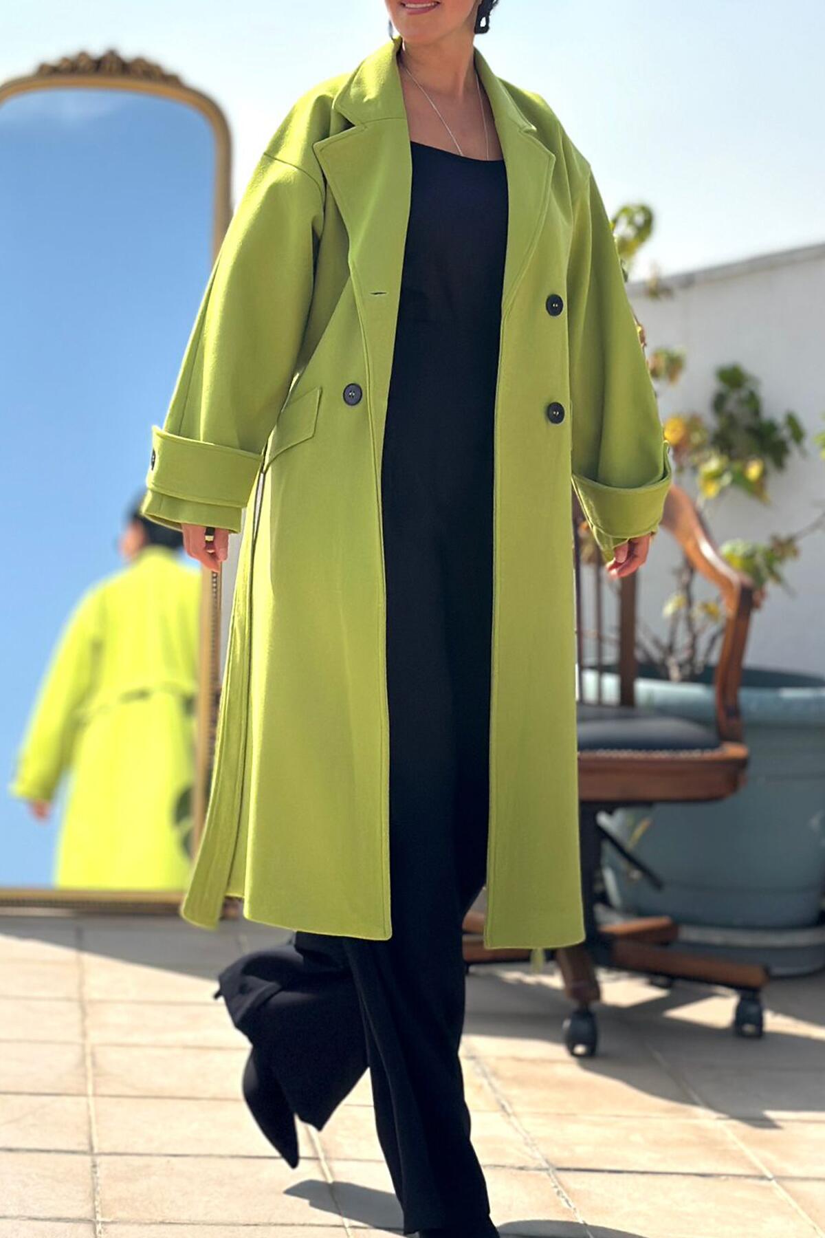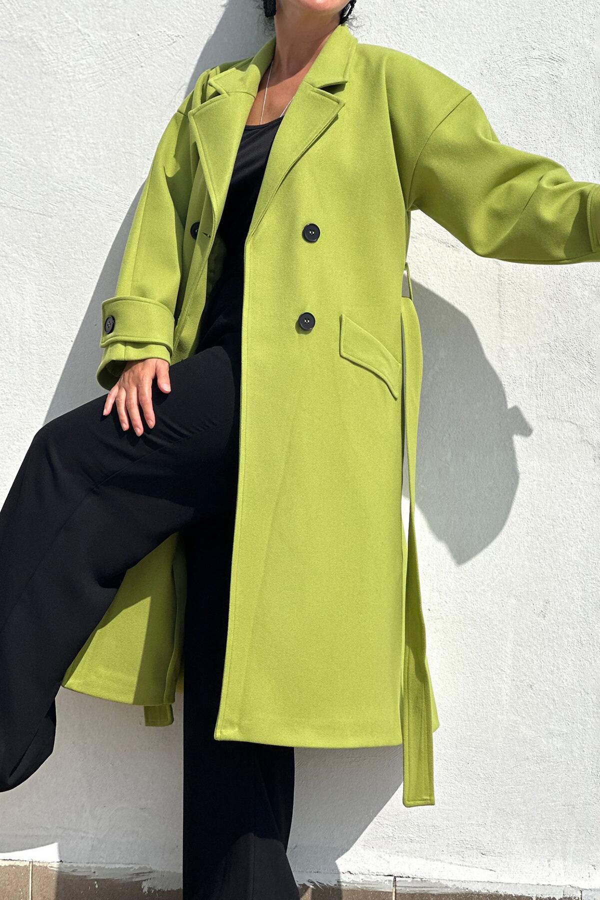 Kadın Bel Kuşaklı Düğmeli Kaban Yeşil