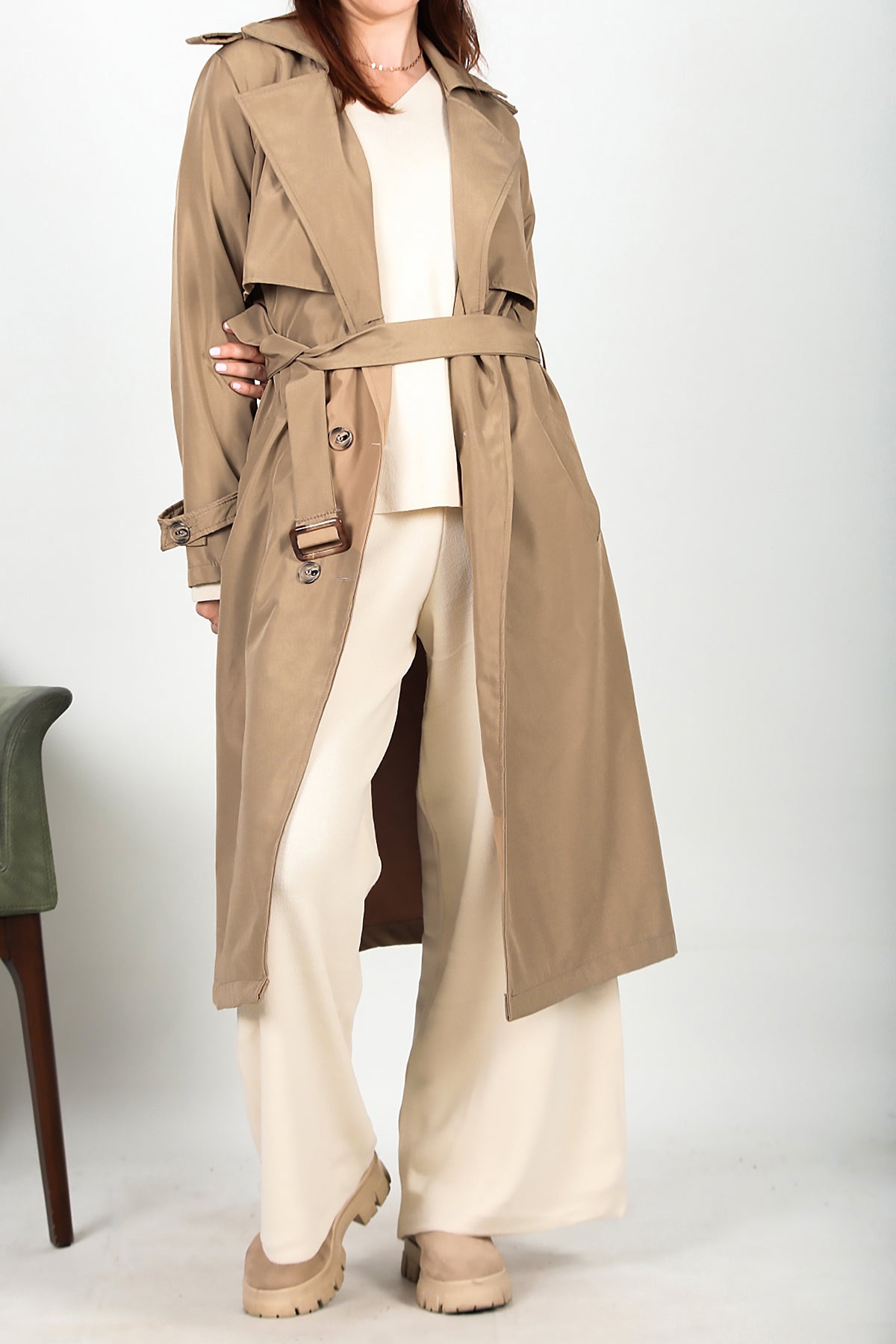 Kadın Bel Kuşaklı Düğmeli Trençkot Bej Bej