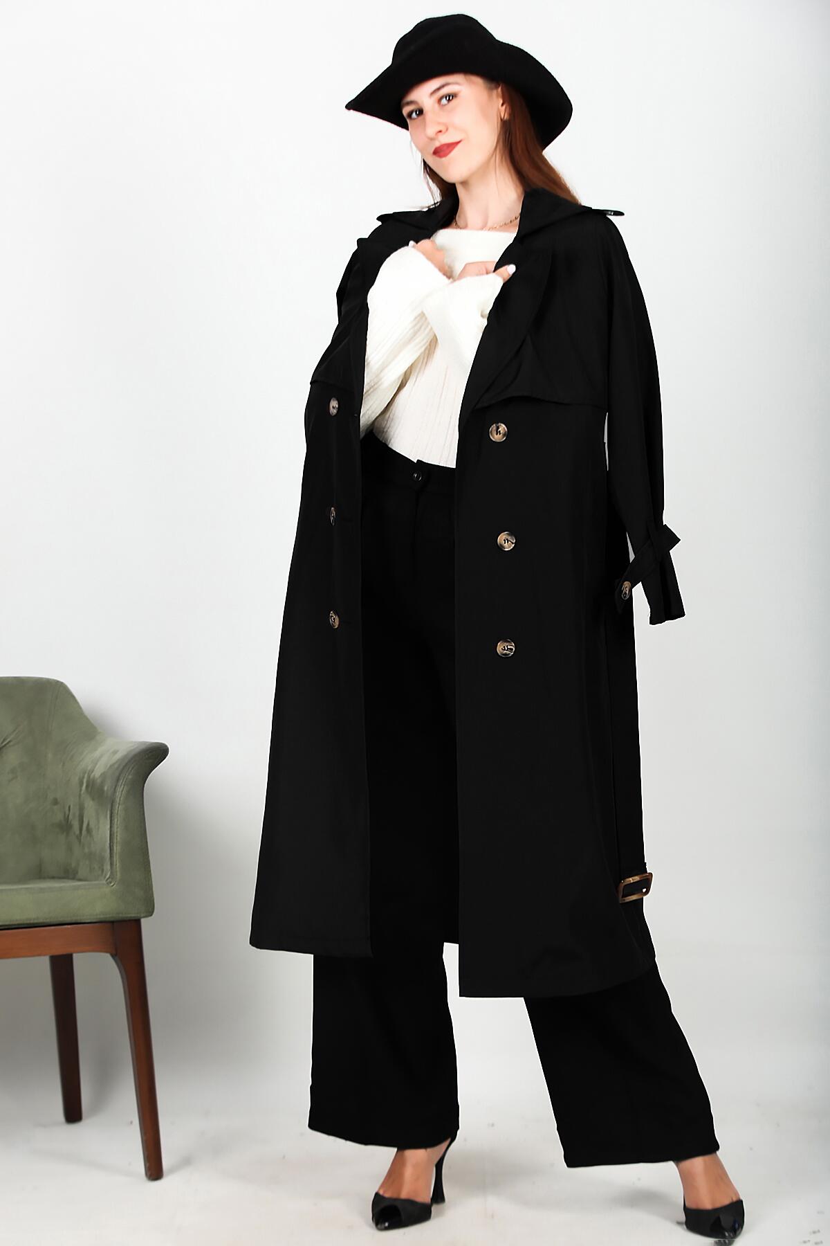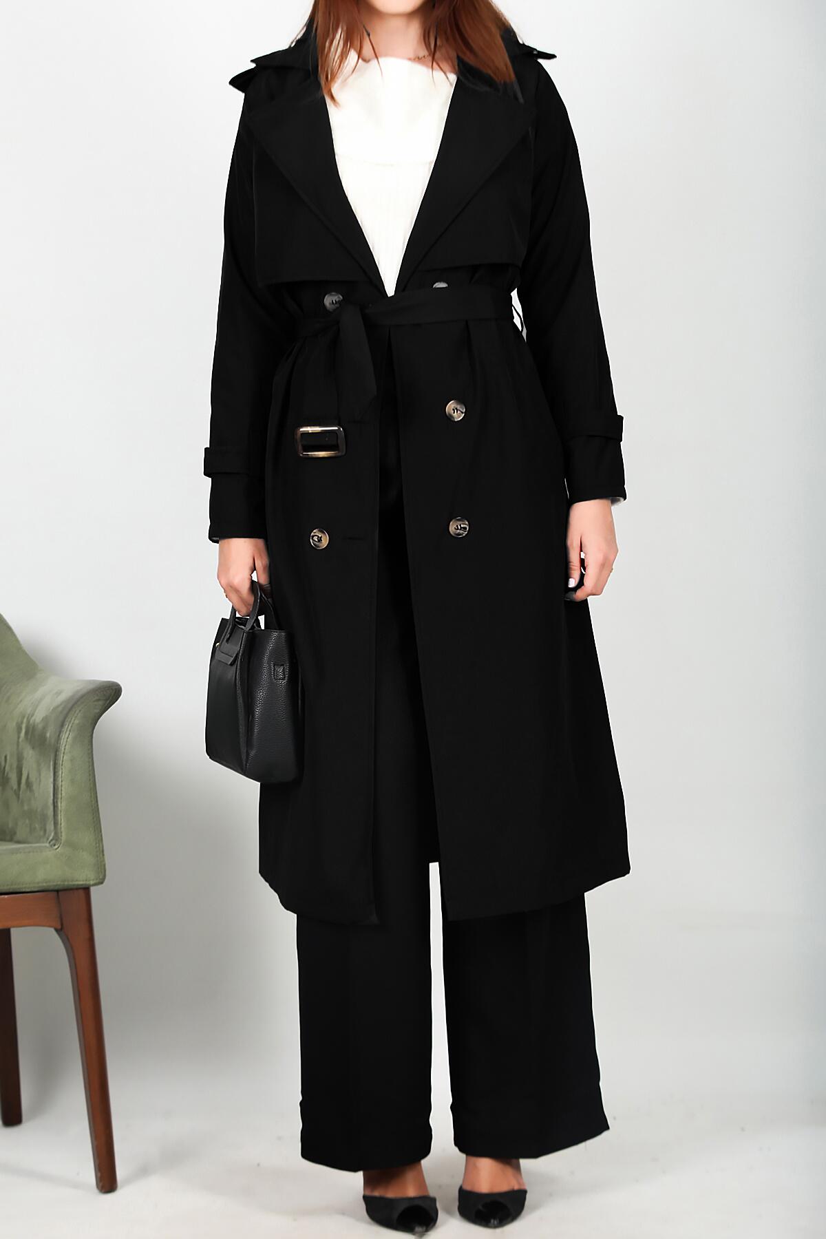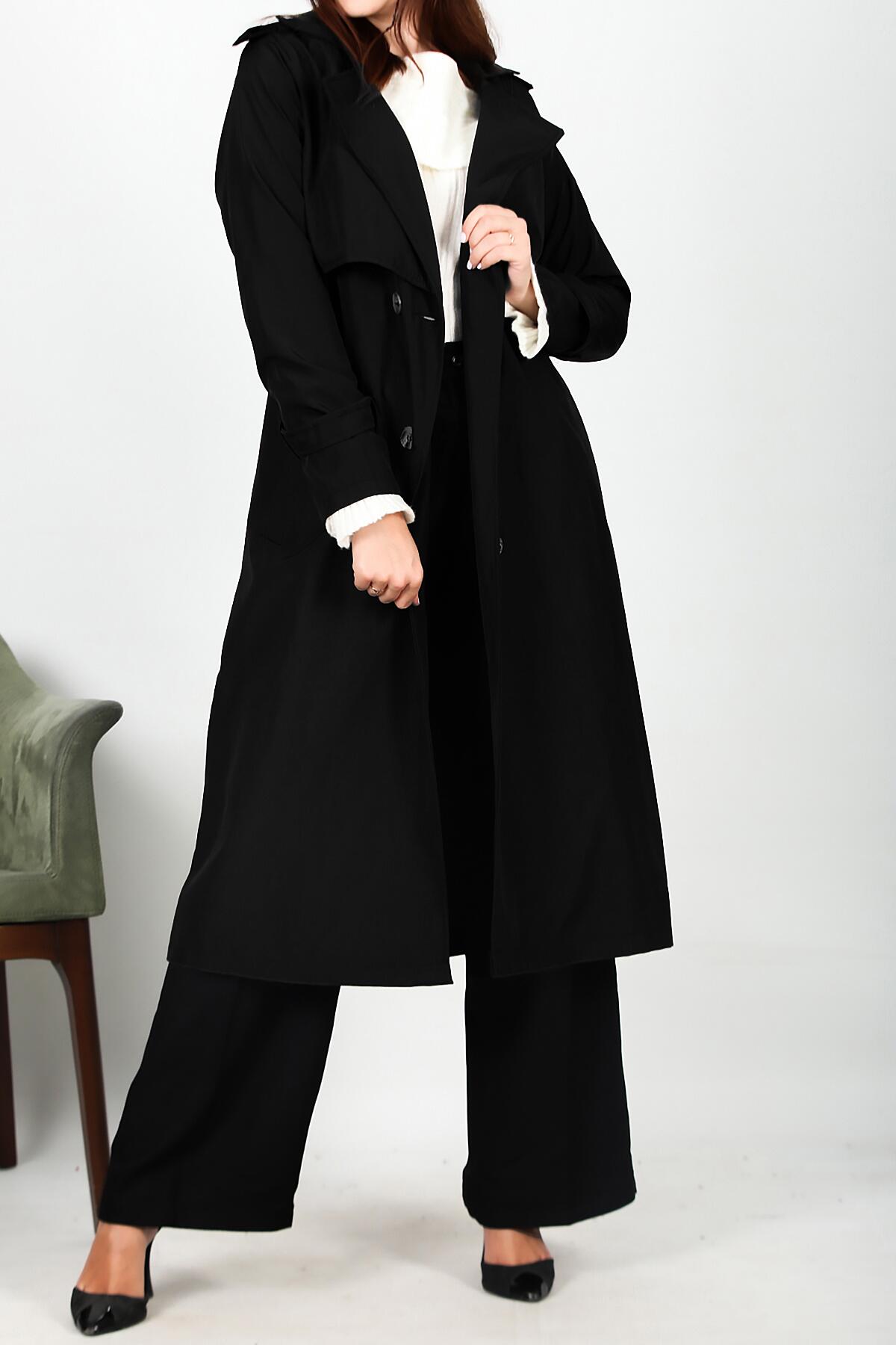 Kadın Bel Kuşaklı Düğmeli Trençkot Siyah