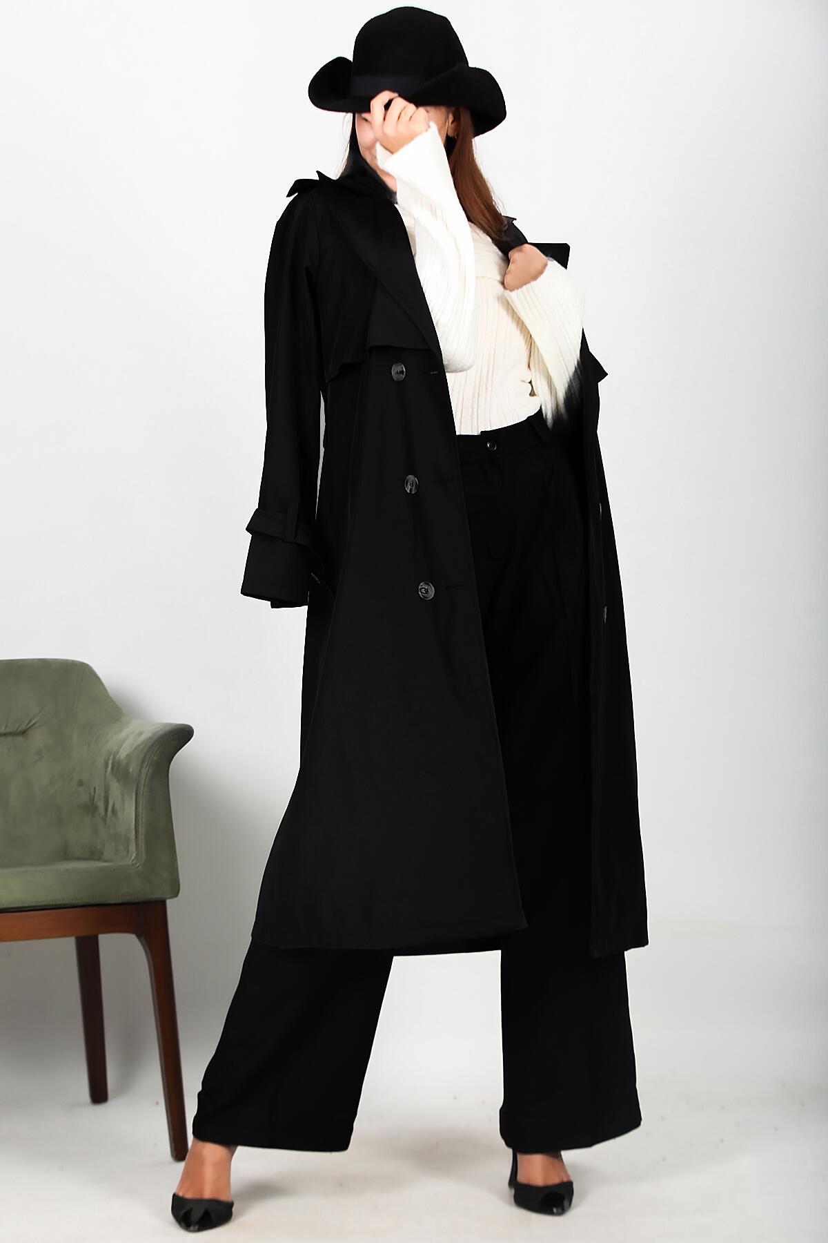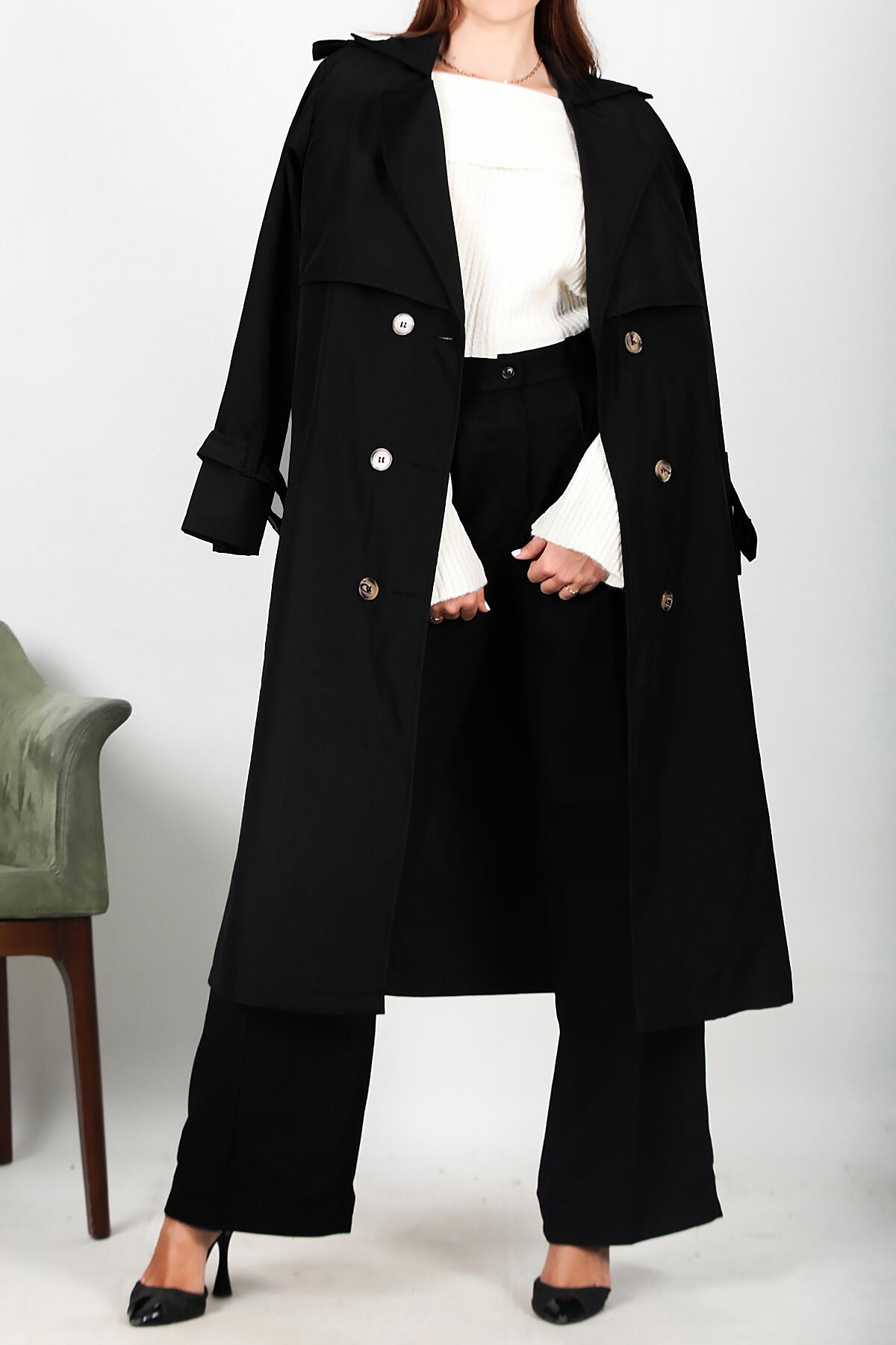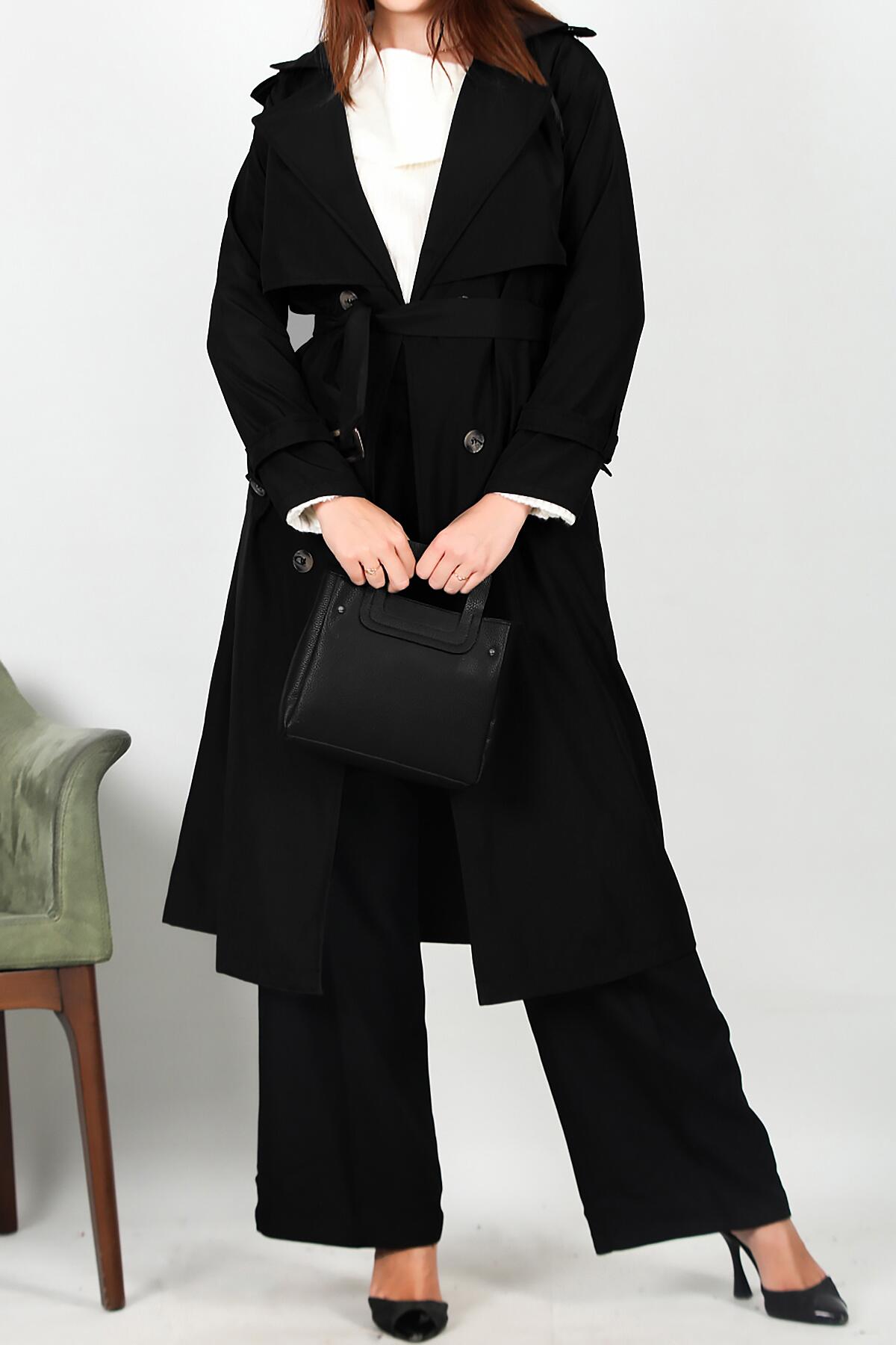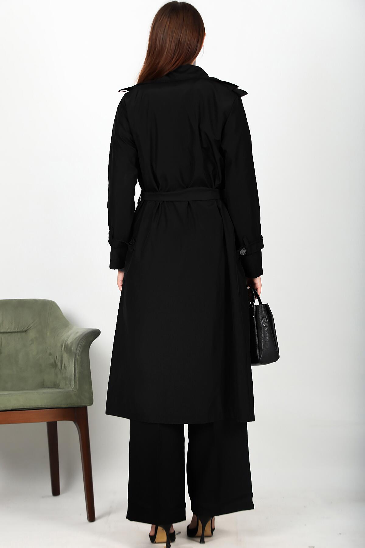 Kadın Bel Kuşaklı Düğmeli Trençkot Siyah