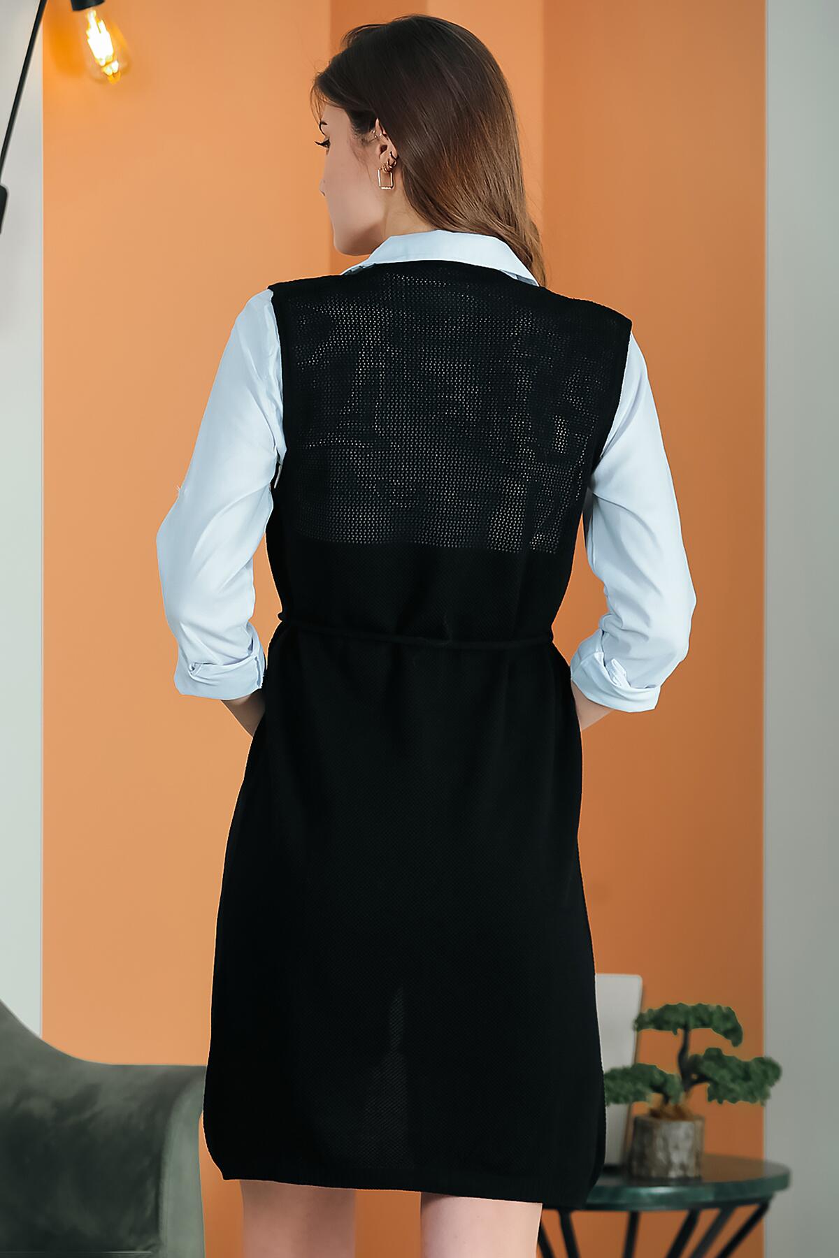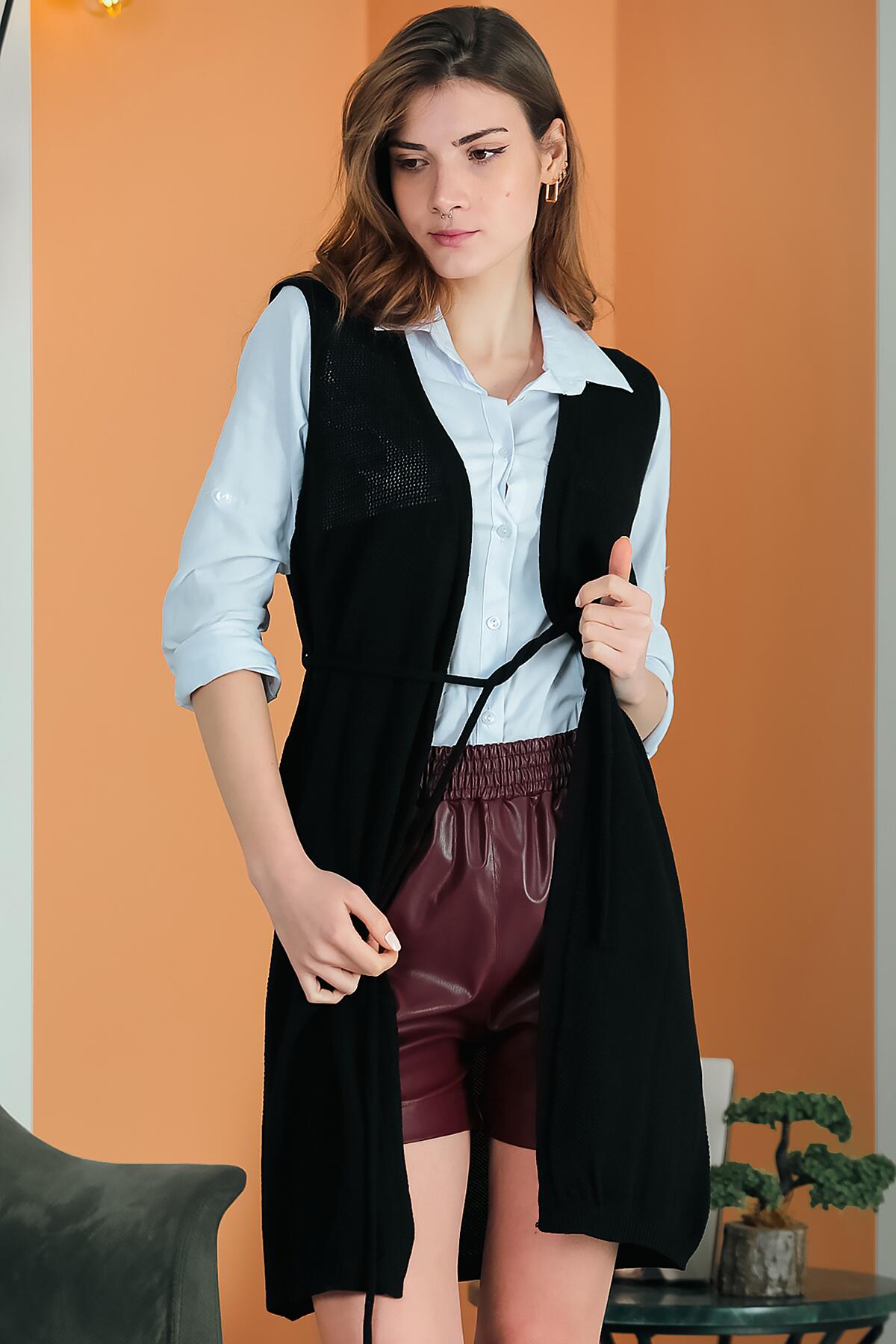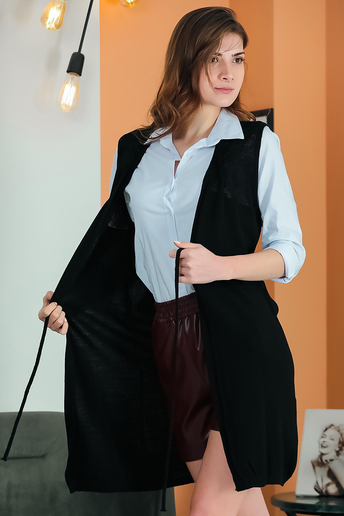 Kadın Bel Kuşaklı Uzun Yelek Siyah
