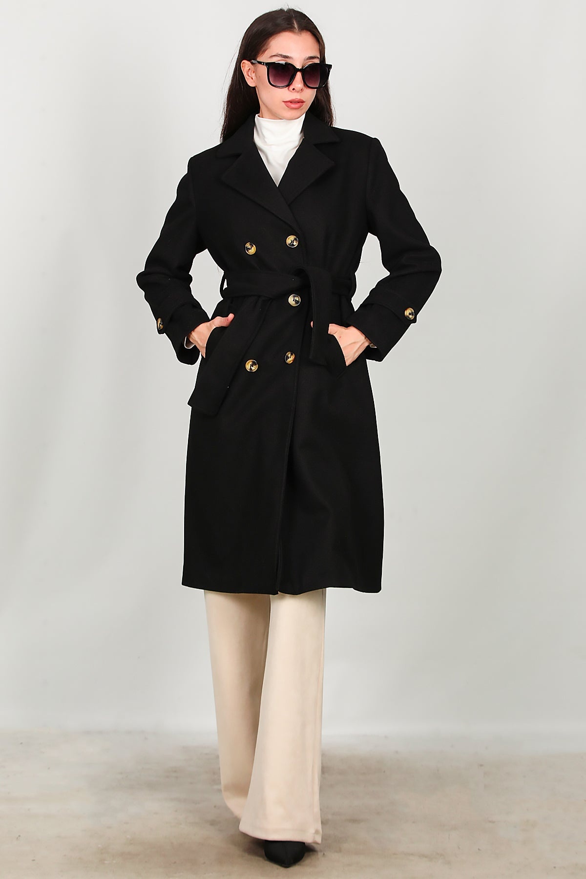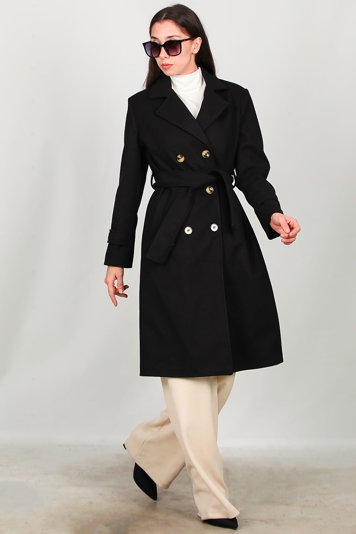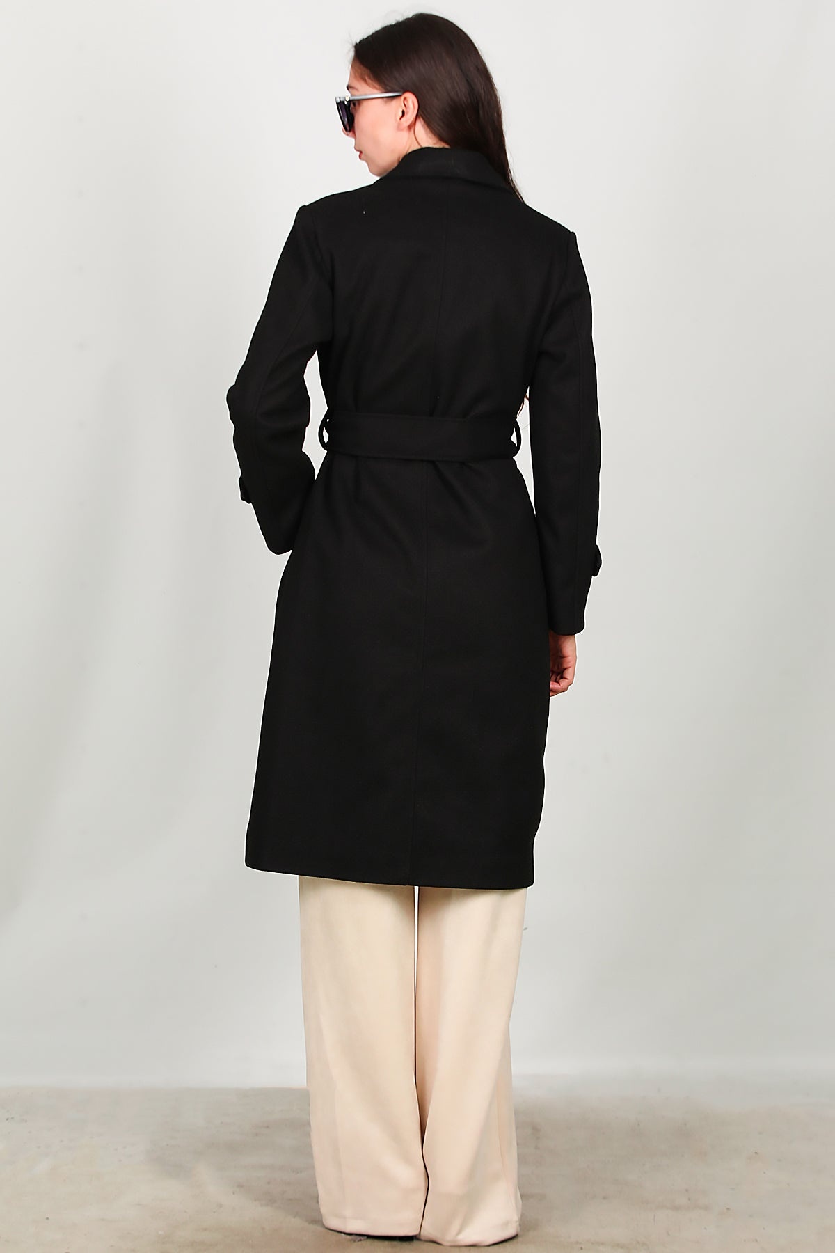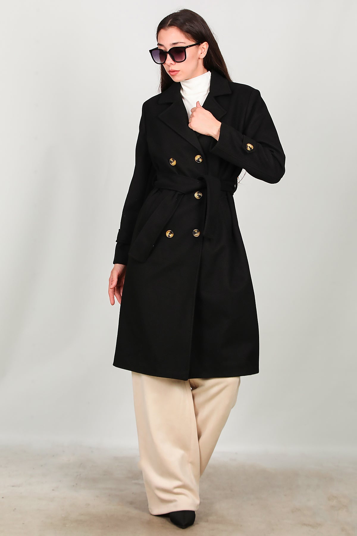 Kadın Beli Kuşaklı Kaşe Kaban Siyah