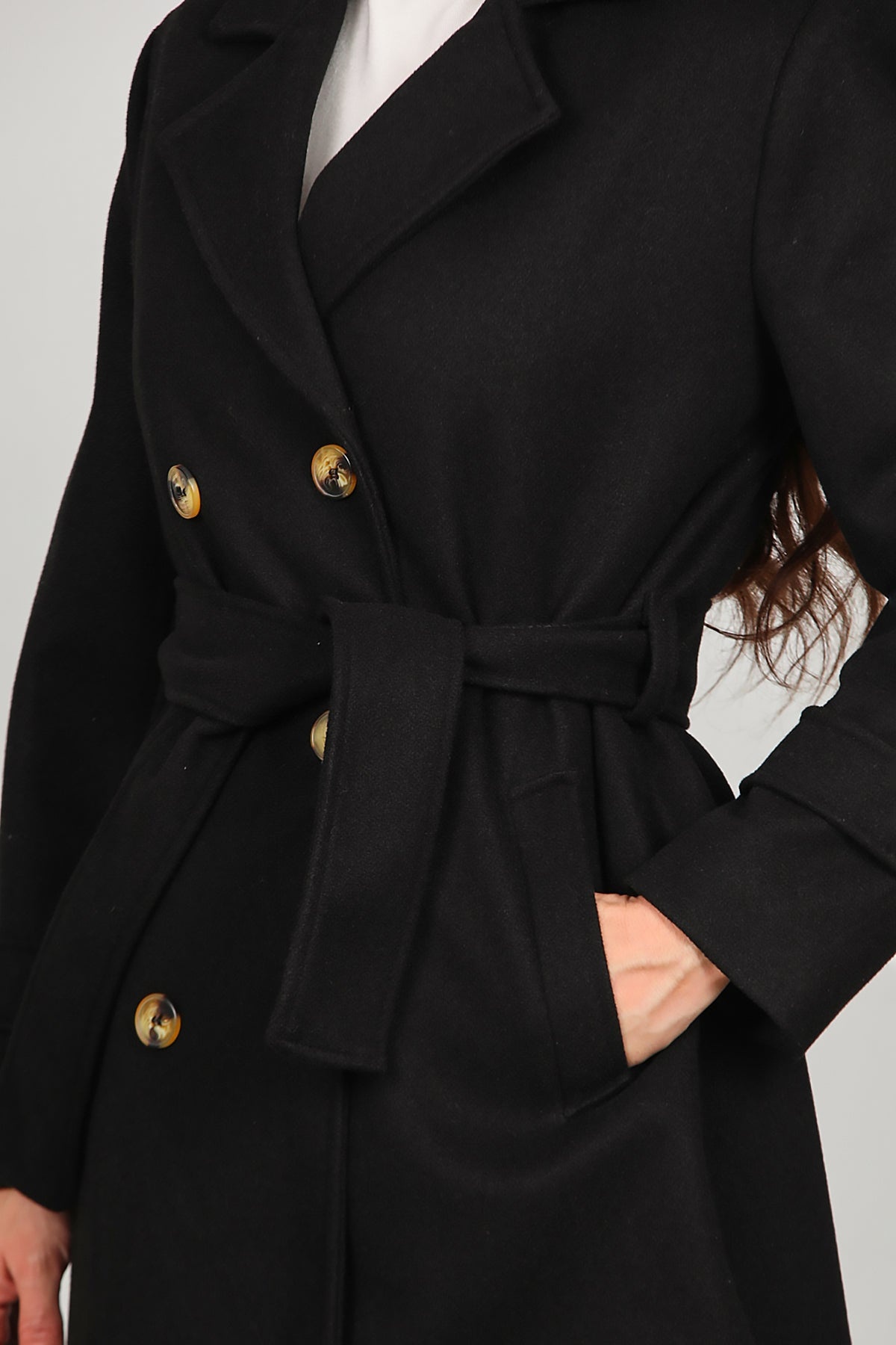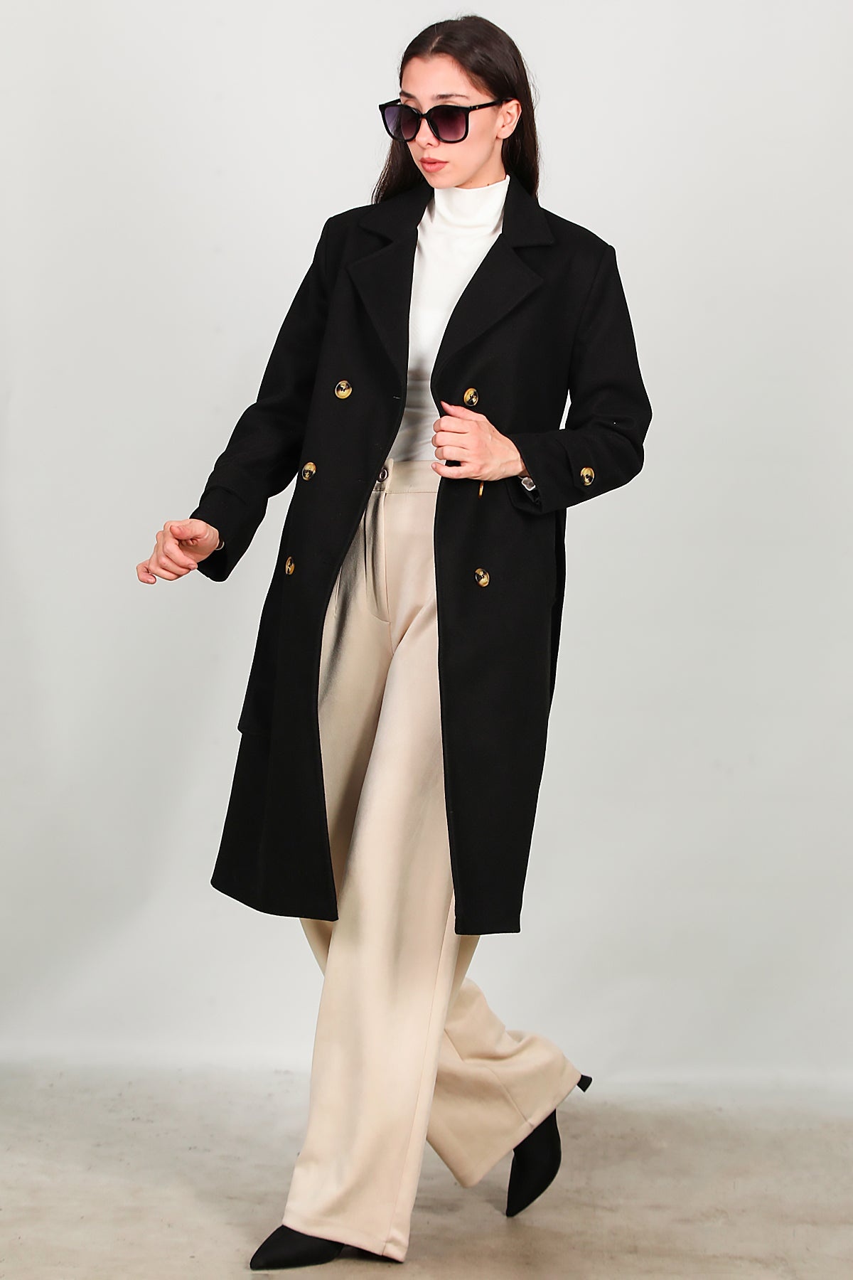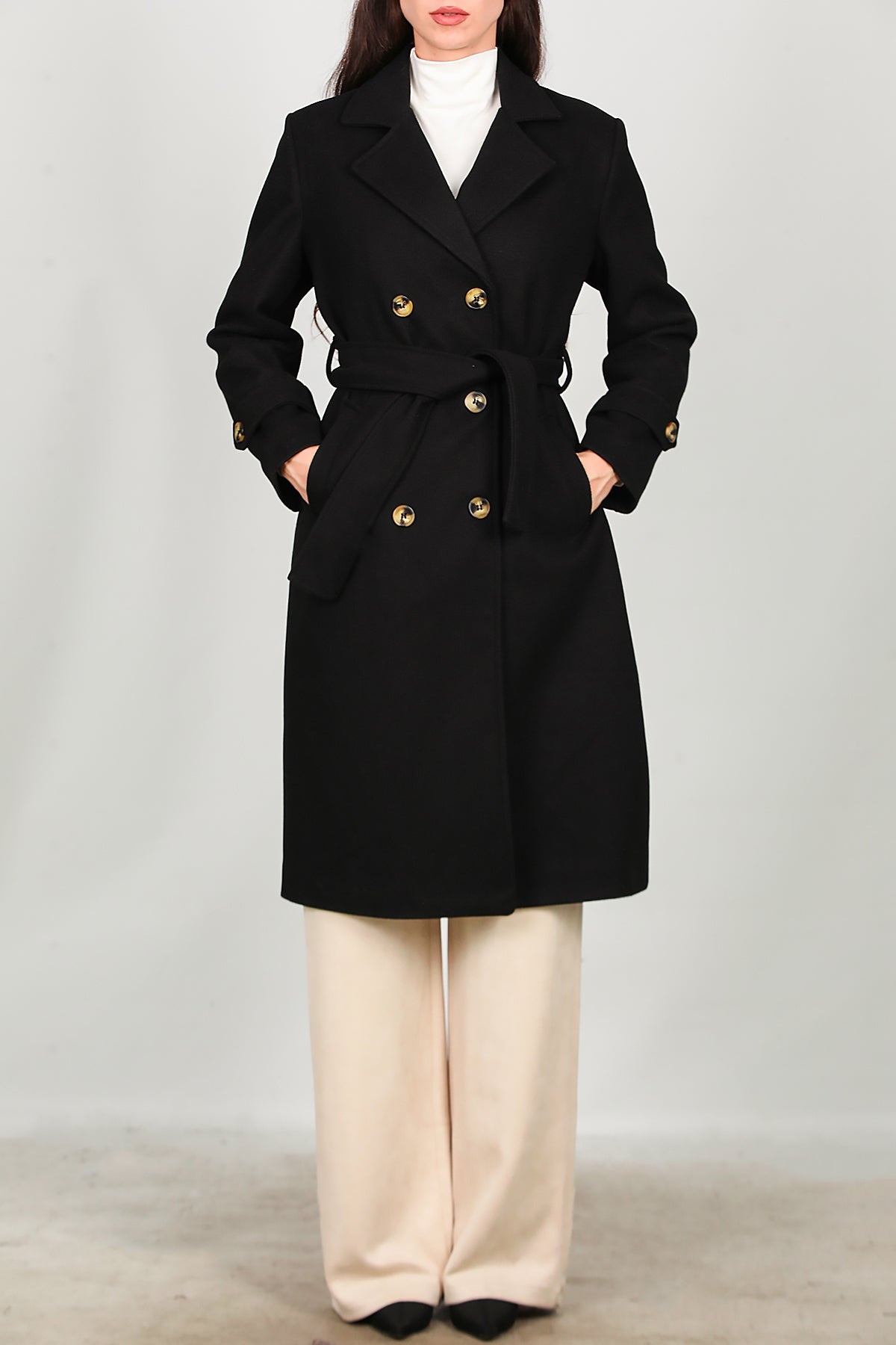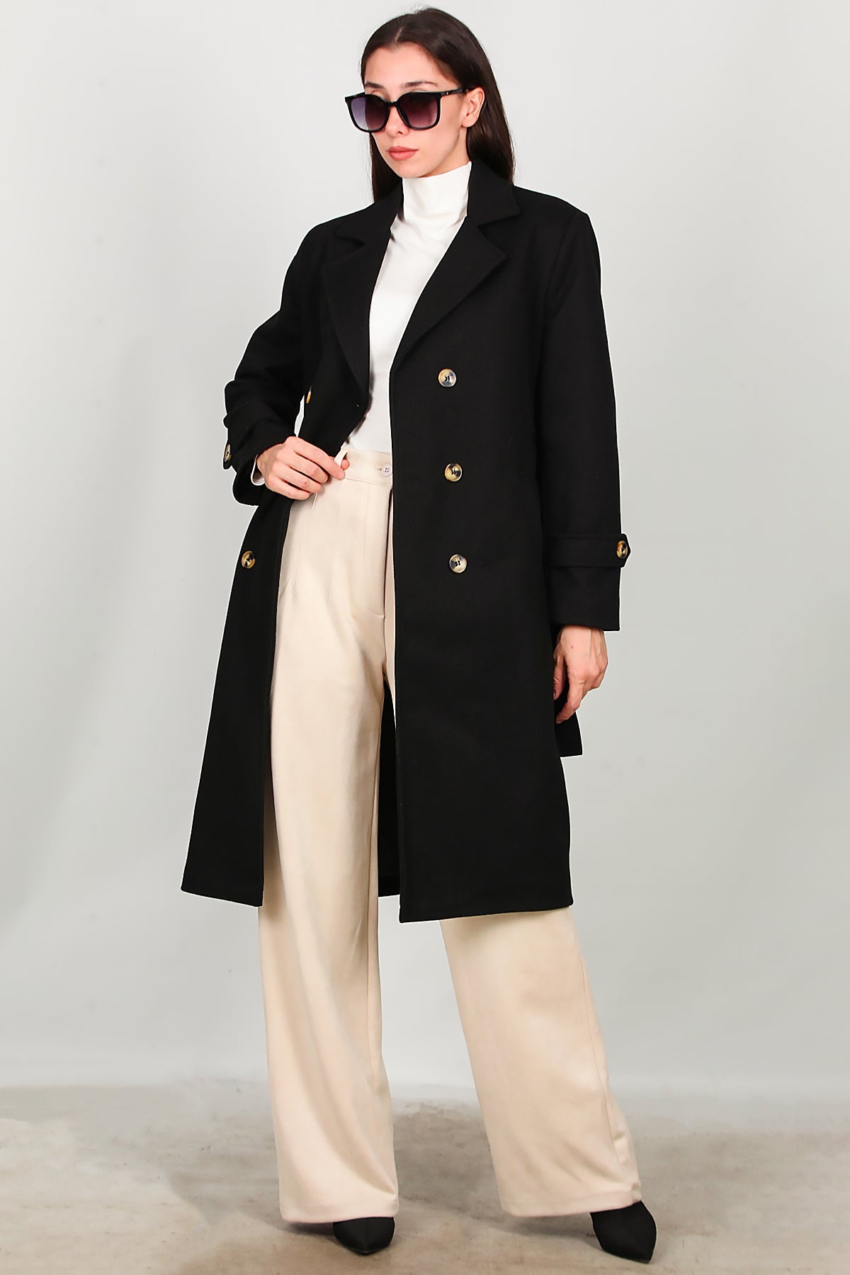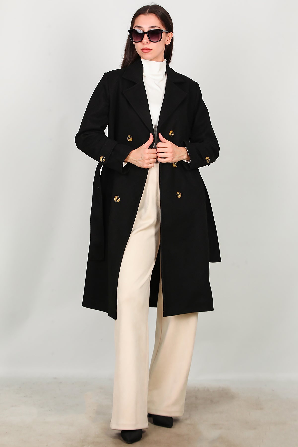 Kadın Beli Kuşaklı Kaşe Kaban Siyah
