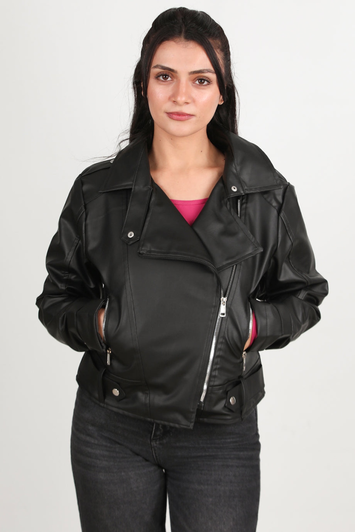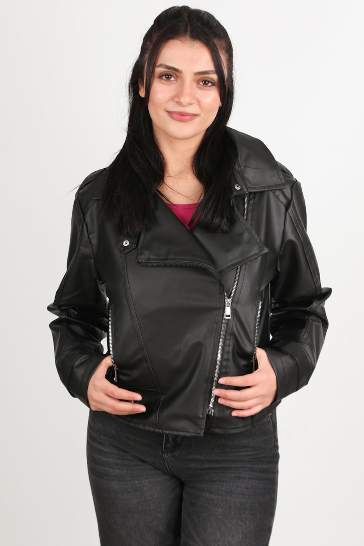 Kadın Çapraz Fermuarlı Deri Ceket Siyah