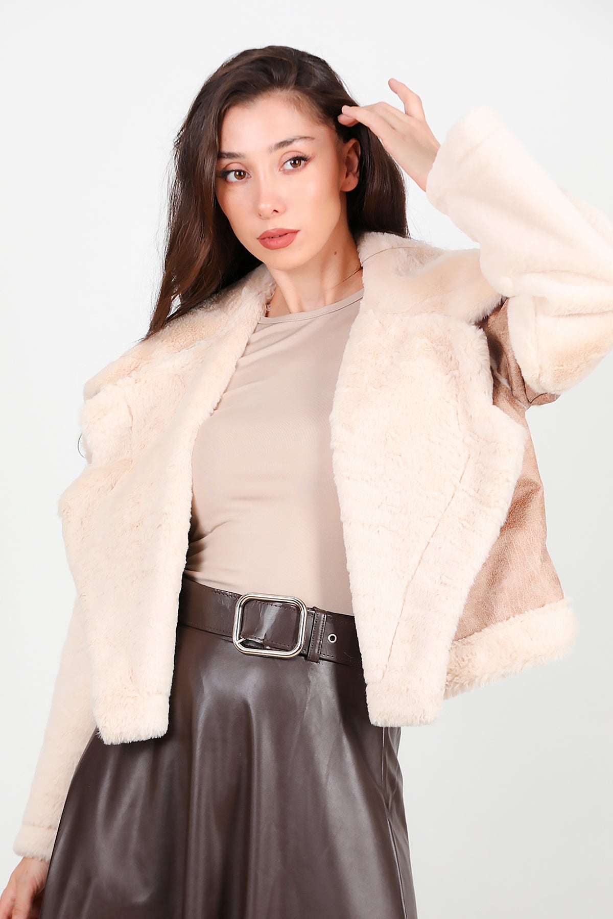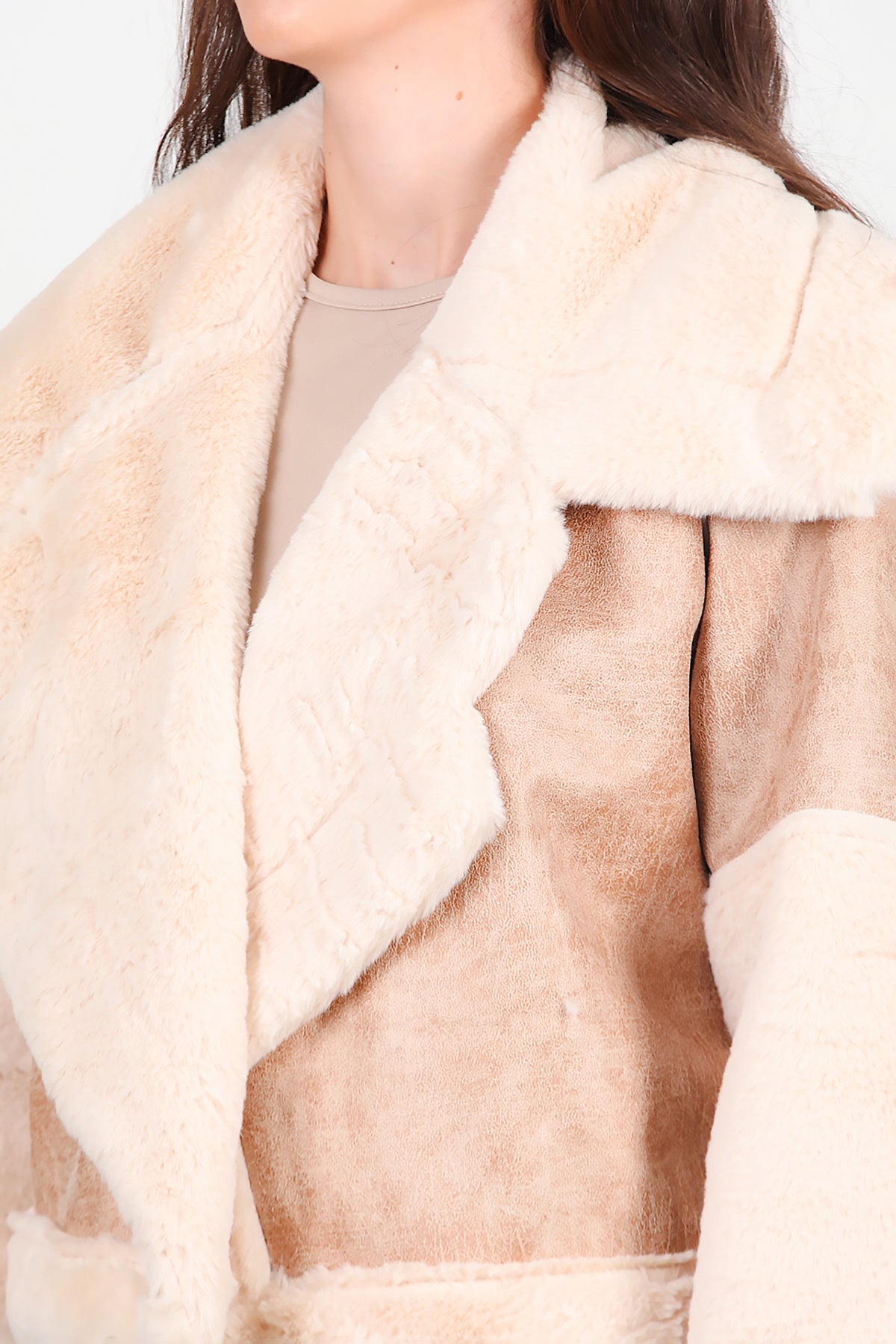 Kadın Geniş Yaka Kolu Peluş Süet Mont Bej