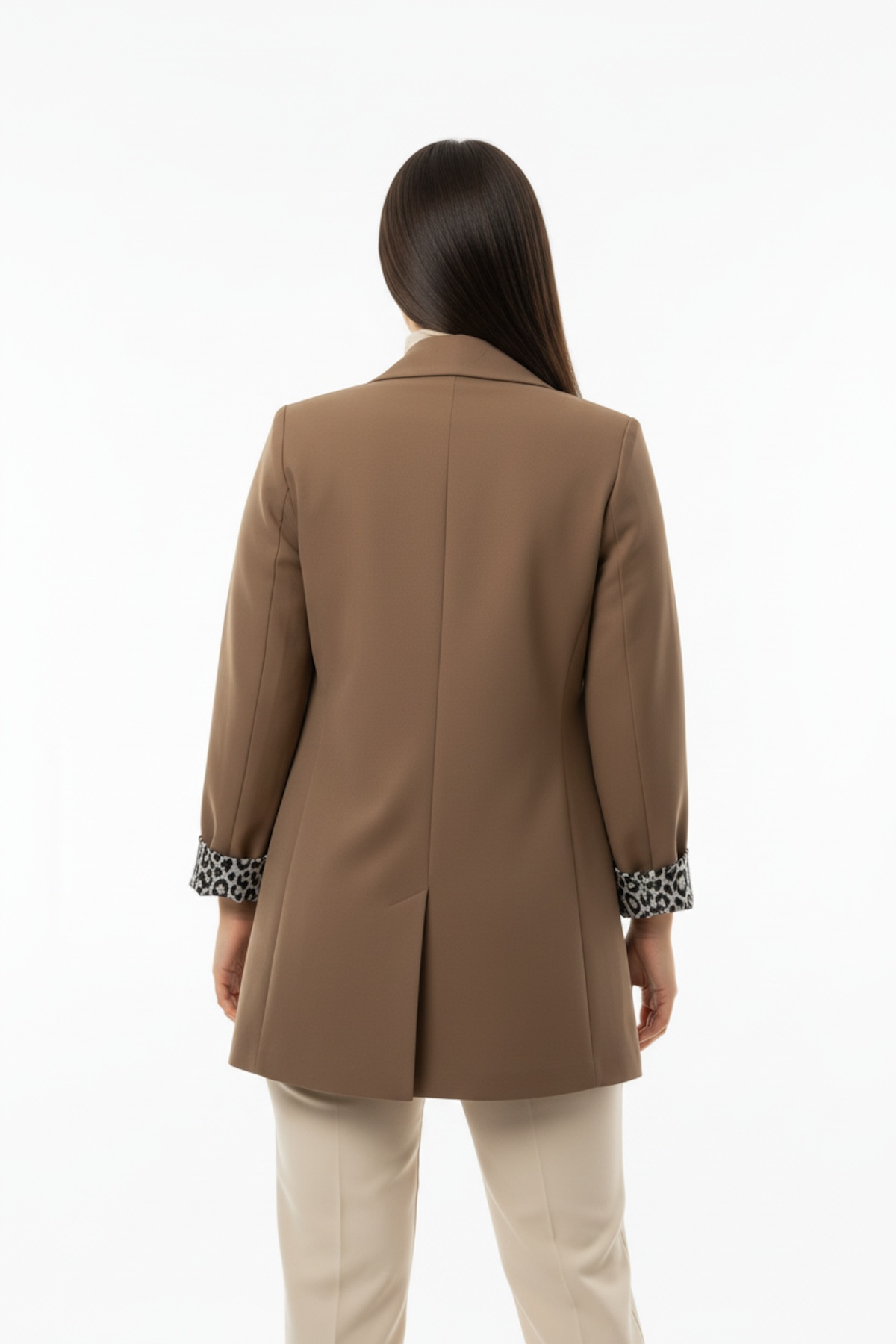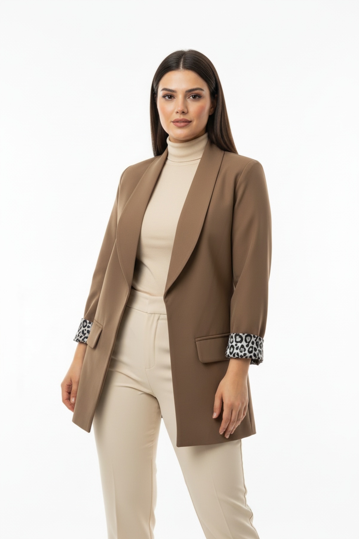 Premium şal yakalı blazer ceket, leopar desenli astarlı. Açık ön tasarım ile şık ve modern bir görünüm sunar. Cep detayları ve zarif kesimi ile ofis şıklığından günlük kombinlere kadar her ortamda rahatlıkla kullanabilirsiniz. 36-40 beden seçenekleri mevcuttur.