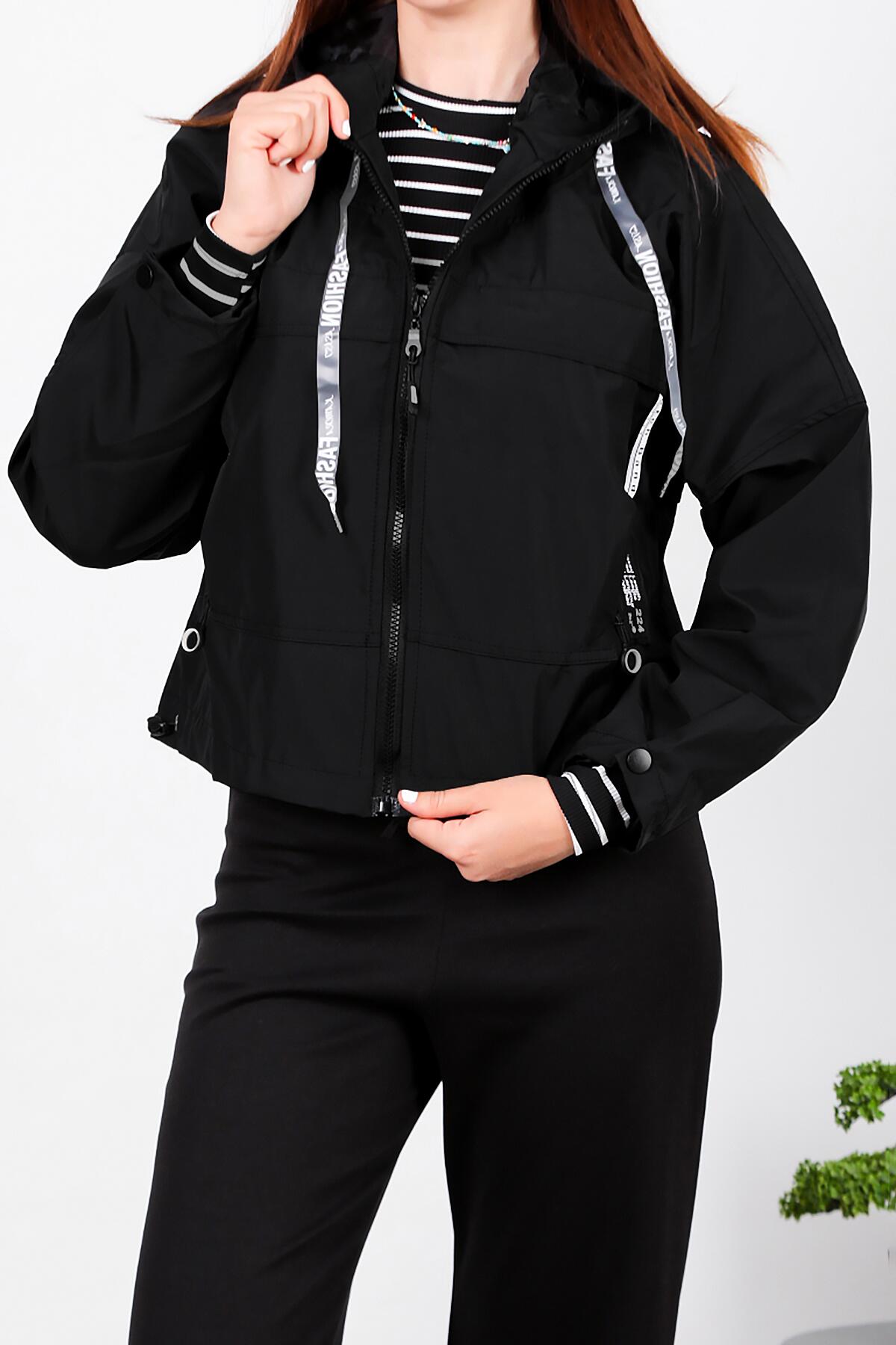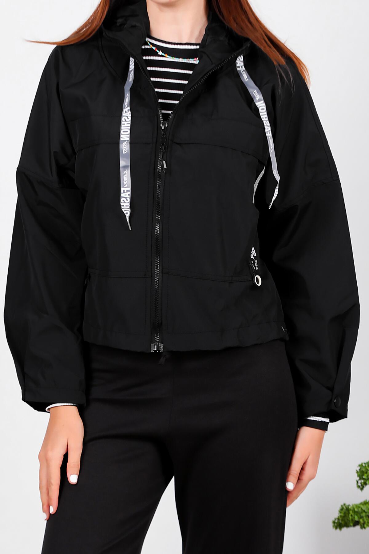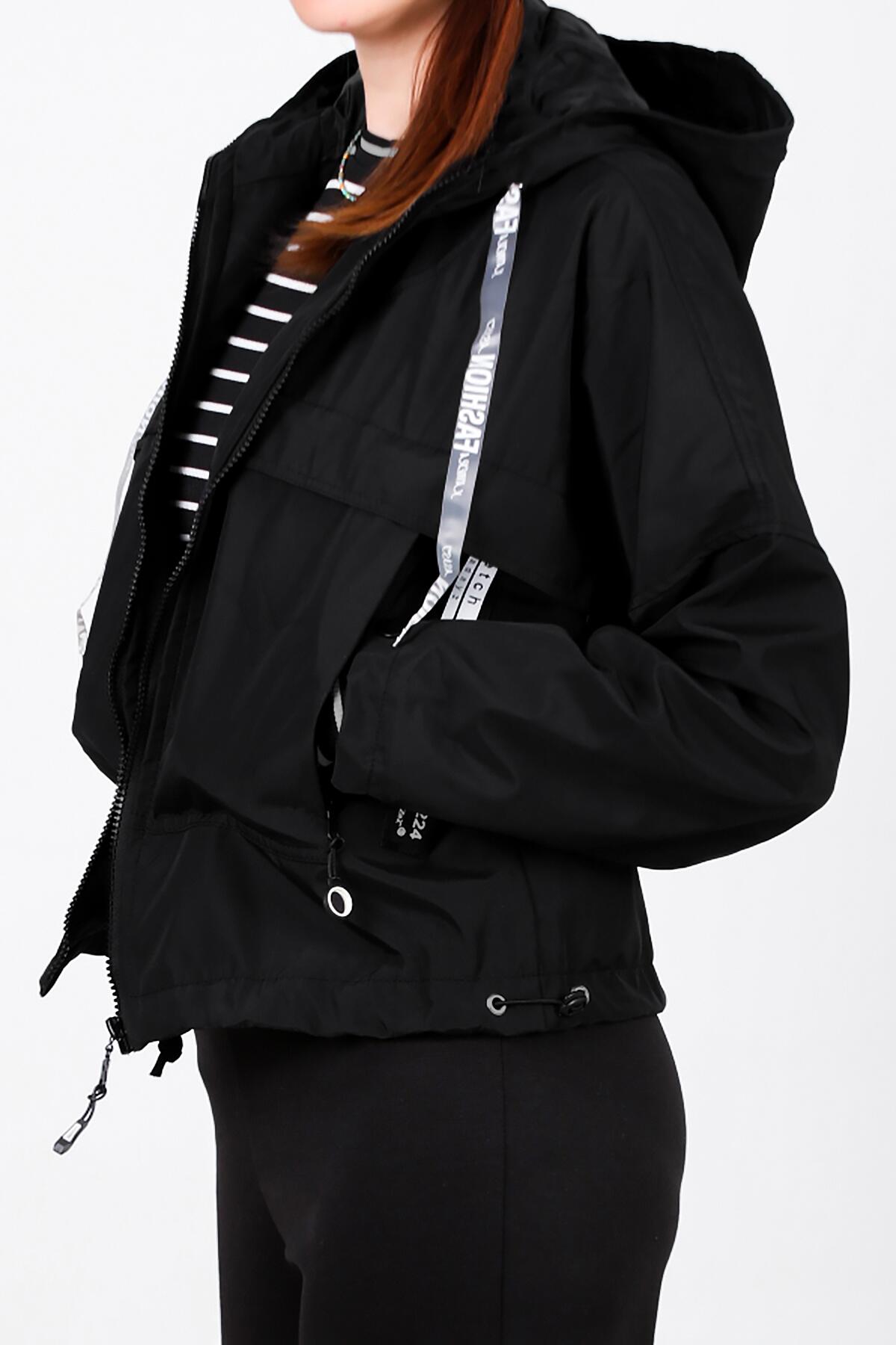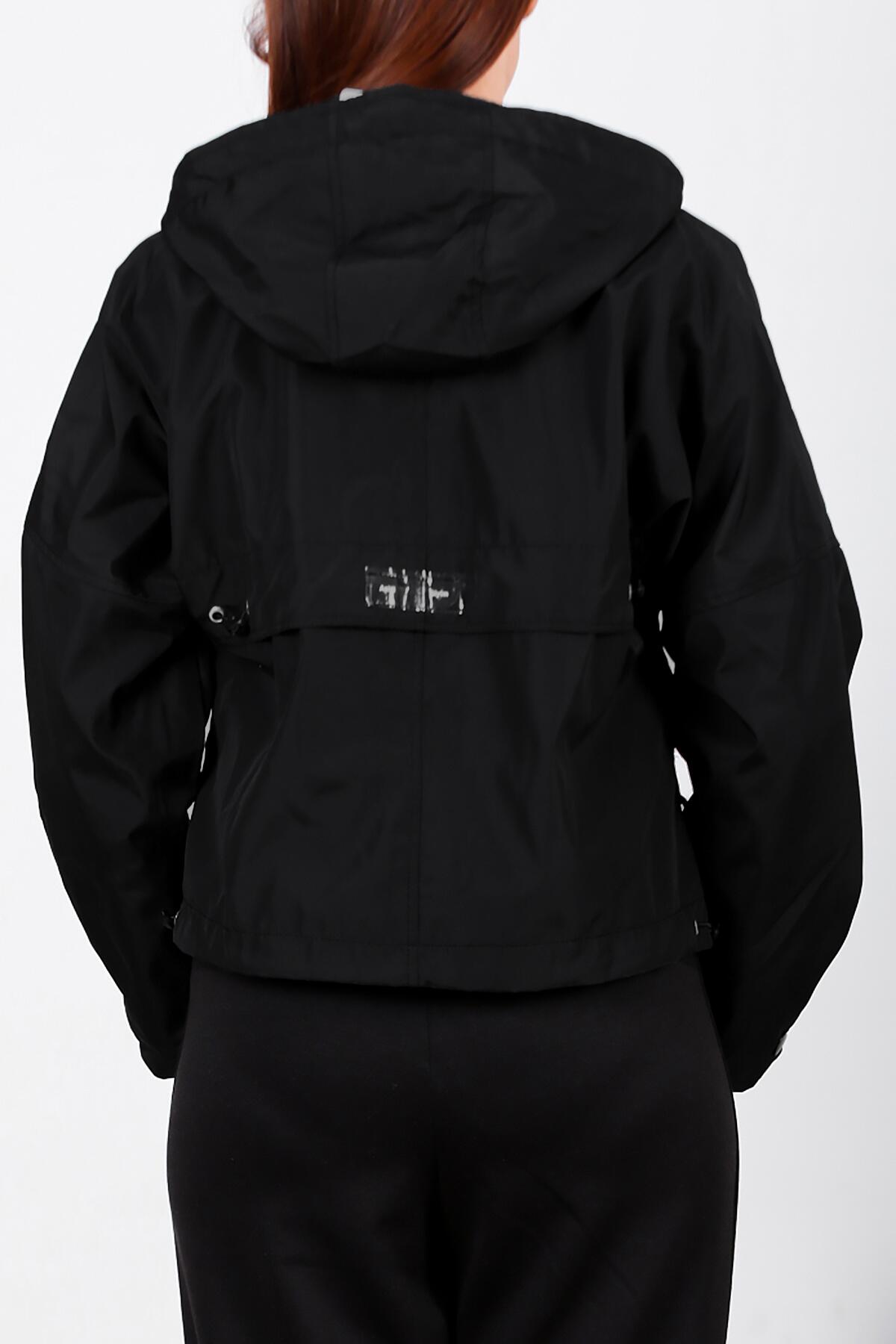Kadın Kapşonlu Astarlı Yağmurluk Mont Siyah