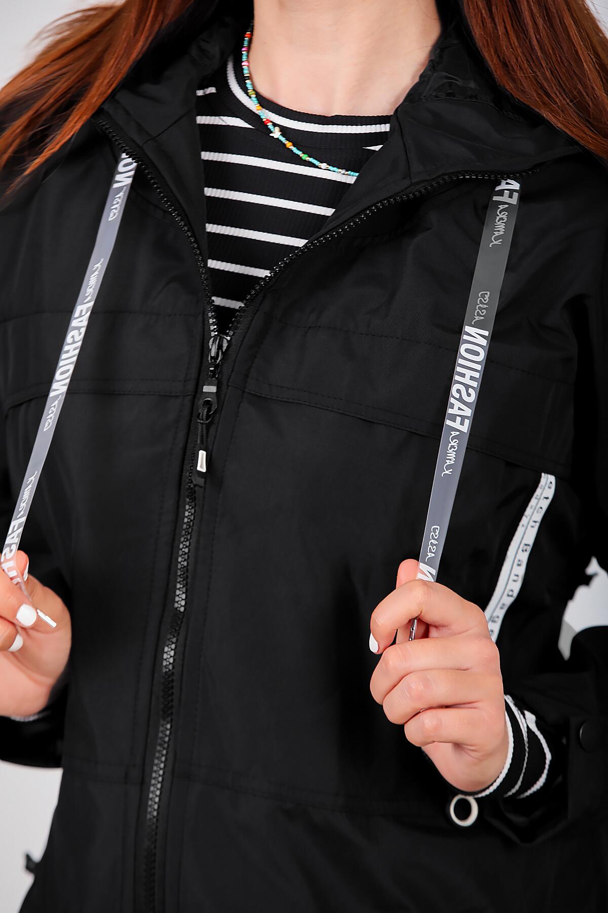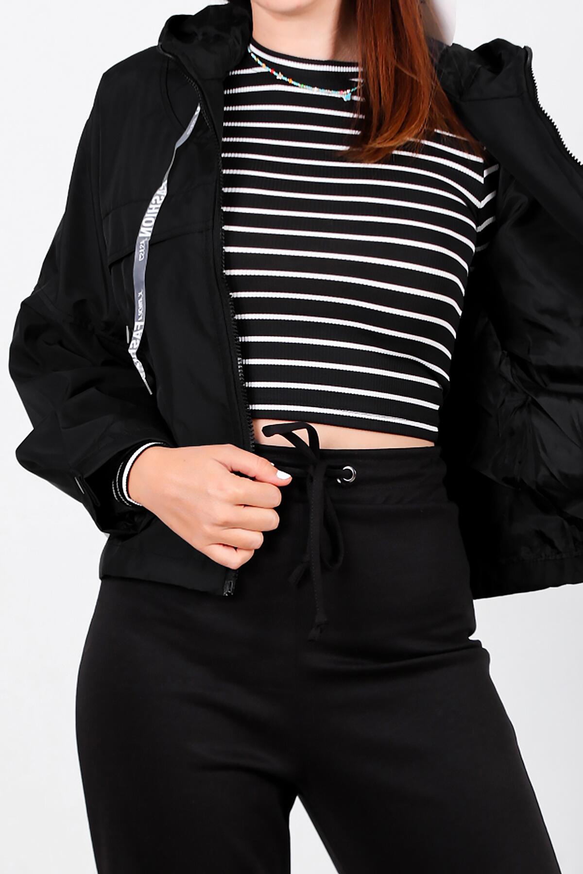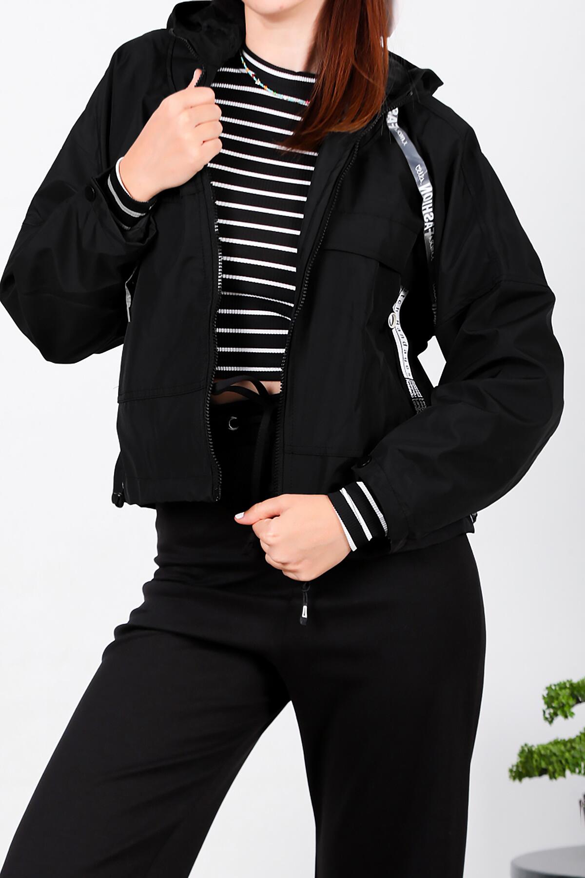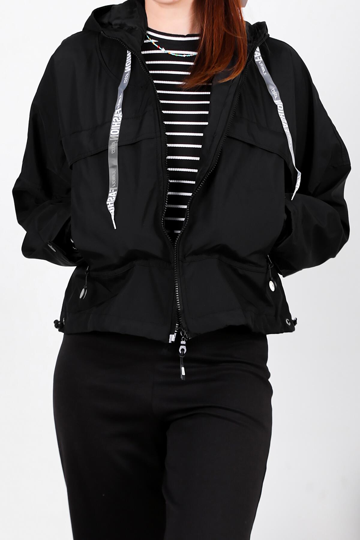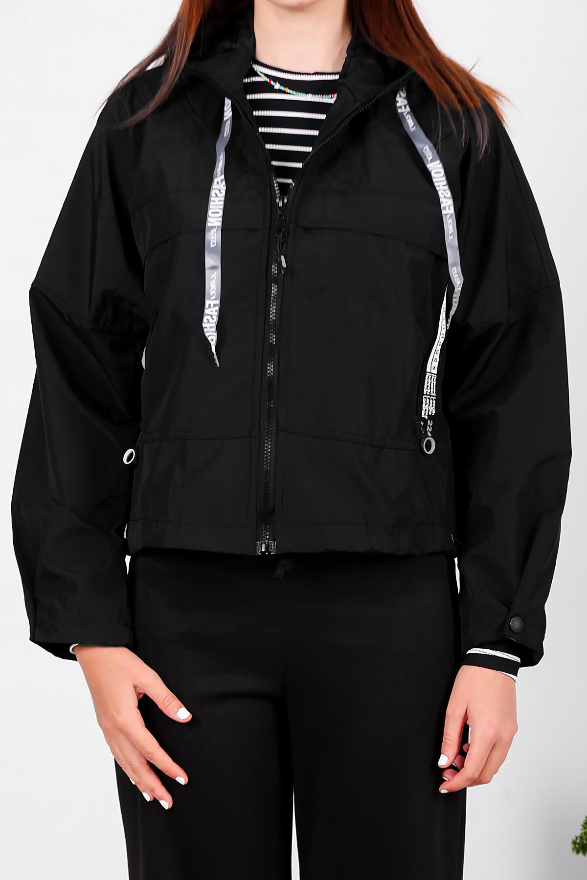 Kadın Kapşonlu Astarlı Yağmurluk Mont Siyah