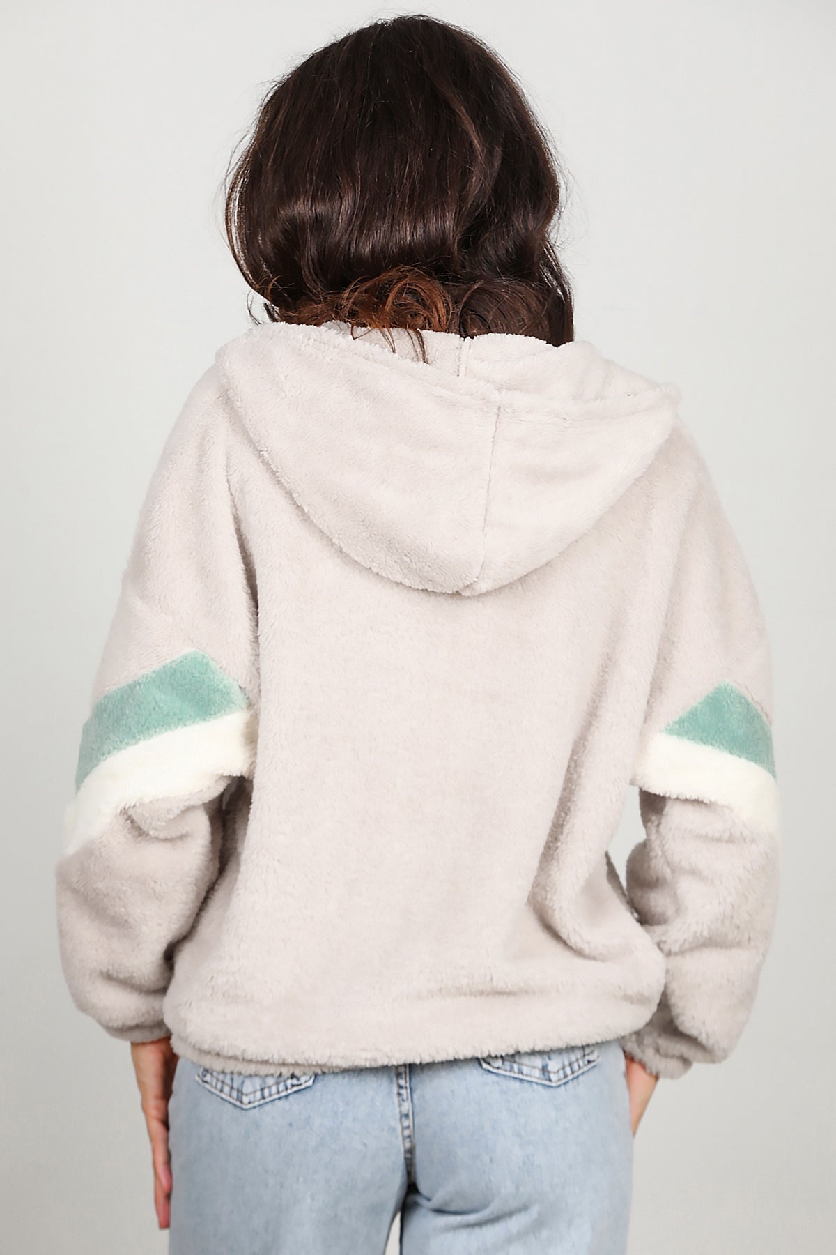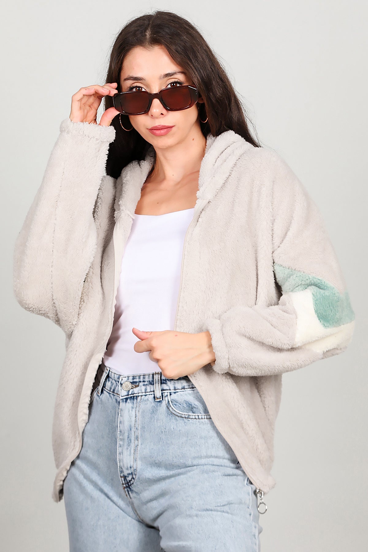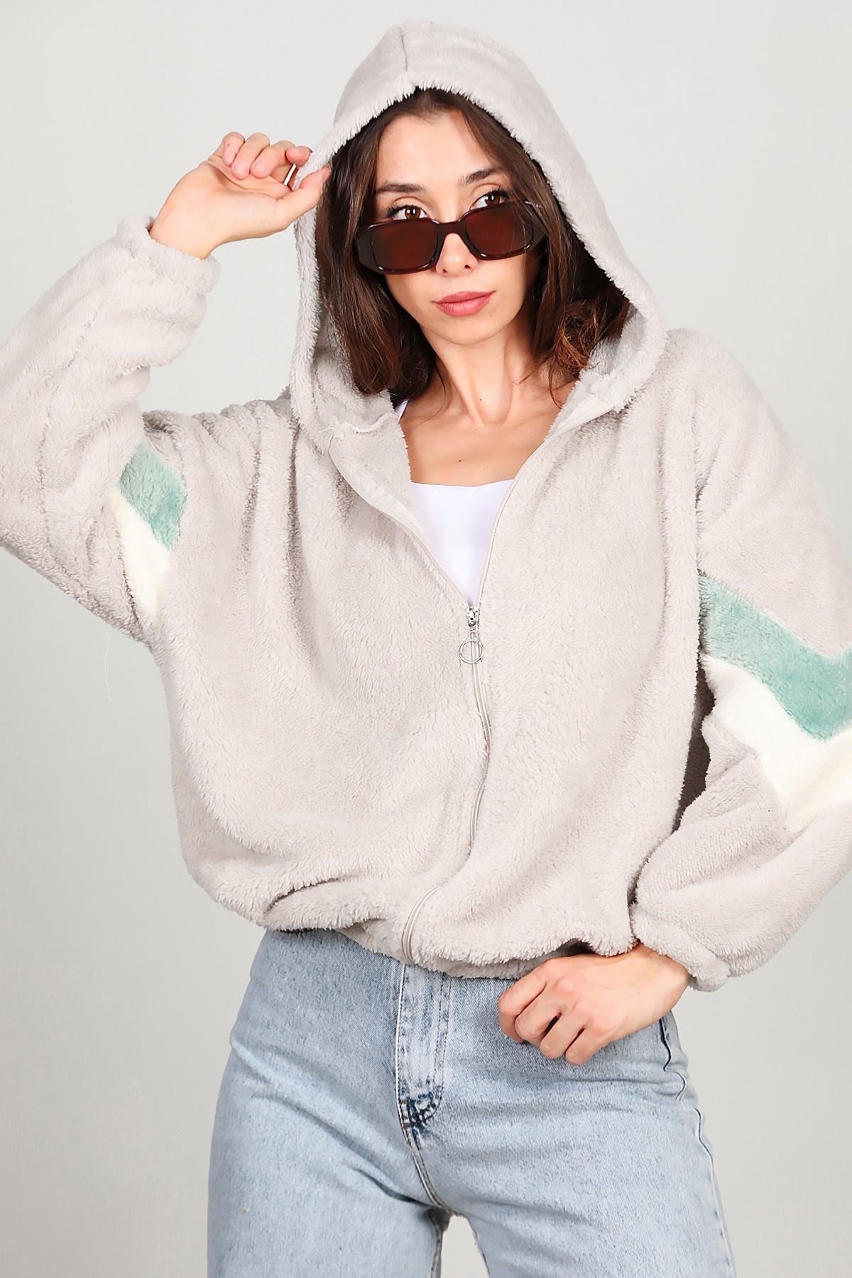 Kadın Kapşonlu Kol Çizgi Detay Peluş Ceket Pudra