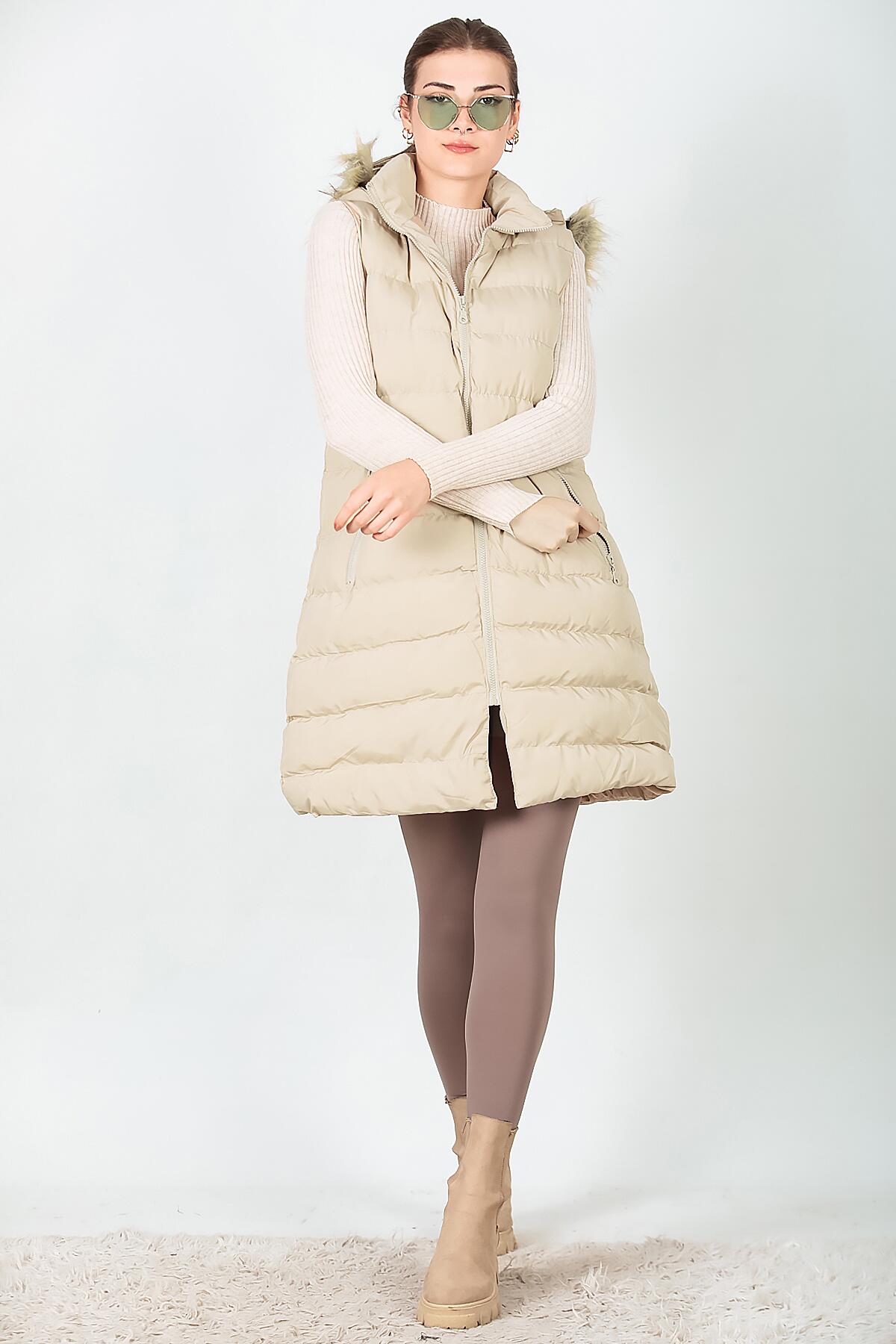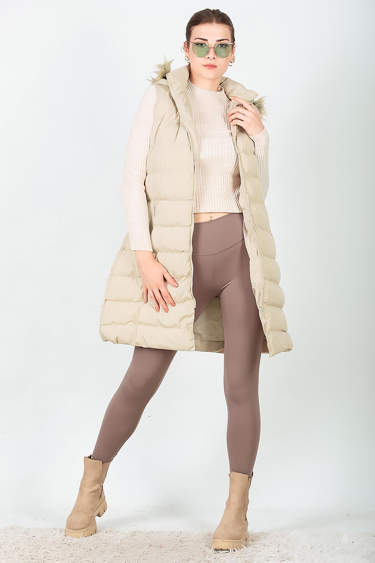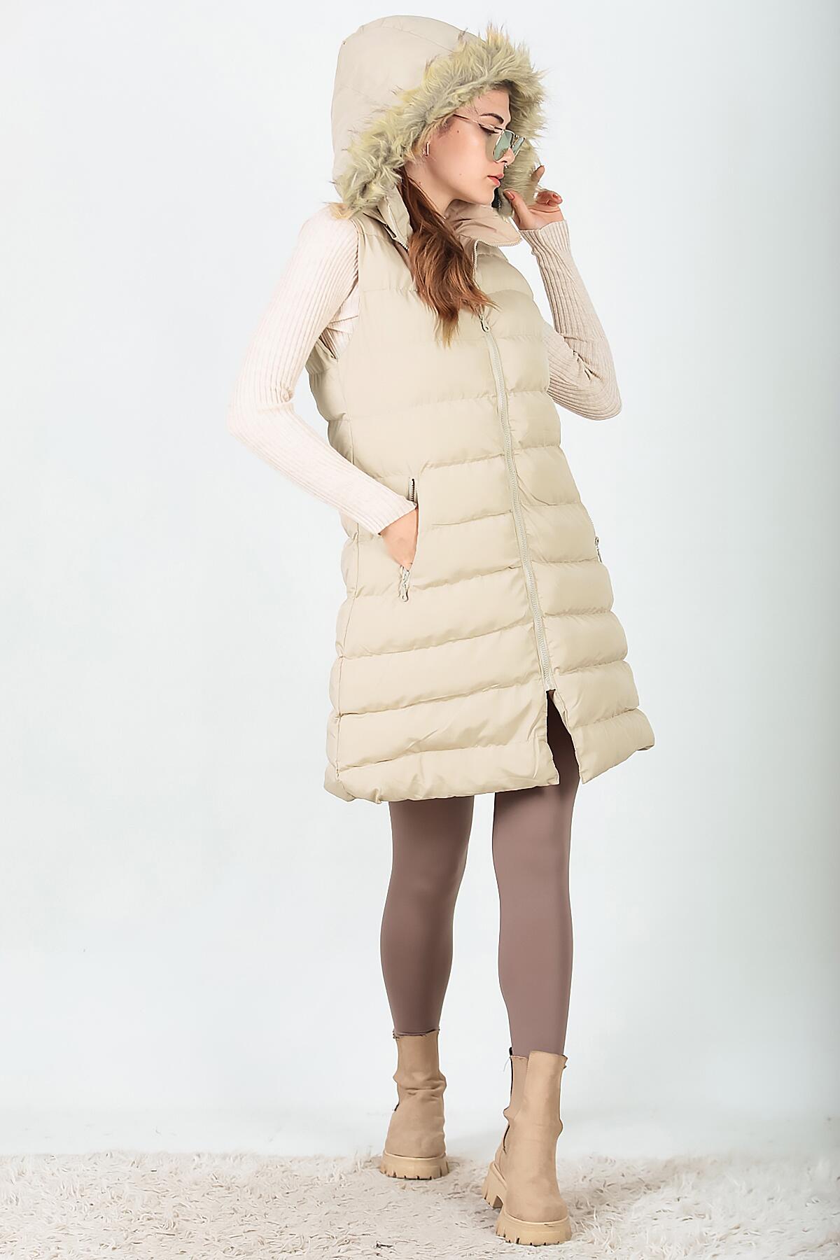 Kadın Kapşonlu Kürklü Uzun Şişme Yelek Krem