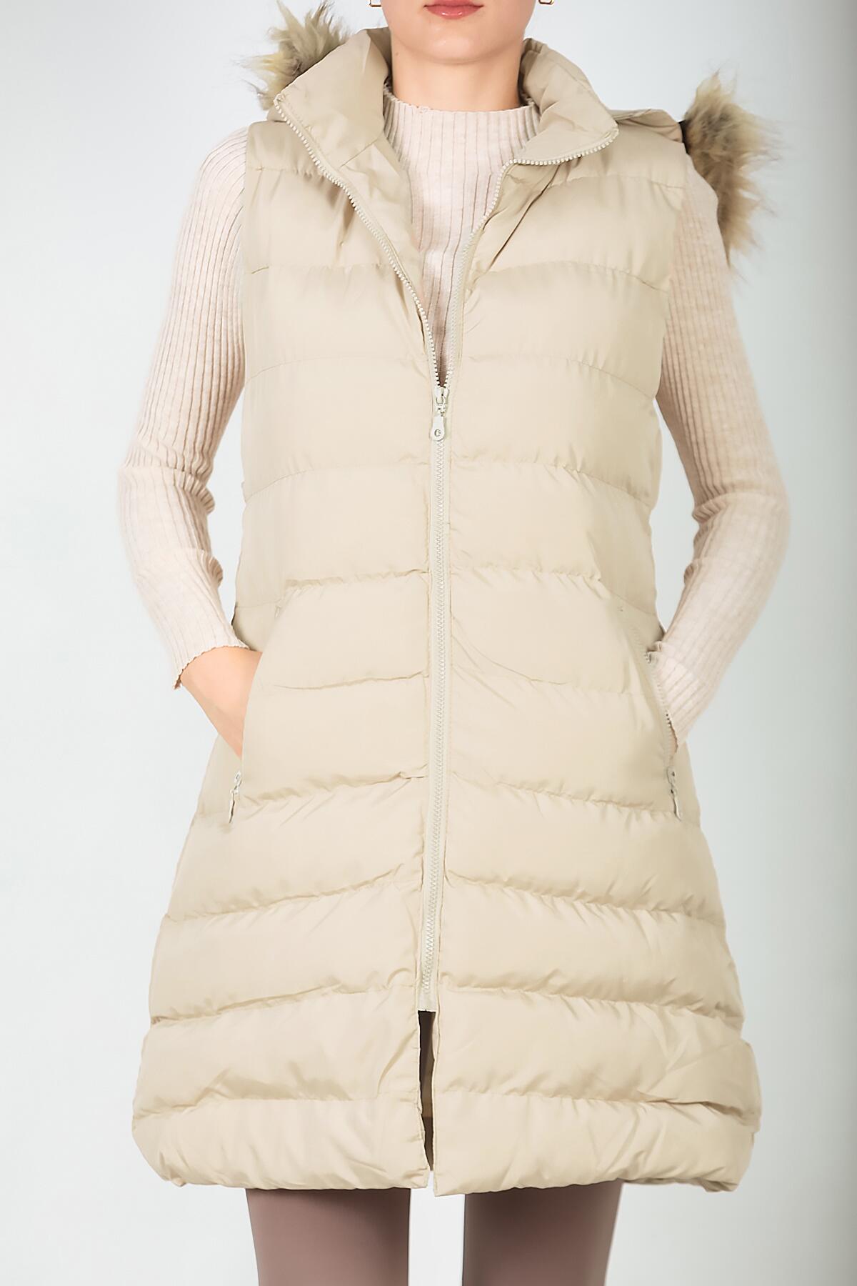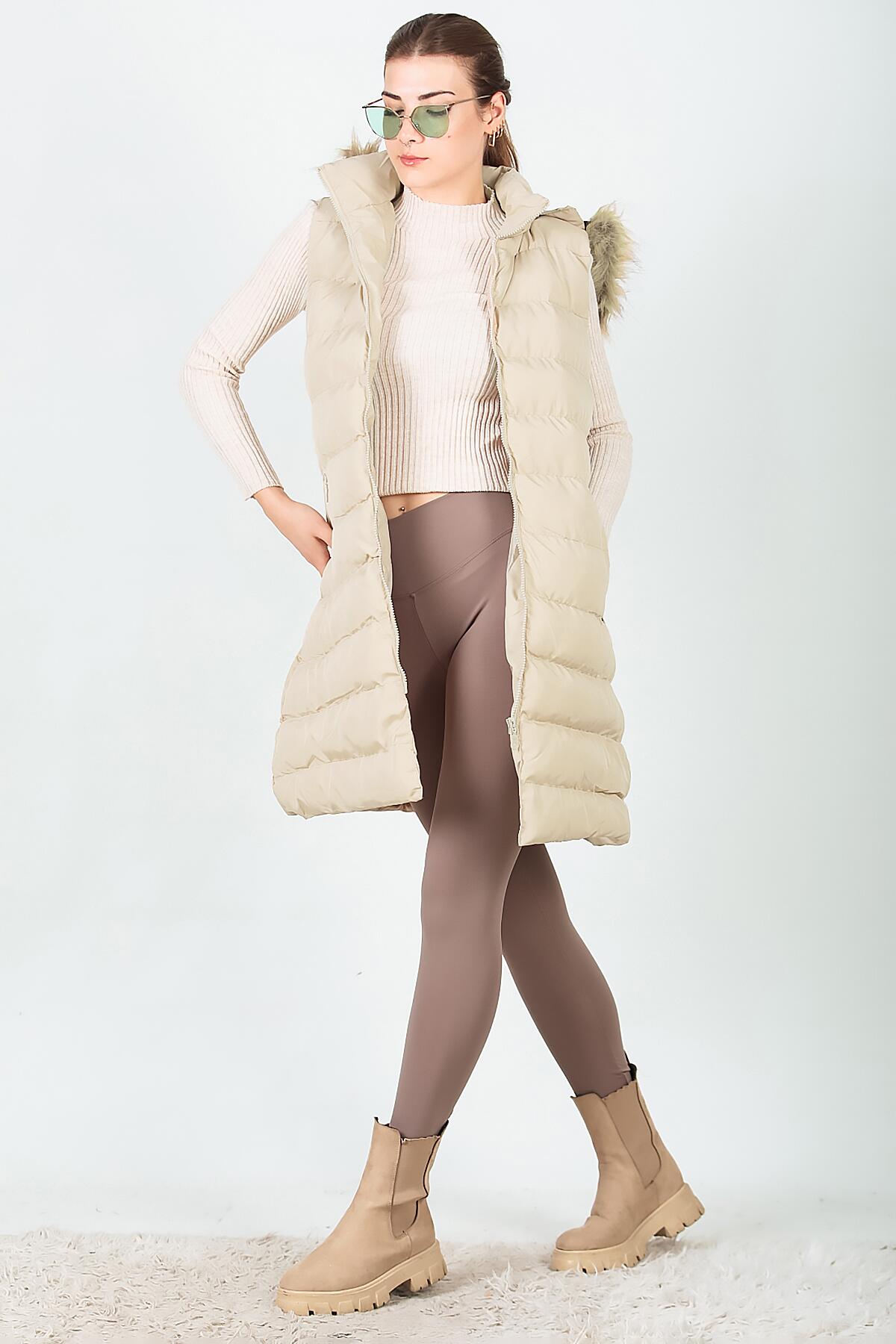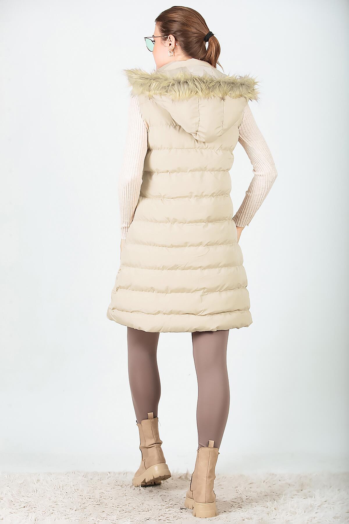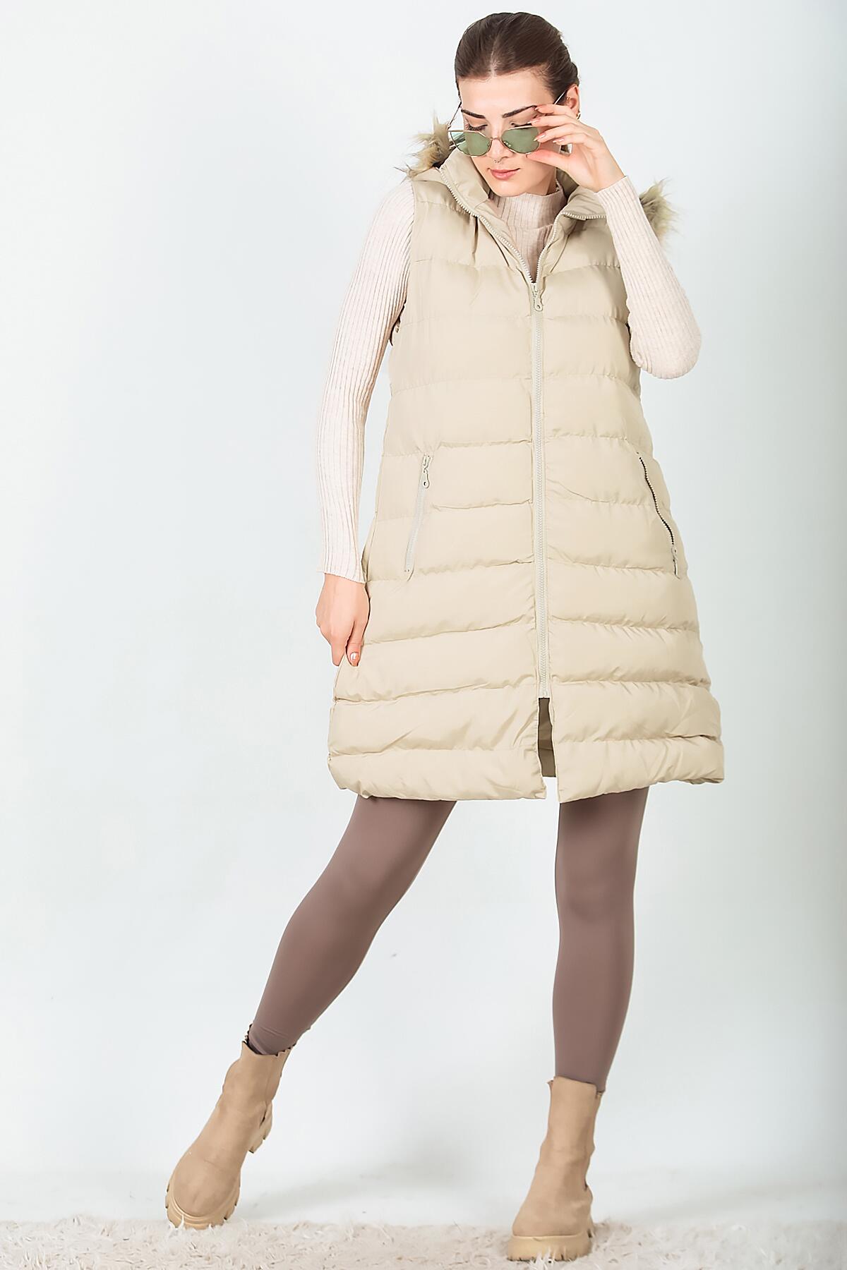 Kadın Kapşonlu Kürklü Uzun Şişme Yelek Krem