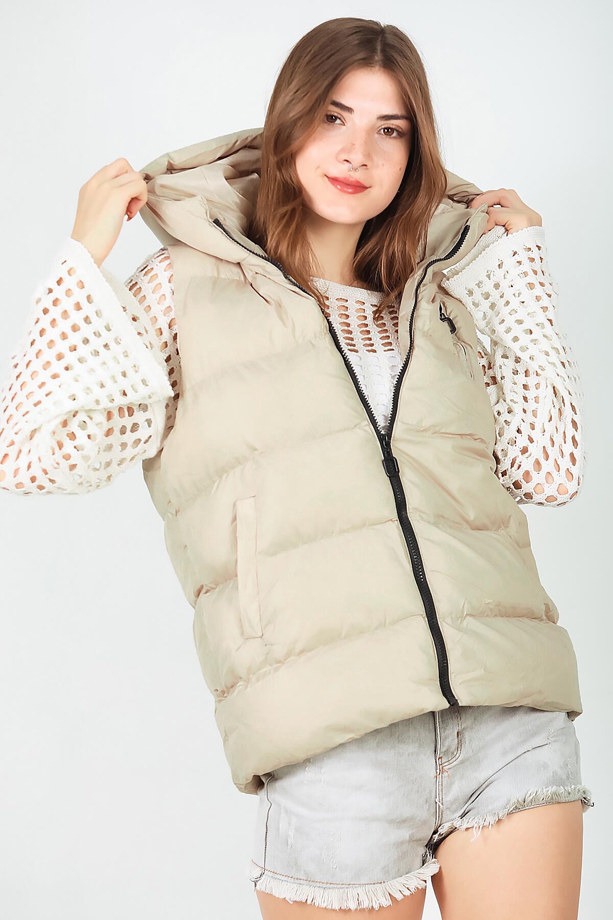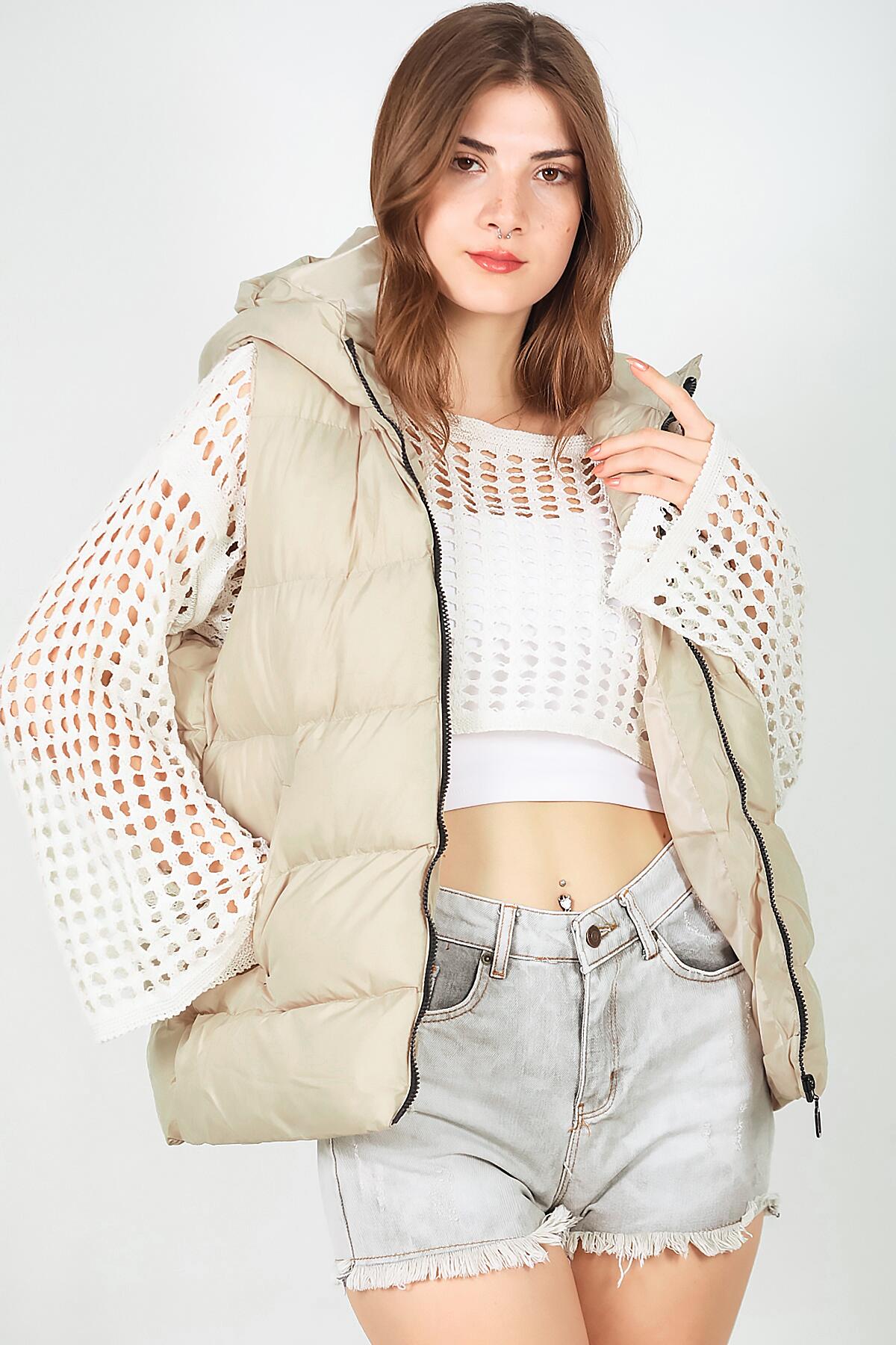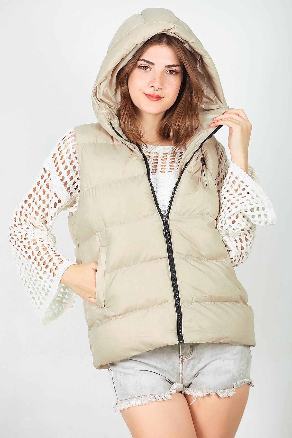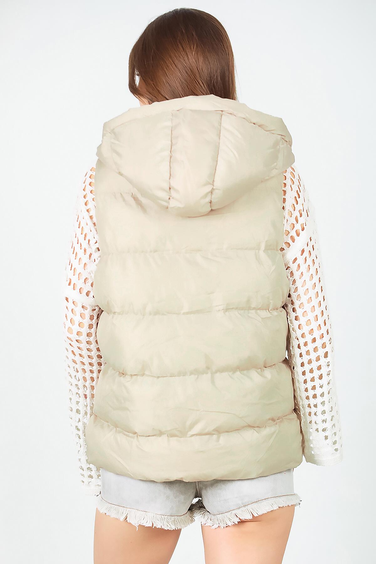 Kadın Kapşonlu Şişme Yelek Krem