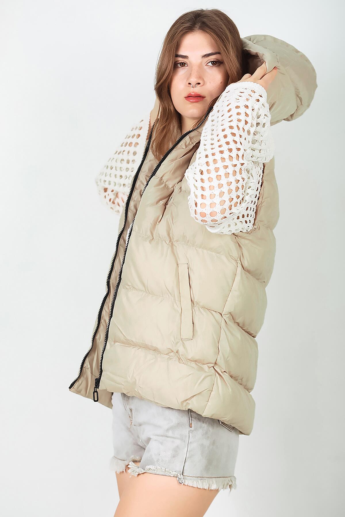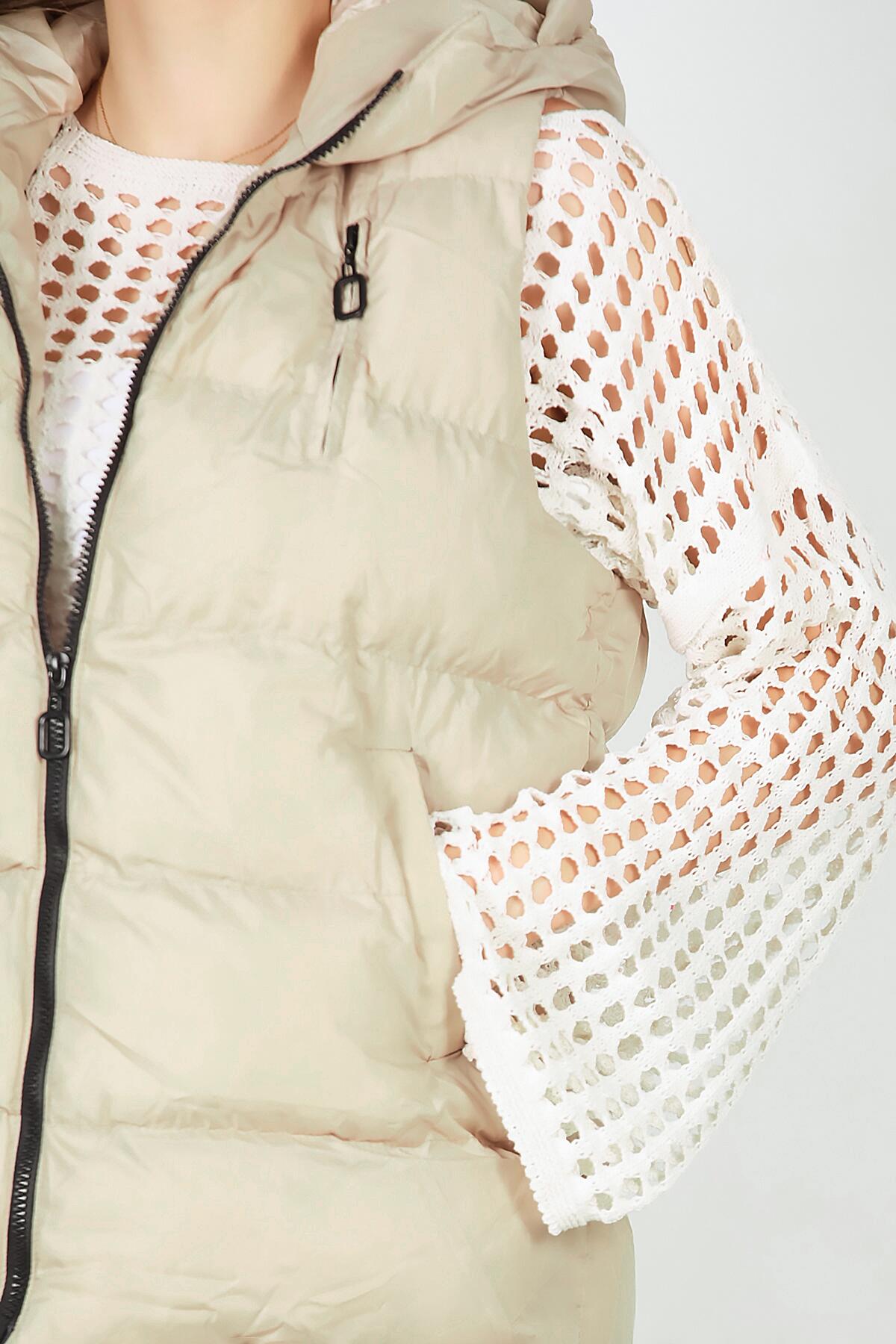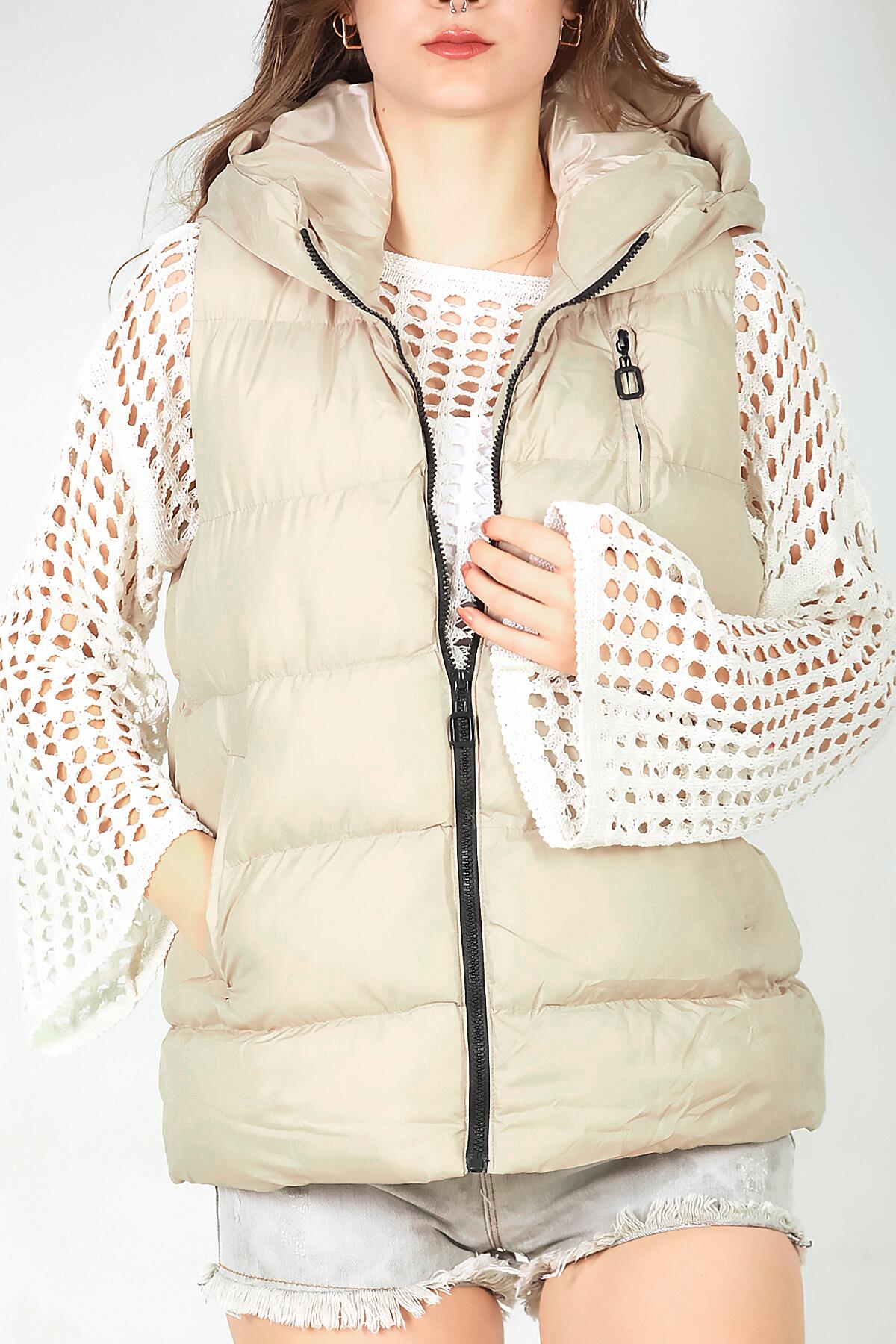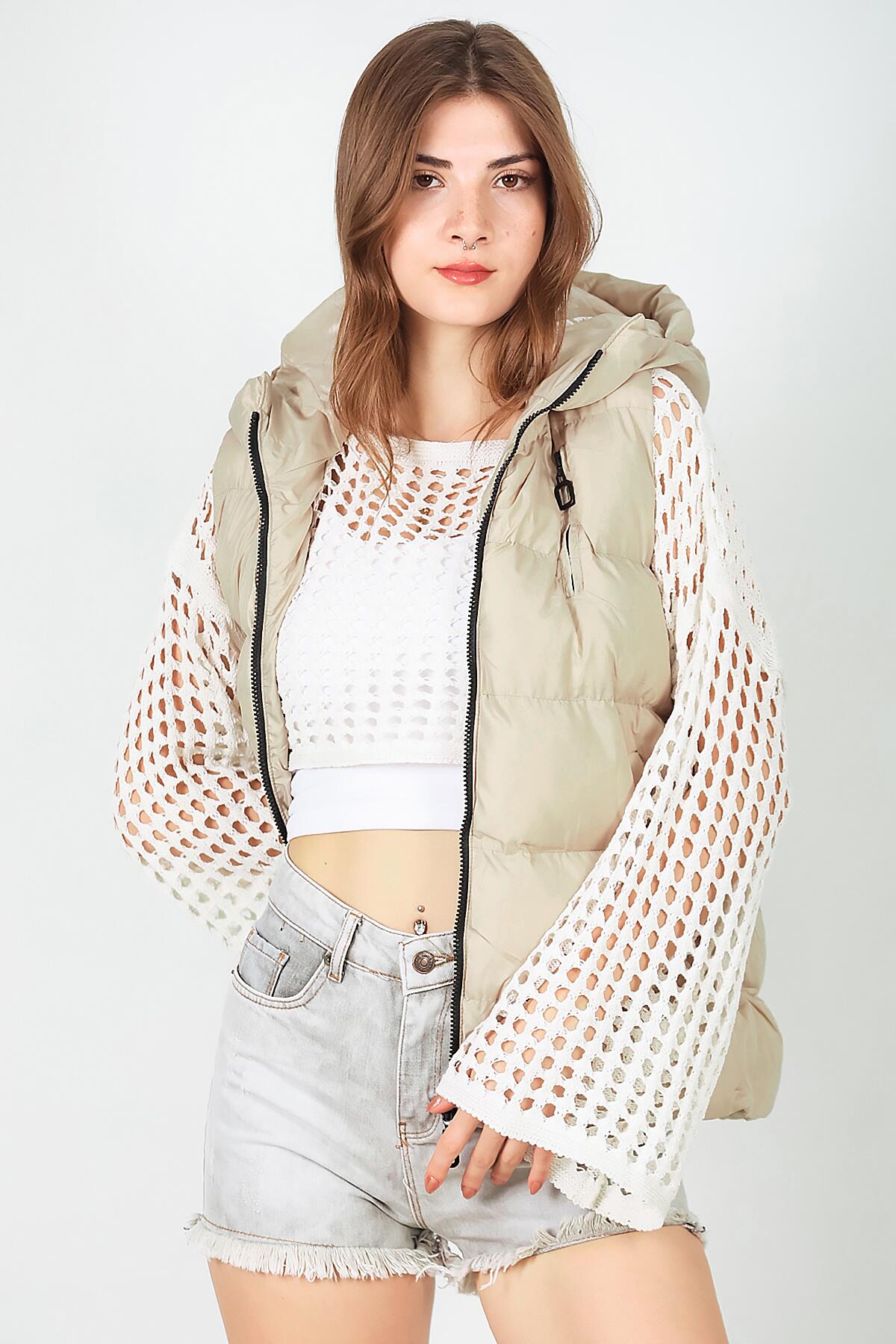 Kadın Kapşonlu Şişme Yelek Krem