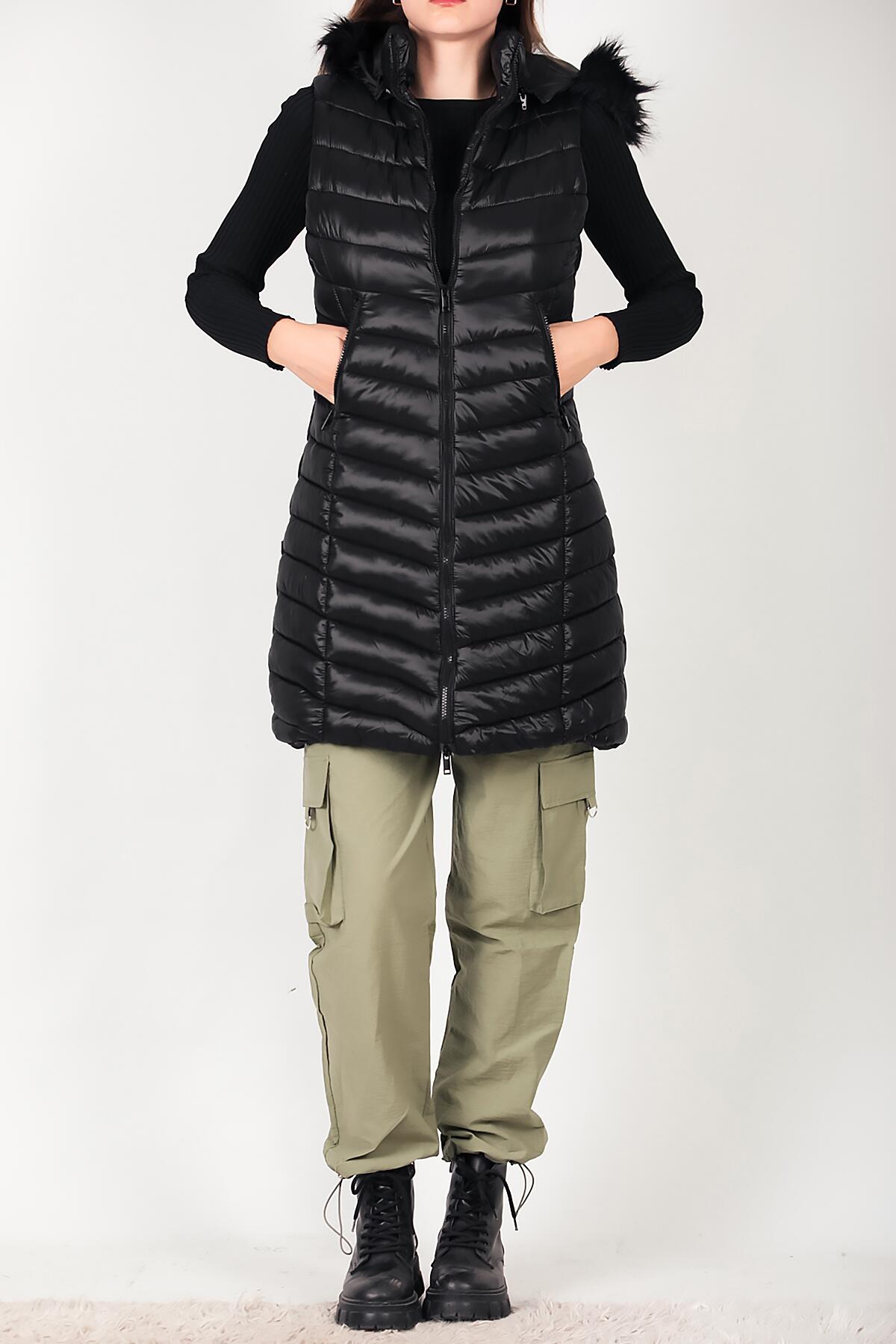 Kadın Kürklü Kapşonlu Şişme Yelek Siyah