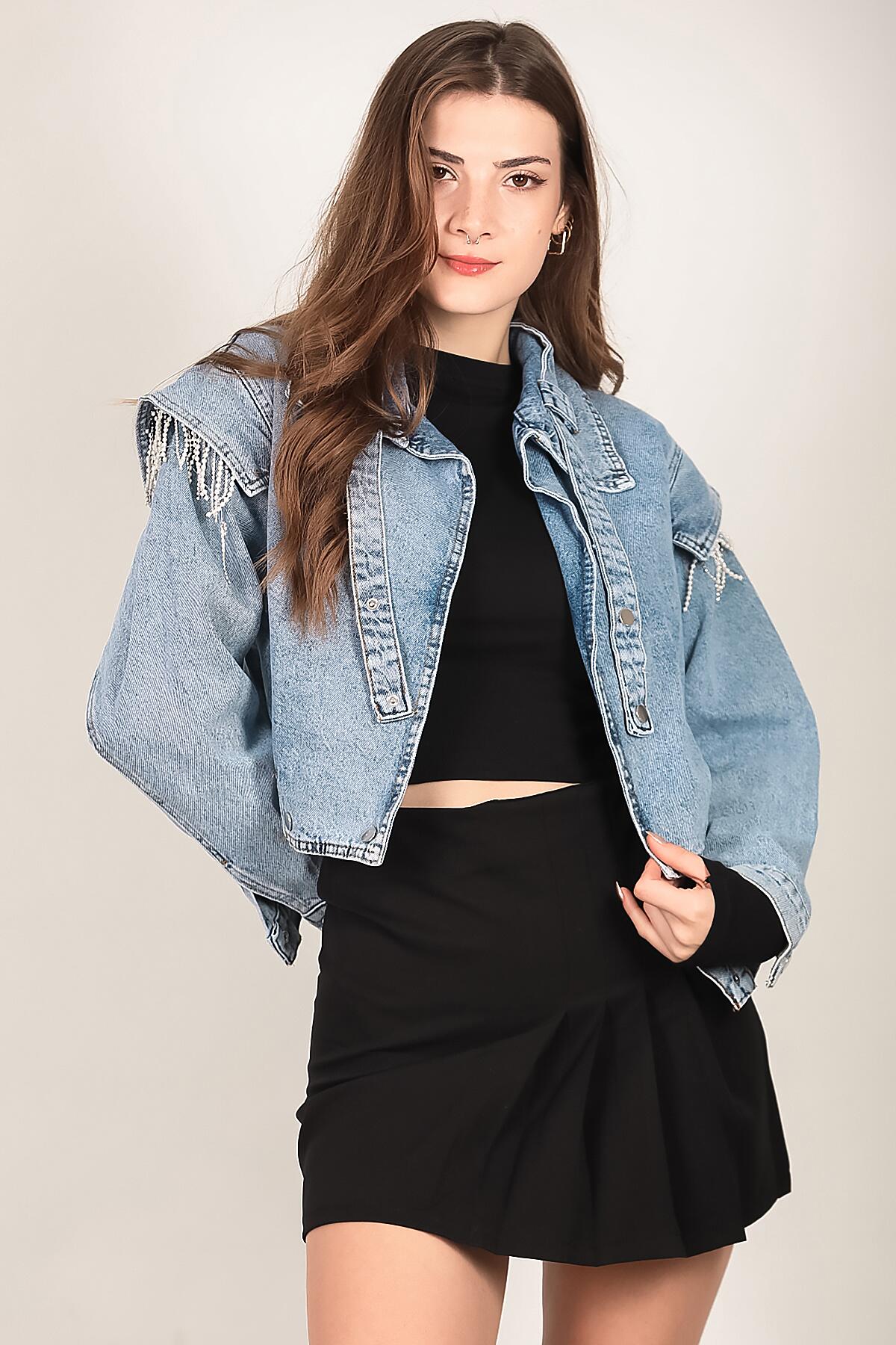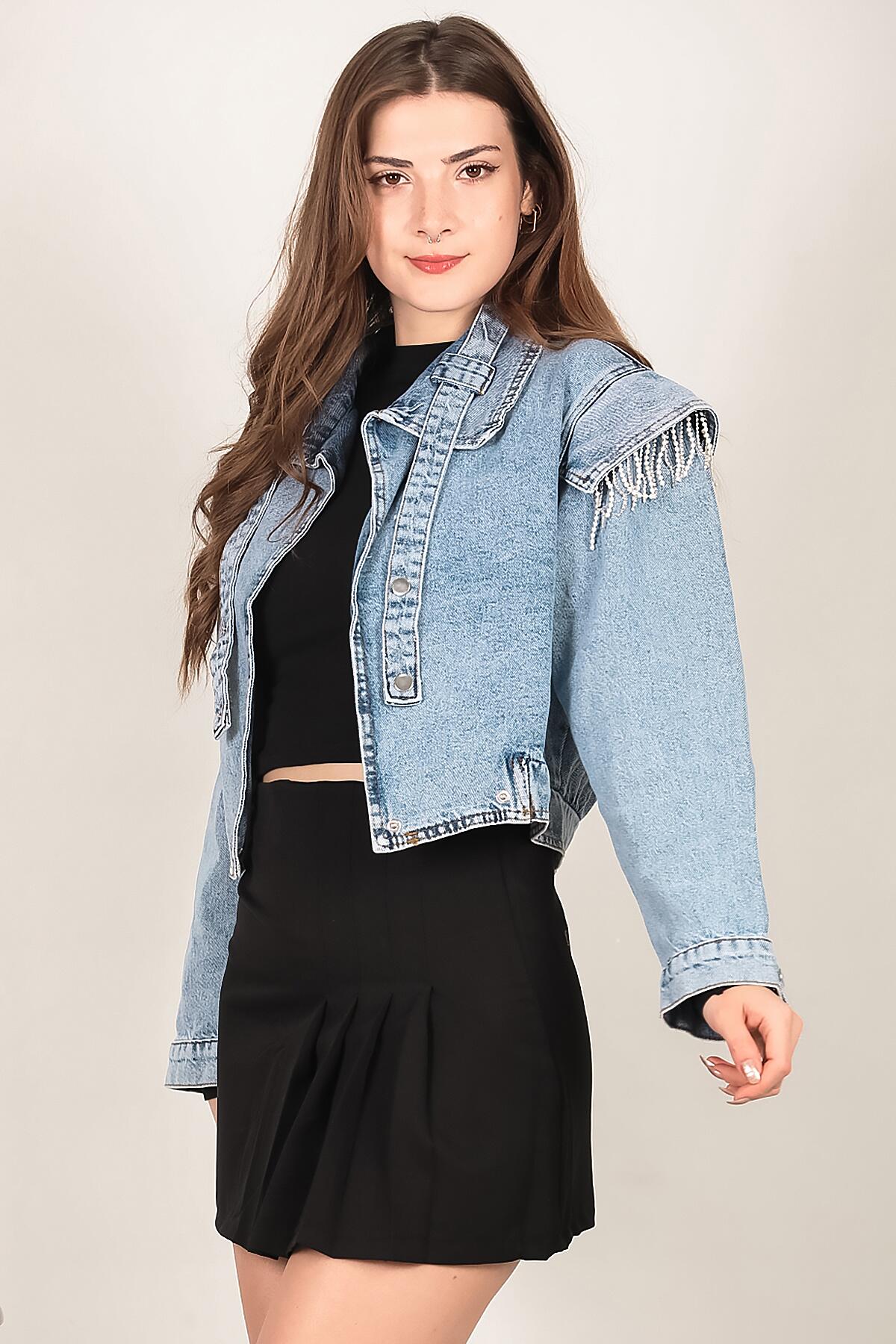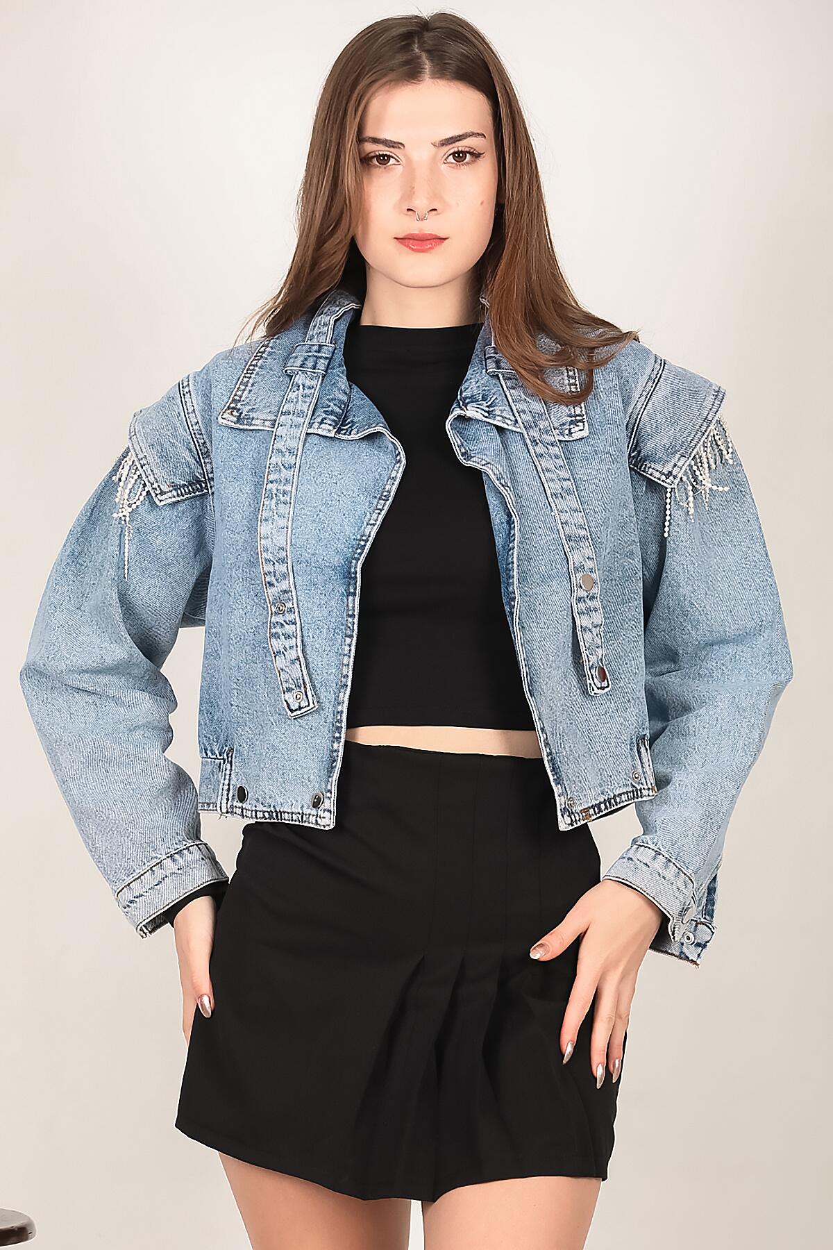 Kadın Omuz Taşlı Crop Kot Ceket Kot