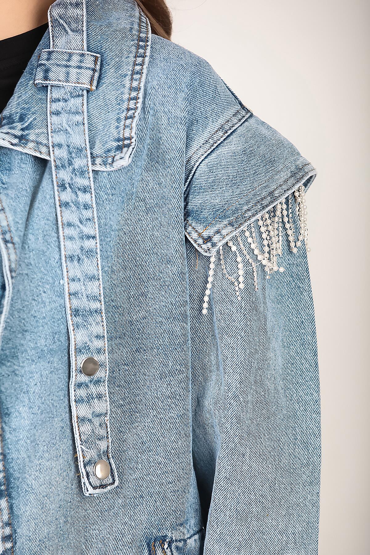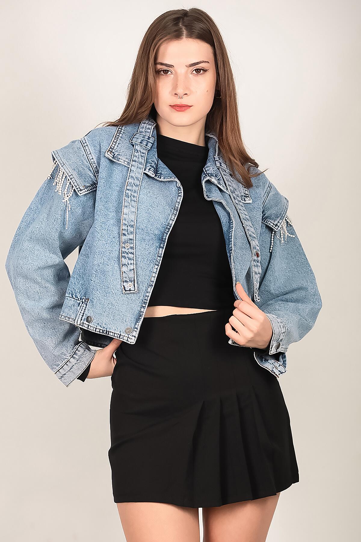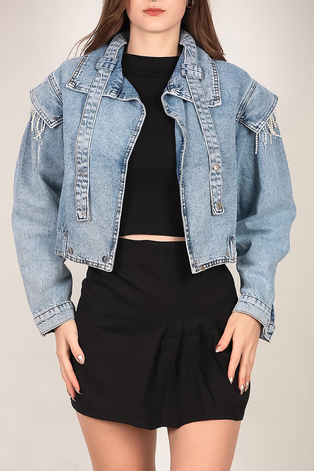 Kadın Omuz Taşlı Crop Kot Ceket Kot