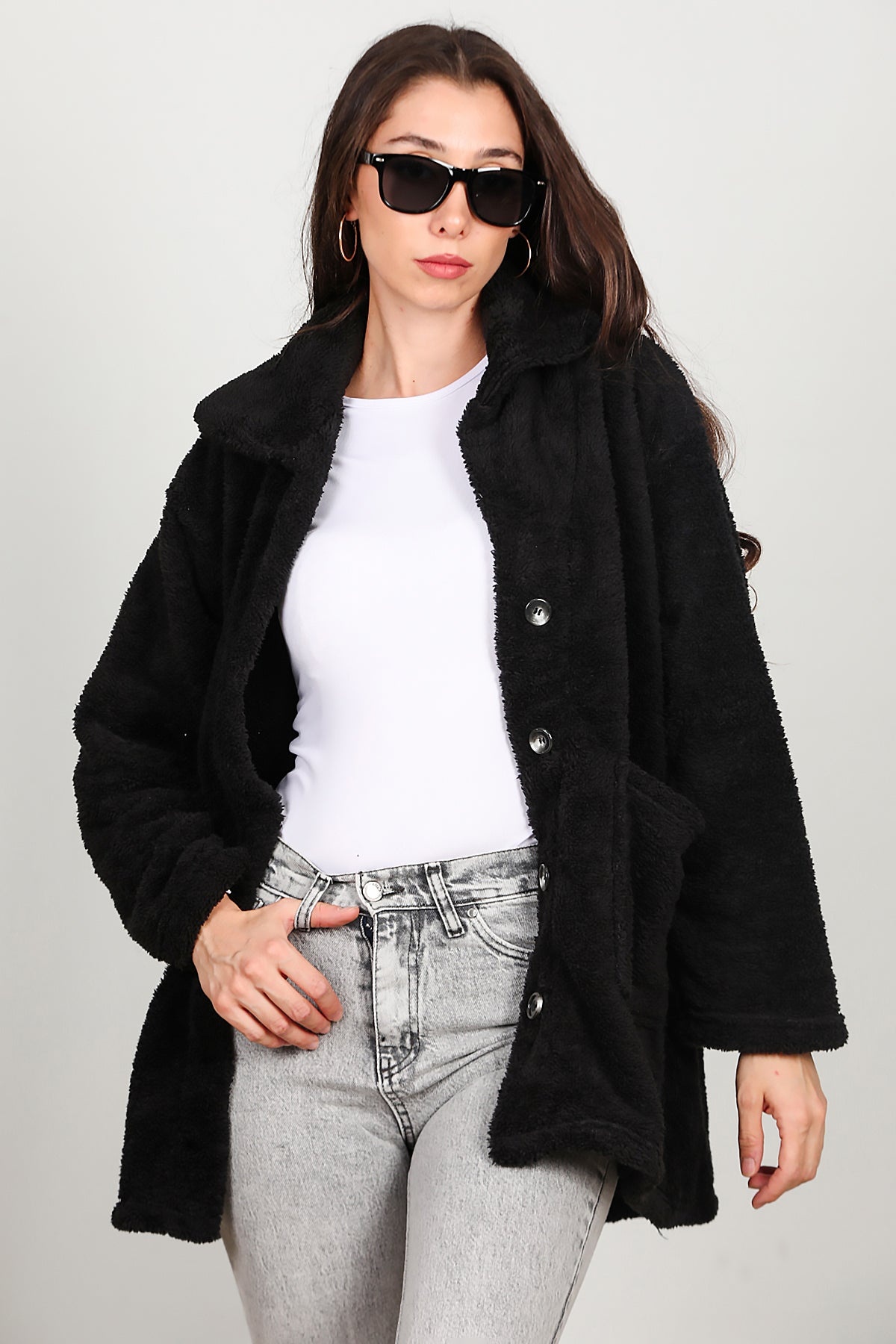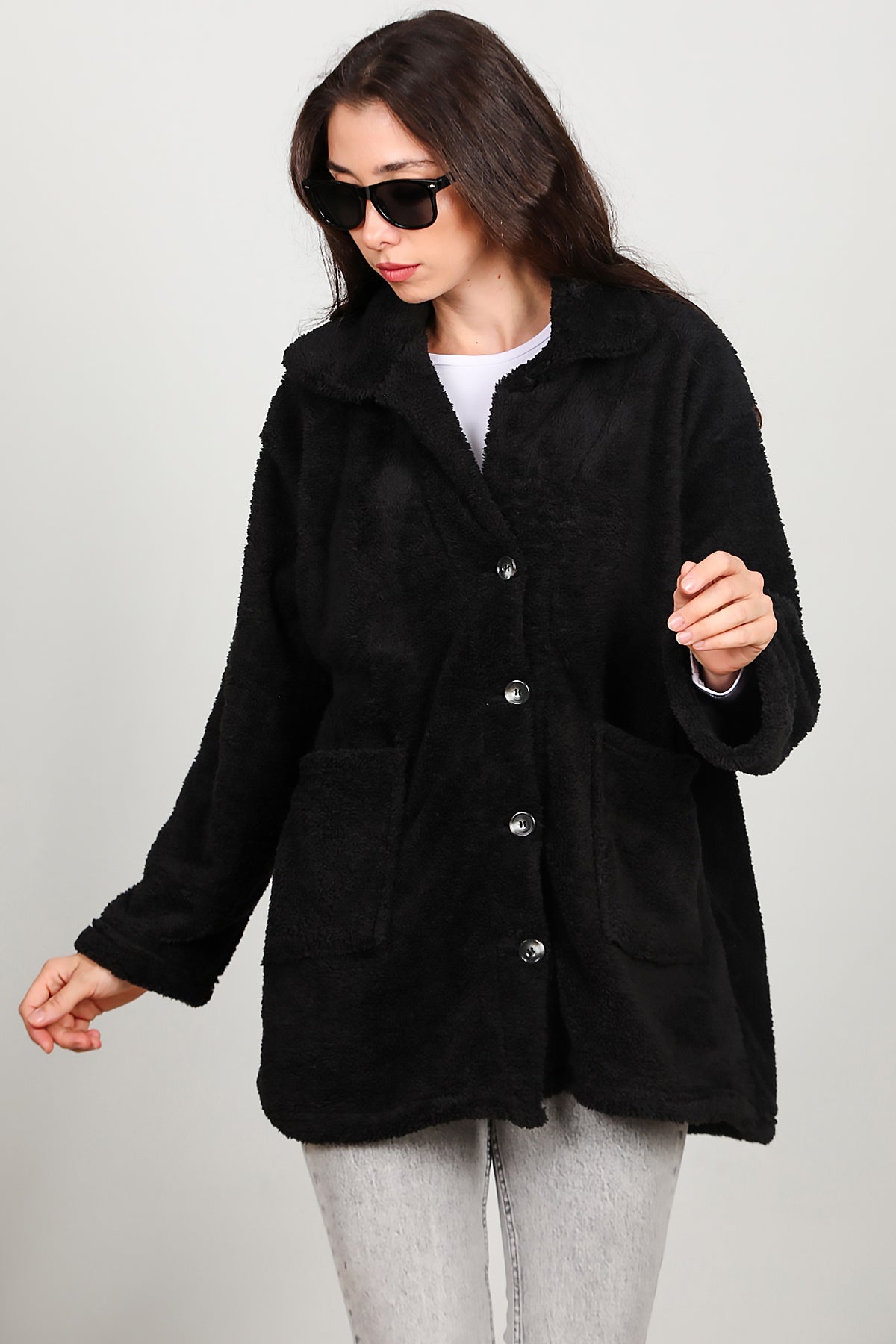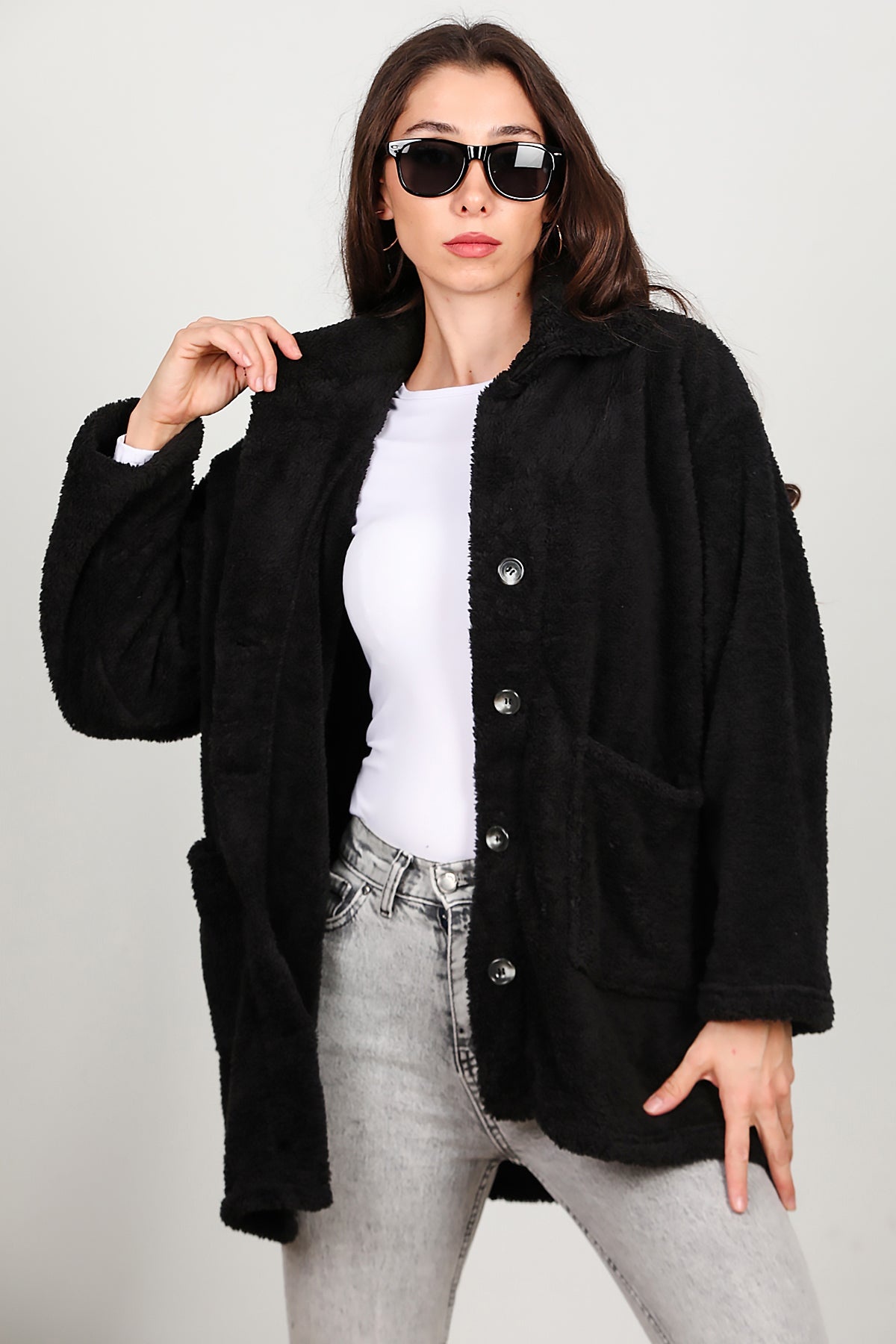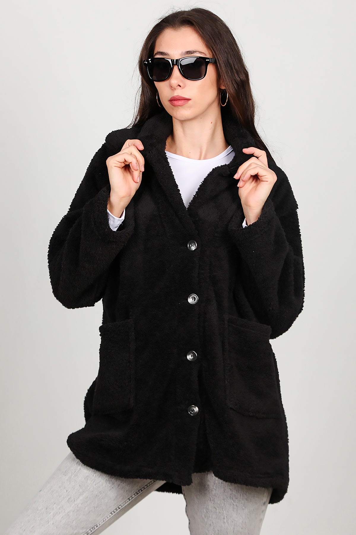 Kadın Önü Düğmeli Peluş Ceket Siyah