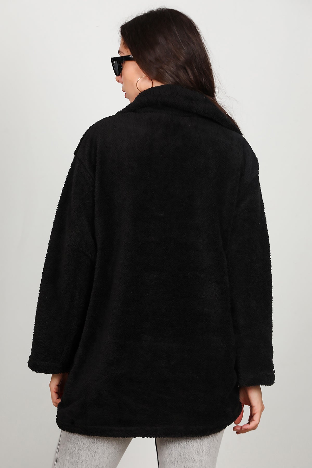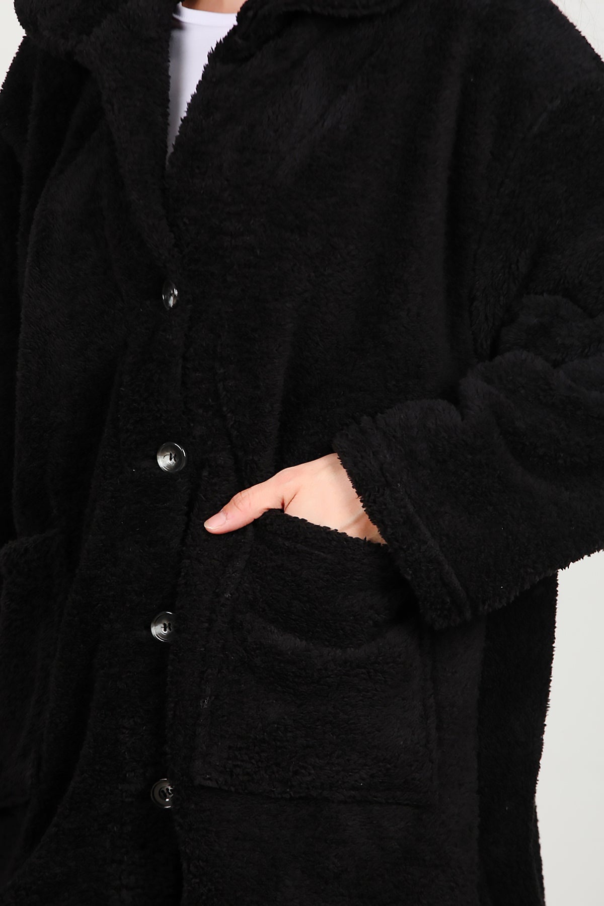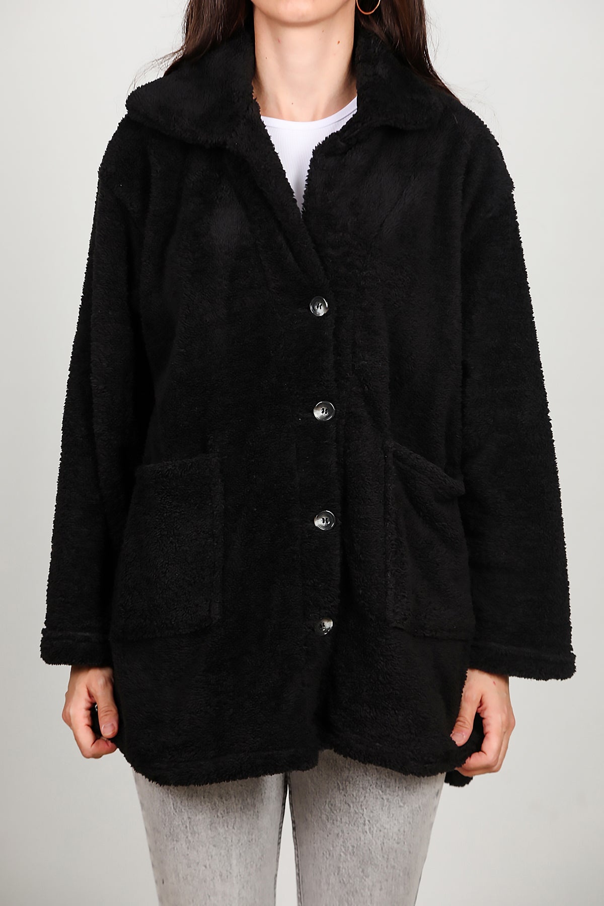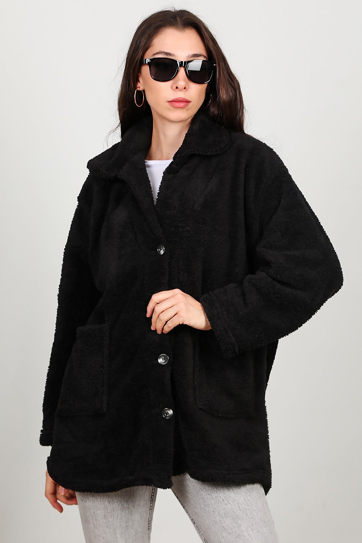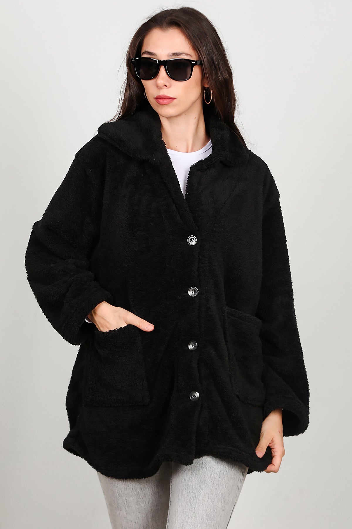 Kadın Önü Düğmeli Peluş Ceket Siyah