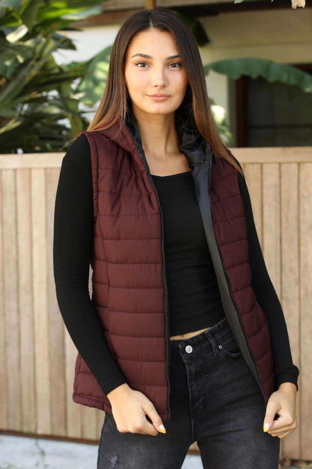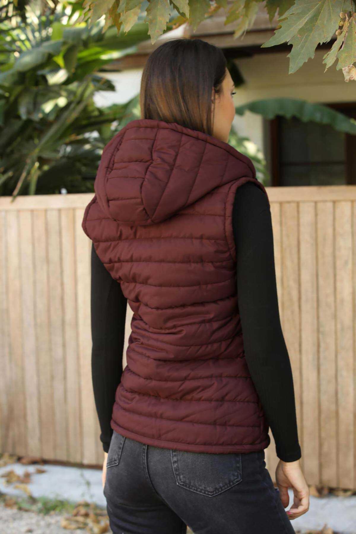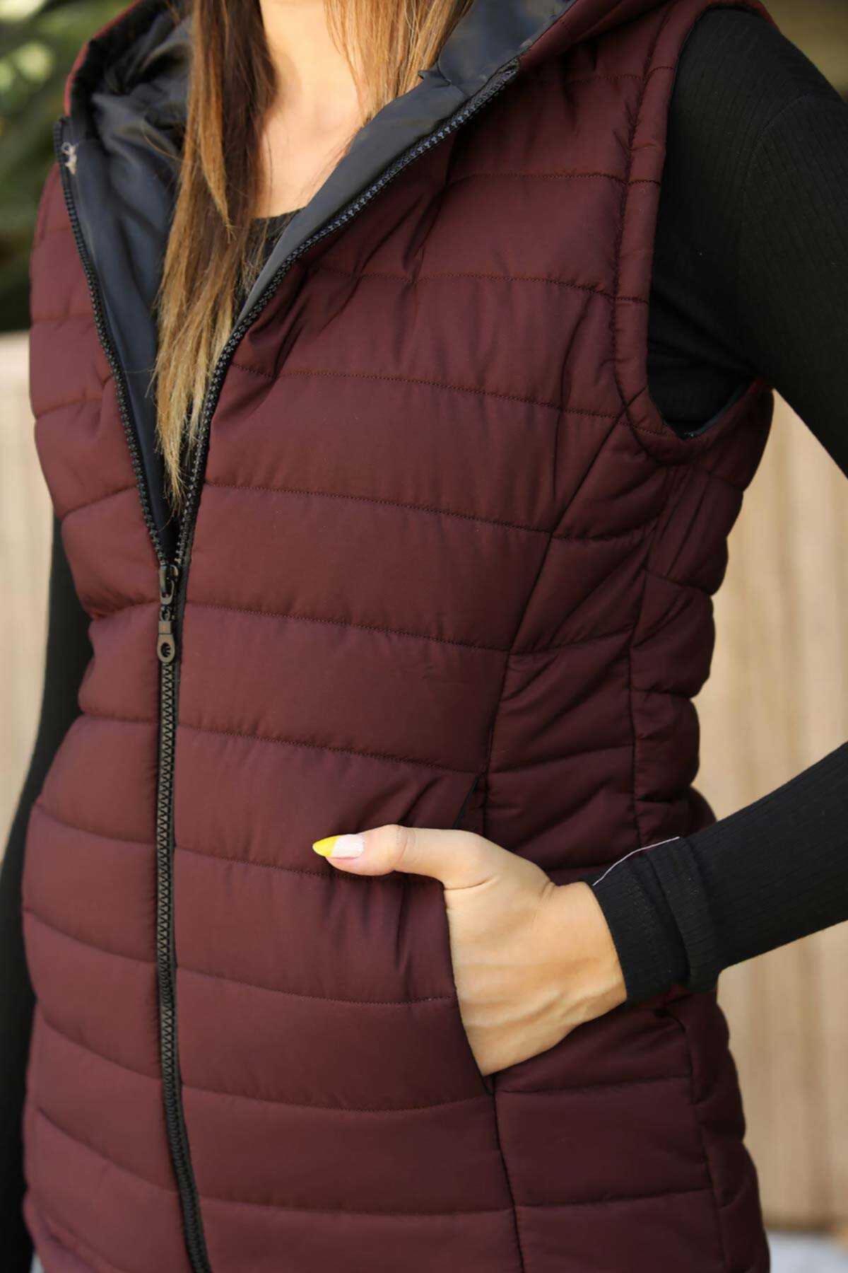 Kapşonlu Kadın Yelek Bordo