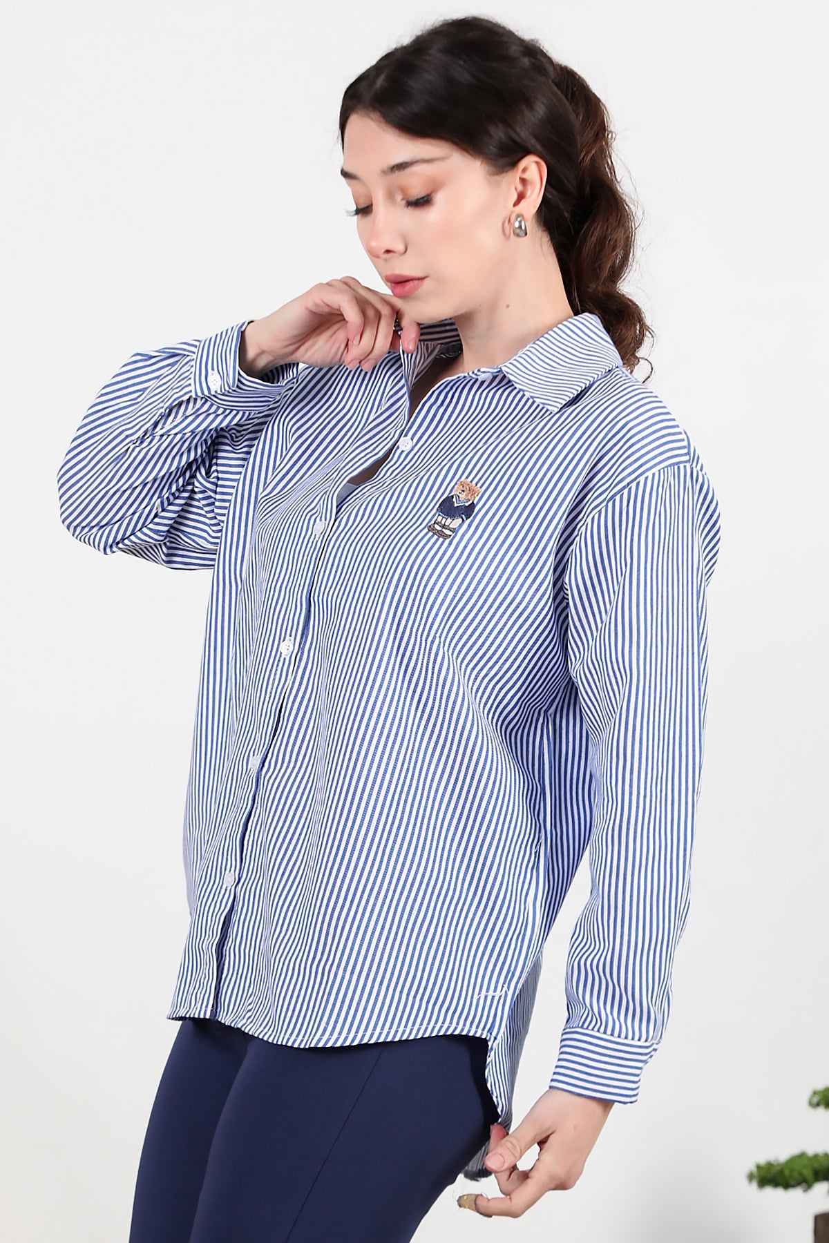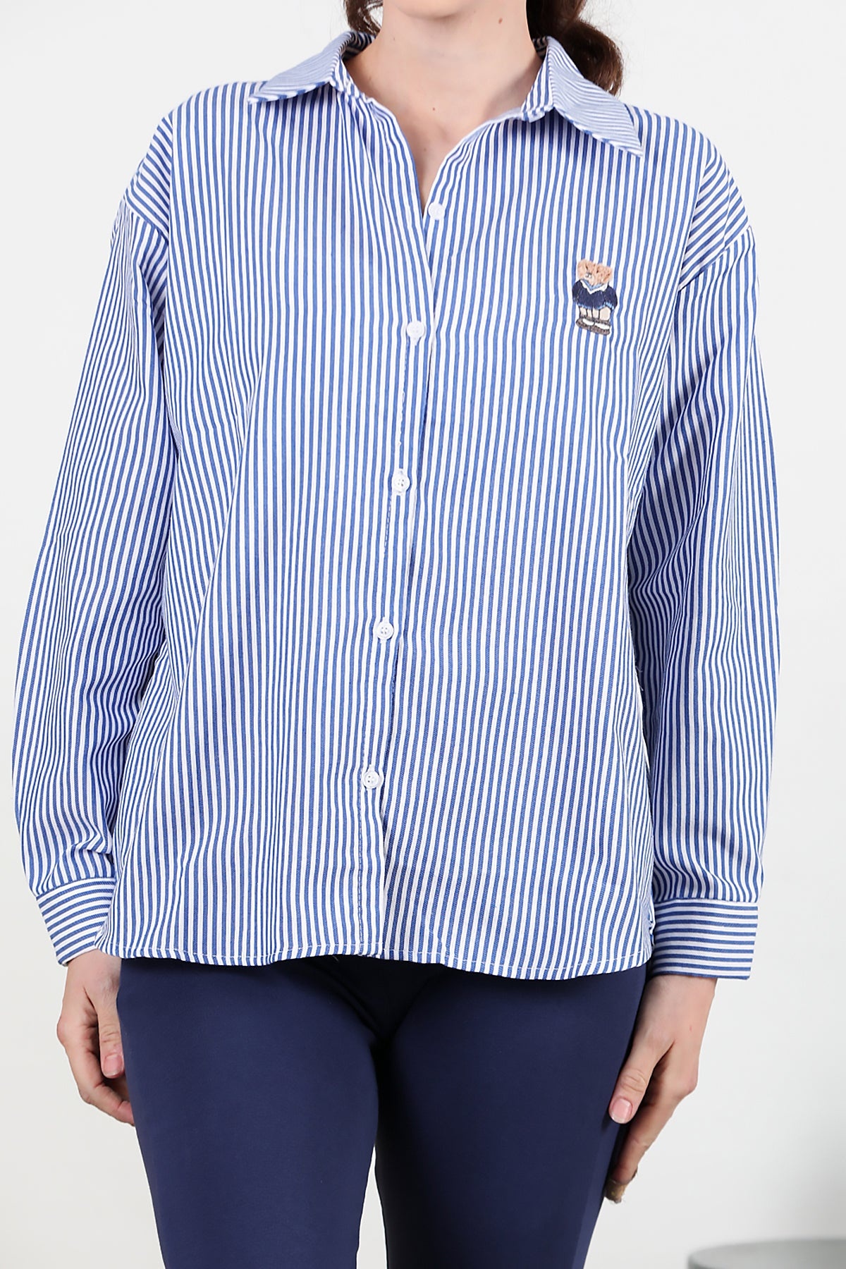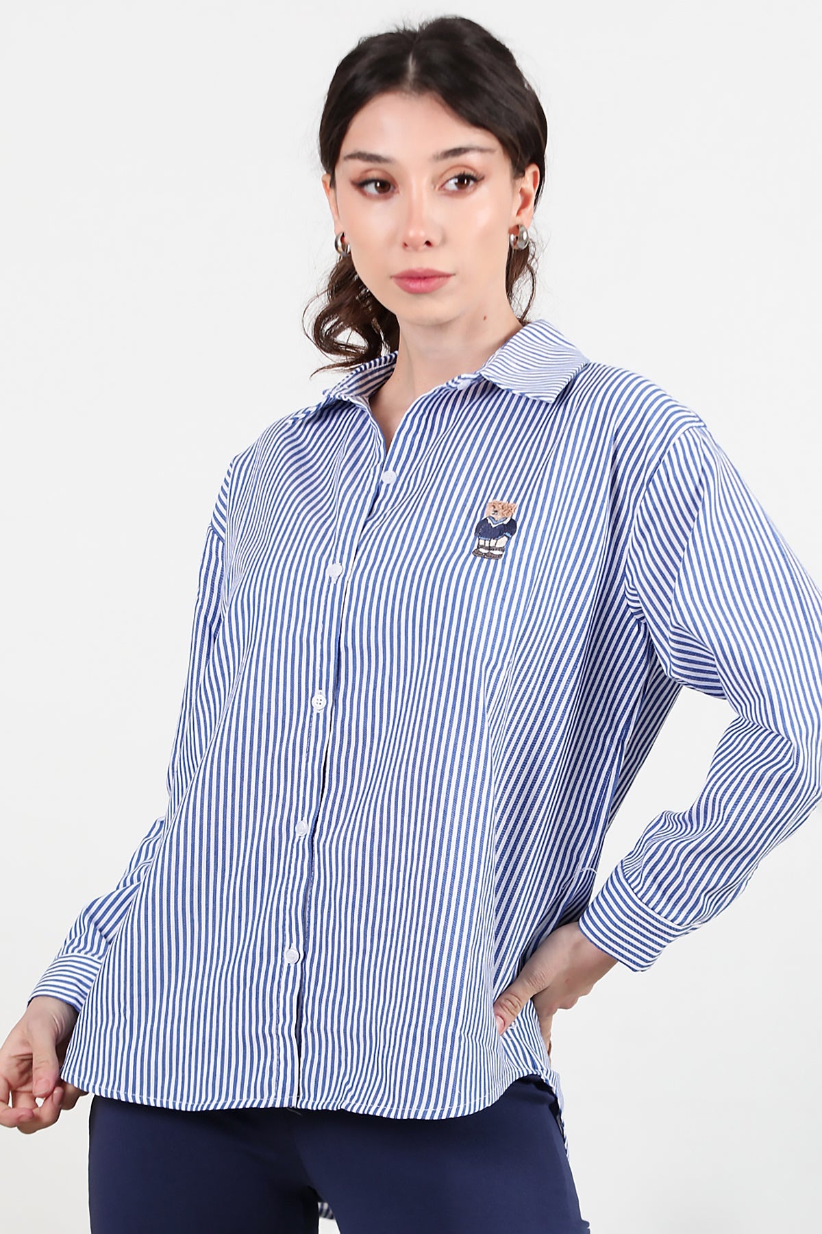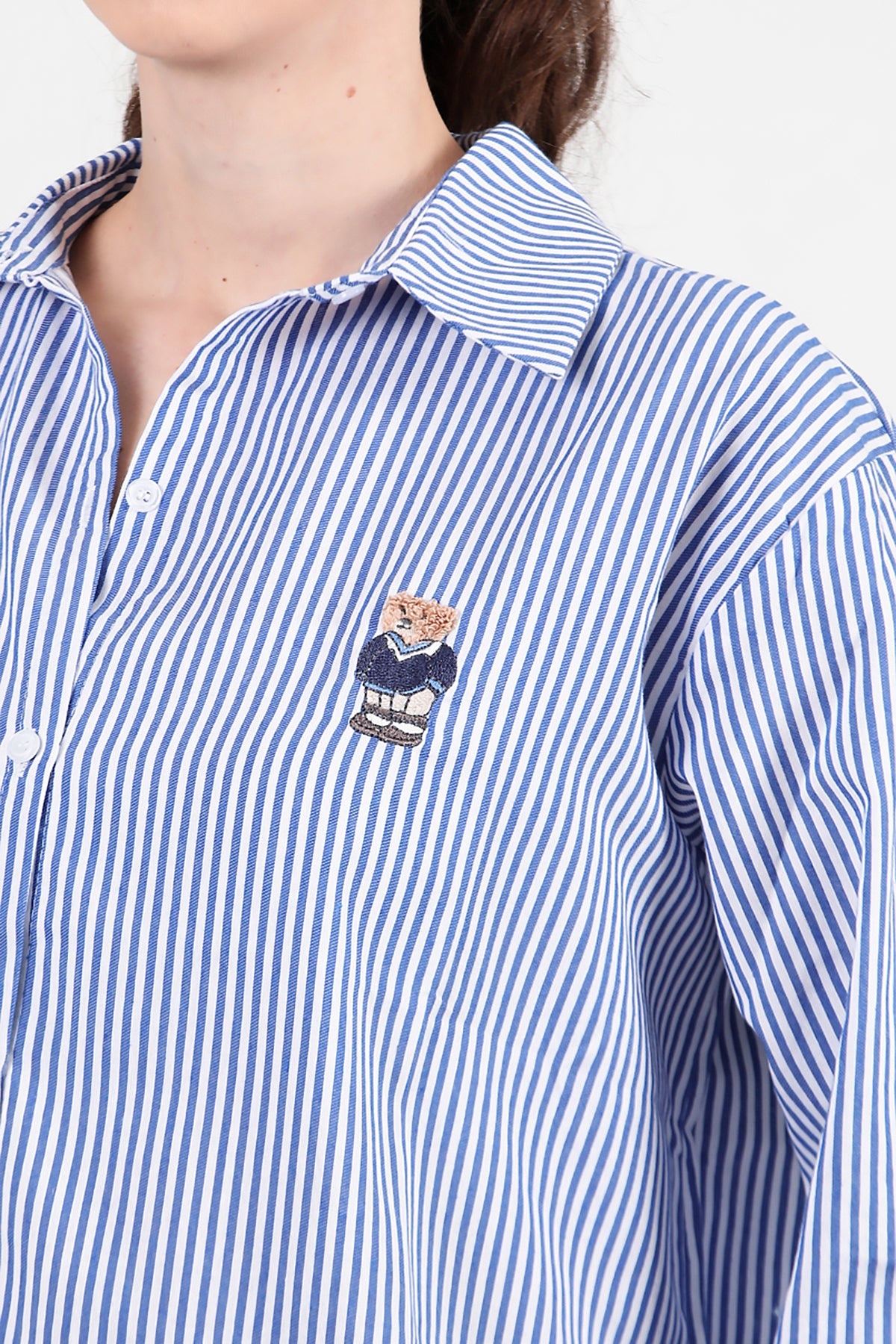 Kadın Ayıcık İşlemeli Çizgili Gömlek Mavi