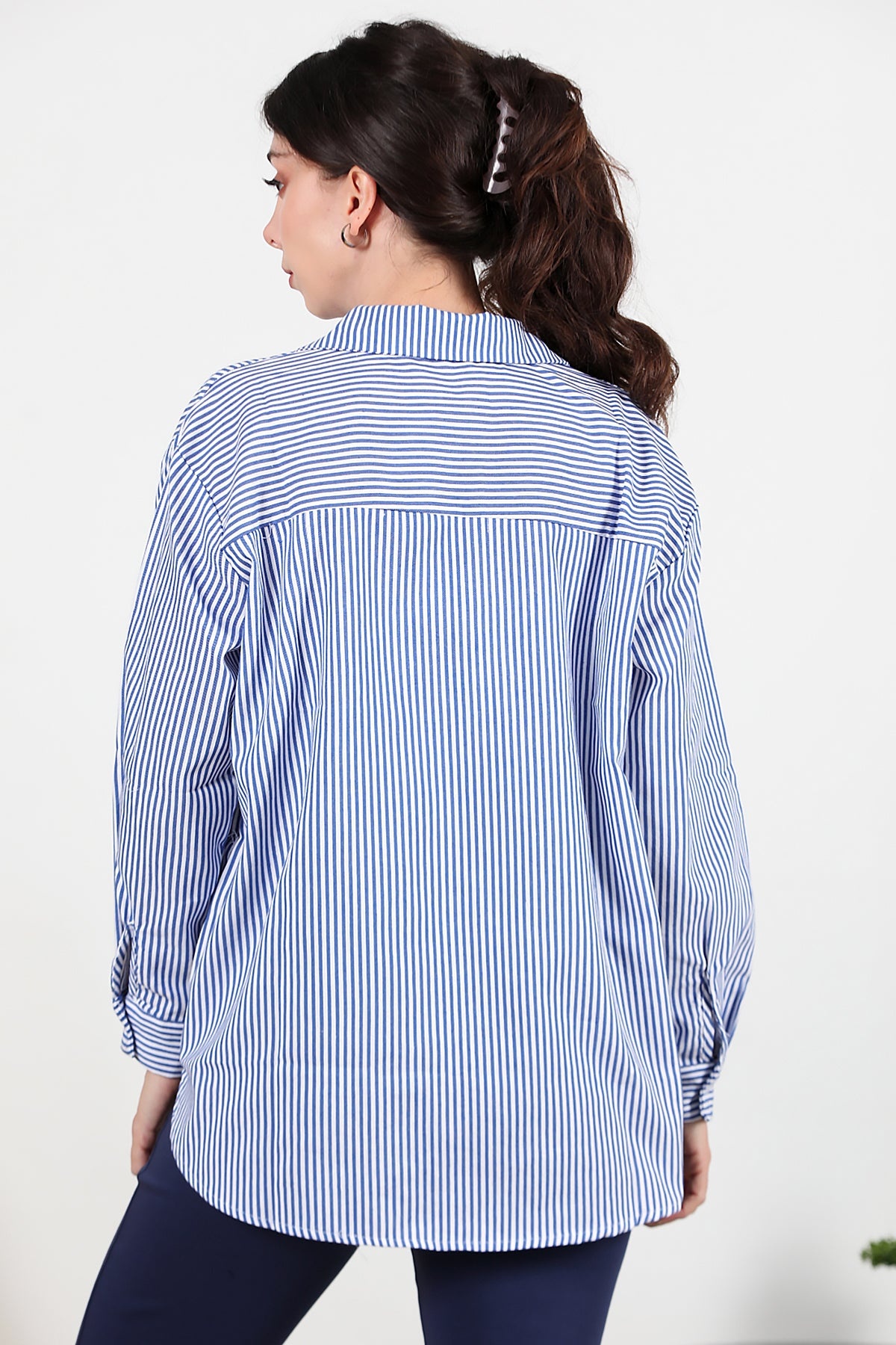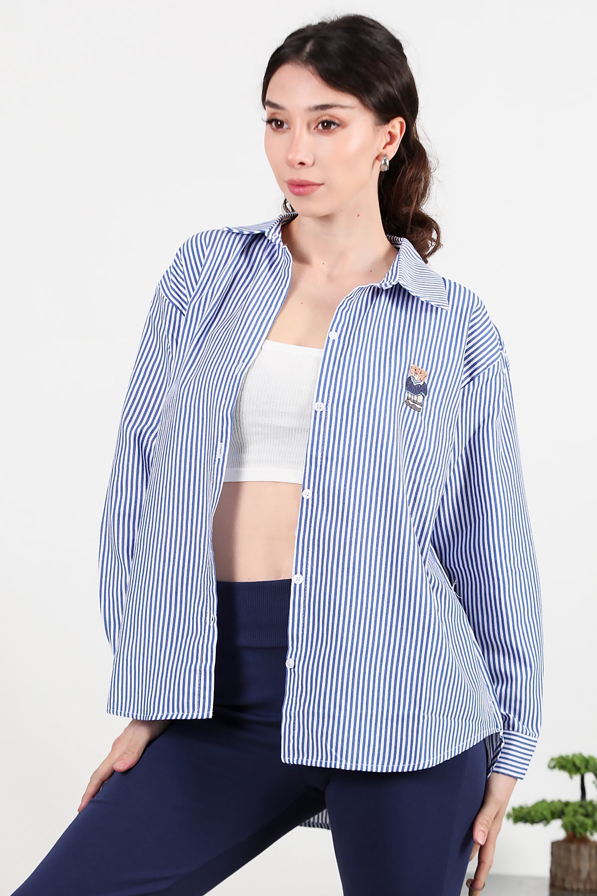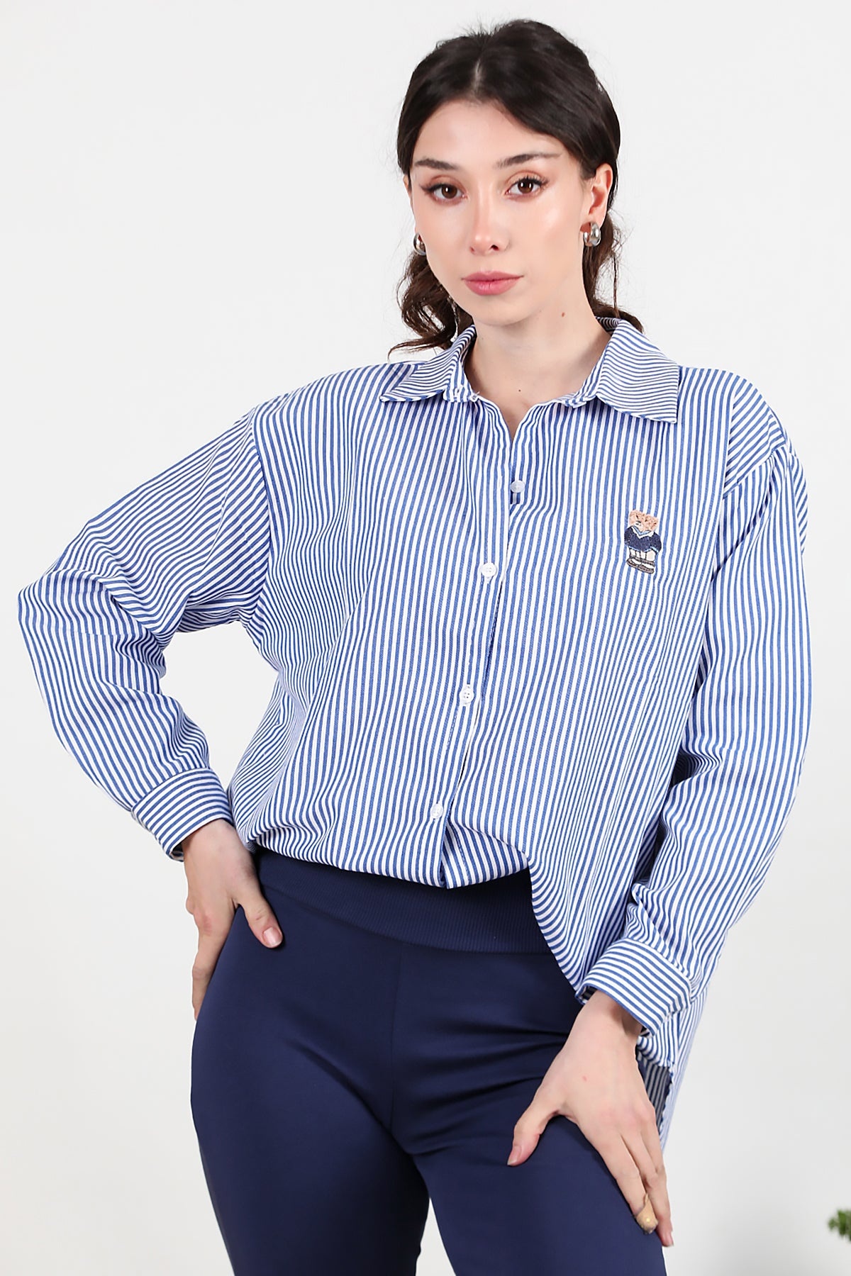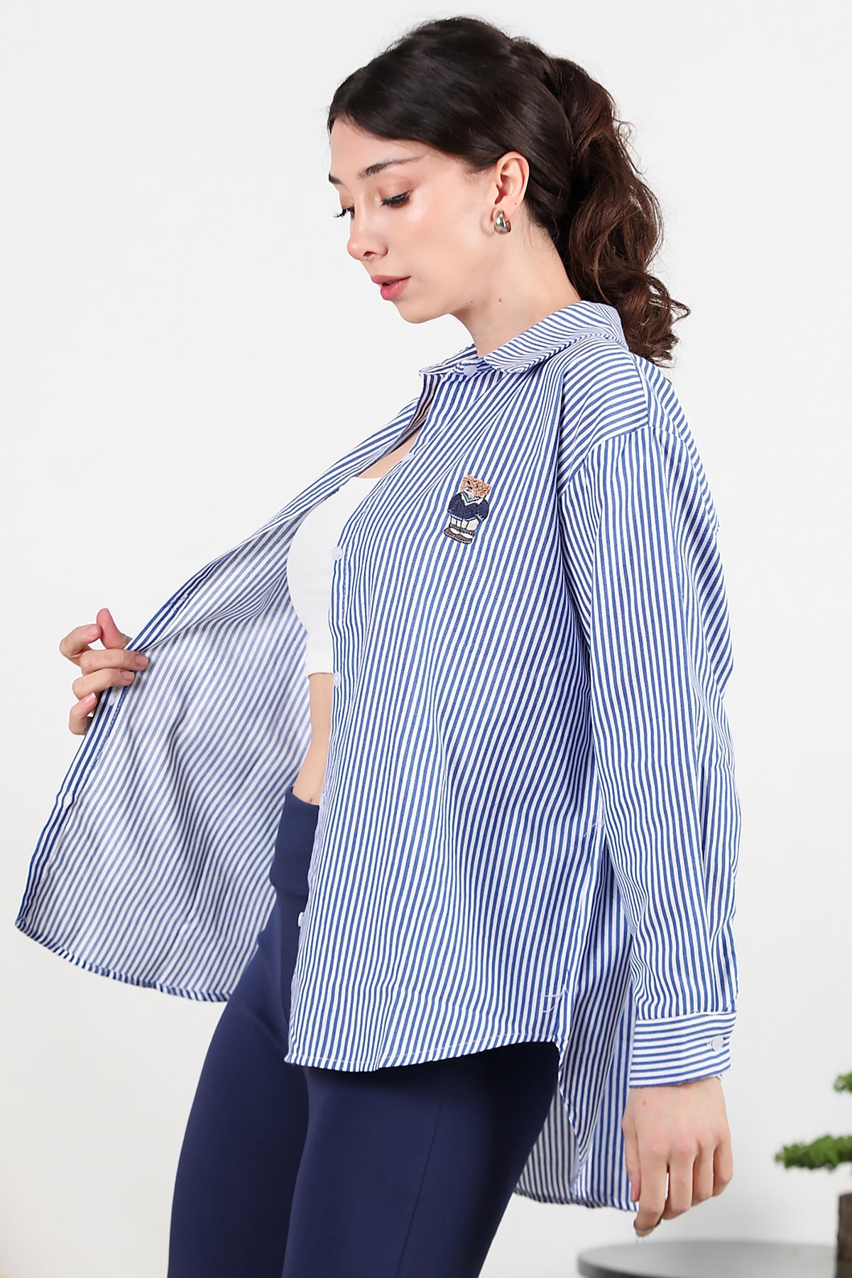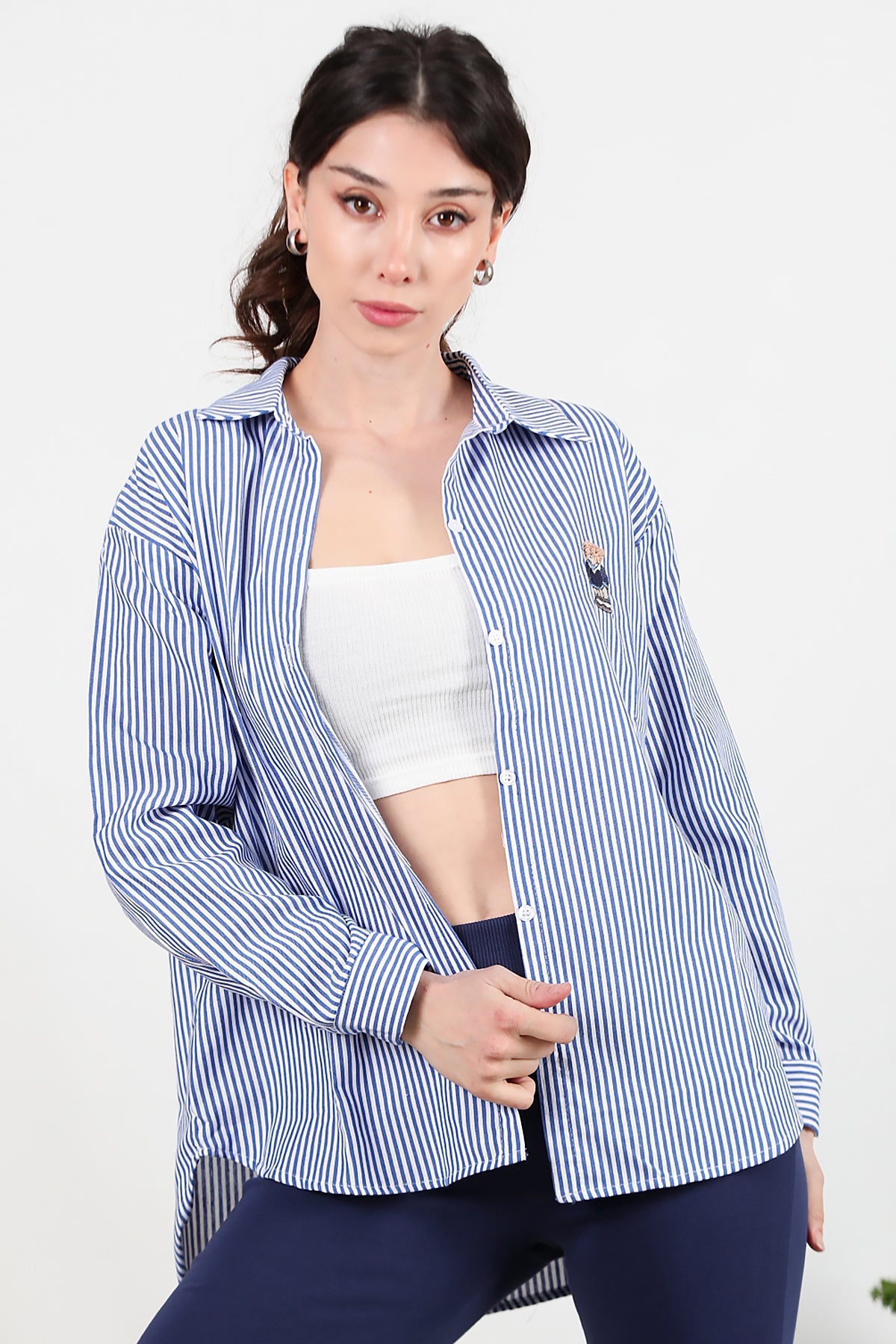 Kadın Ayıcık İşlemeli Çizgili Gömlek Mavi