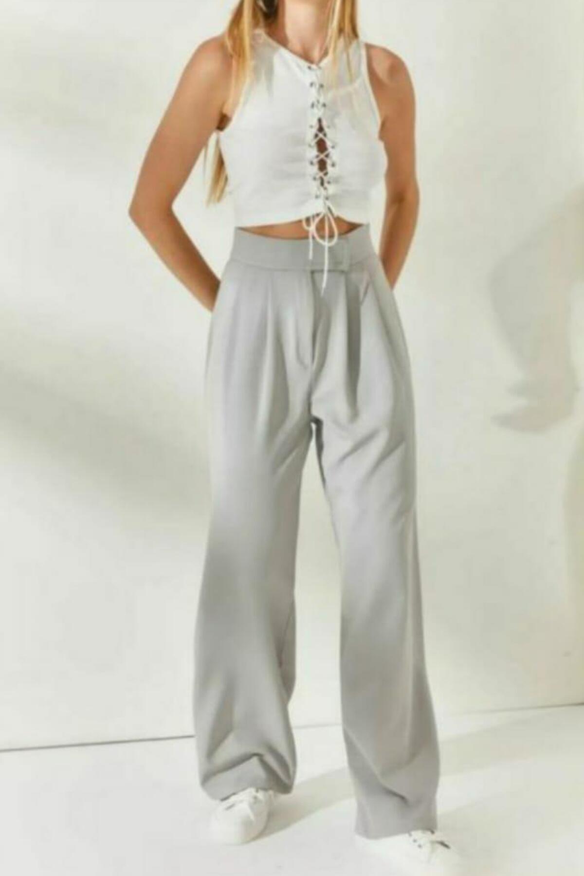 Kadın Bel Cırtlı Geniş Pantolon Gri
