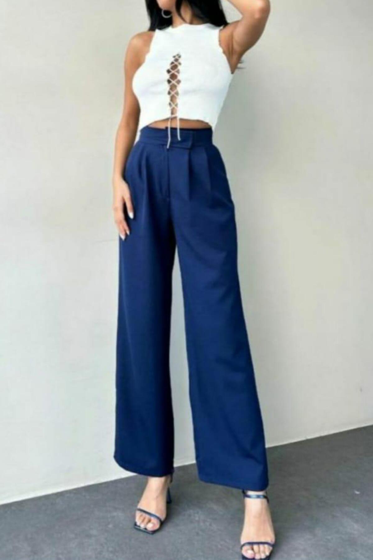 Kadın Bel Cırtlı Geniş Pantolon Lacivert