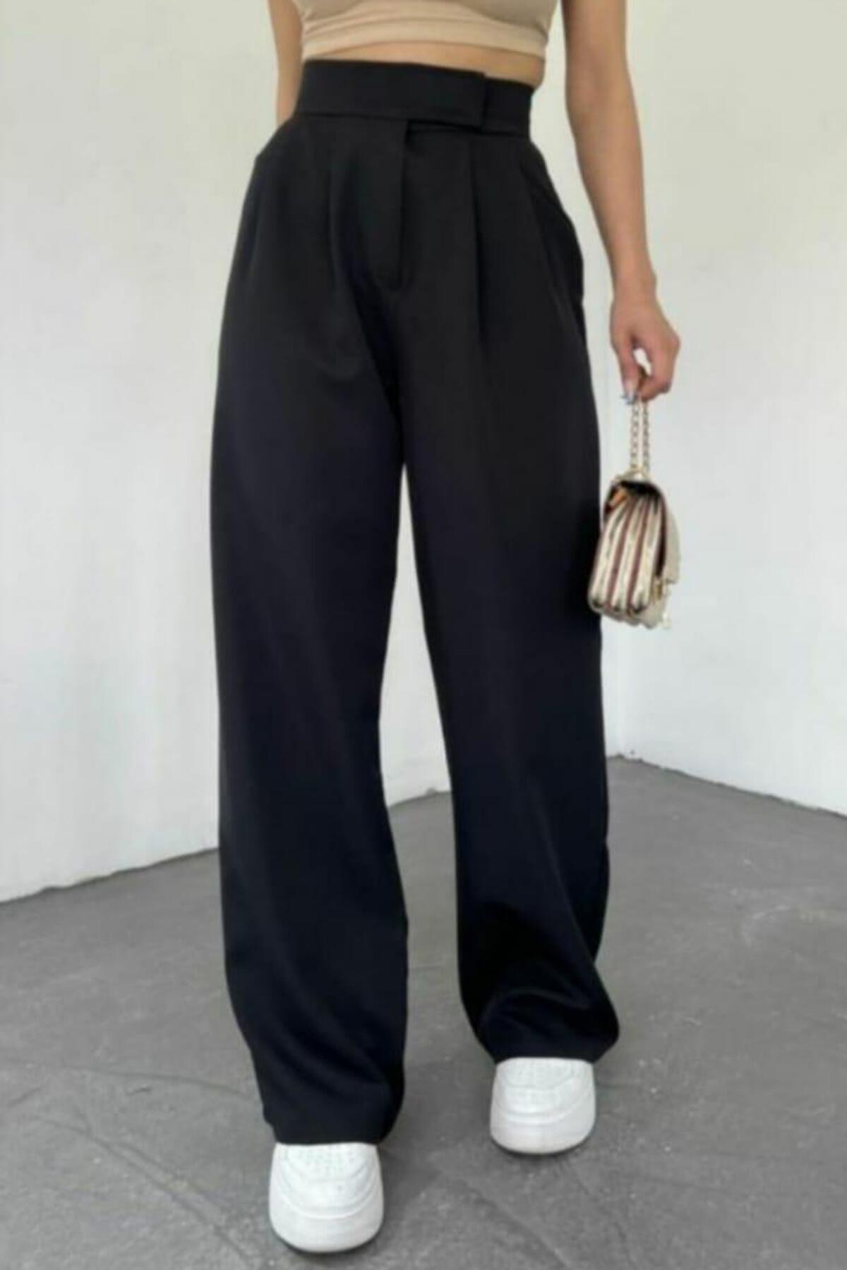 Kadın Bel Cırtlı Geniş Pantolon Siyah