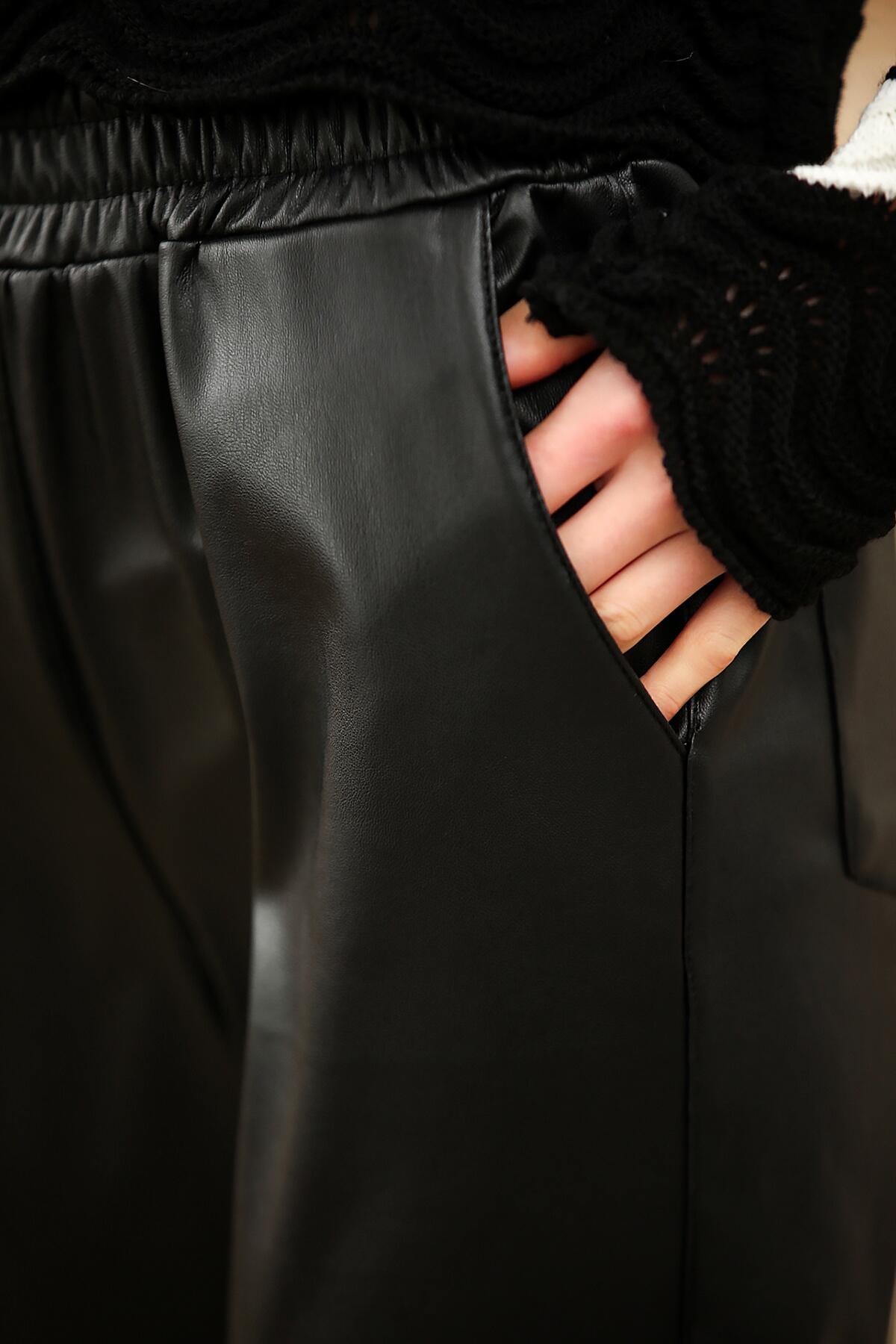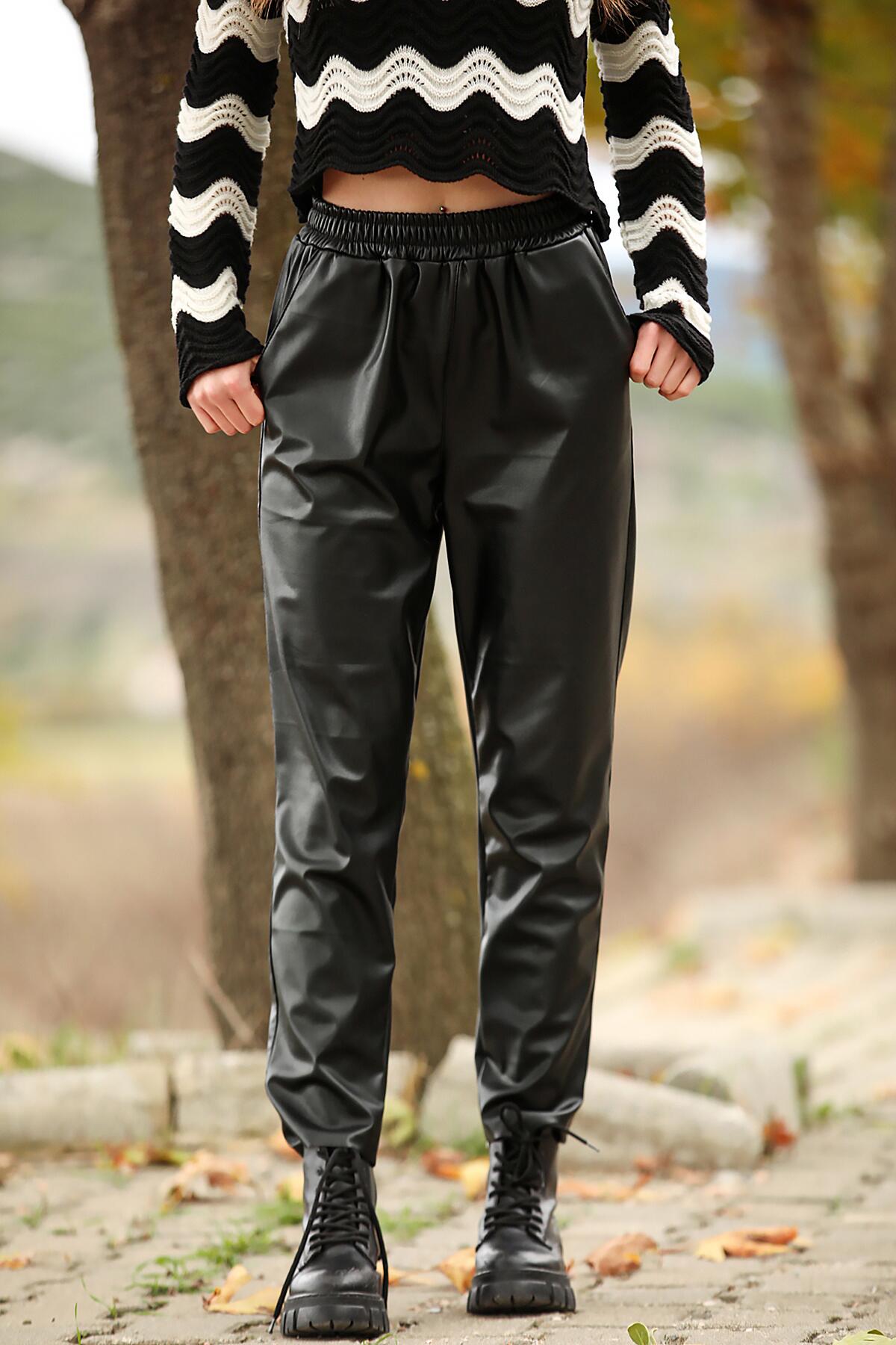 Kadın Bel Lastikli Deri Pantolon Siyah