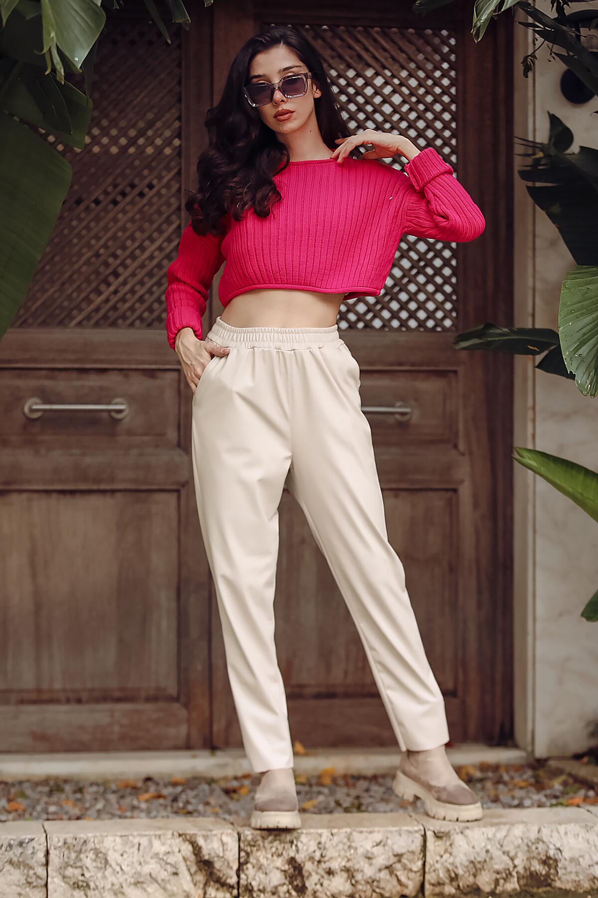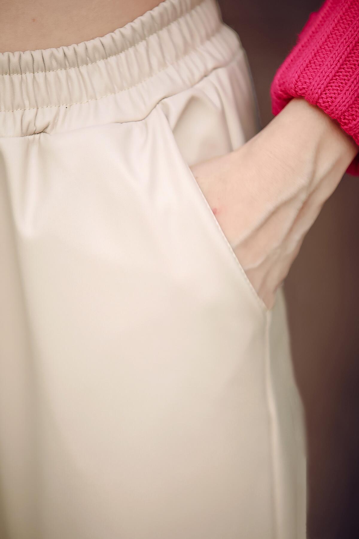 Kadın Bel Lastikli Deri Pantolon