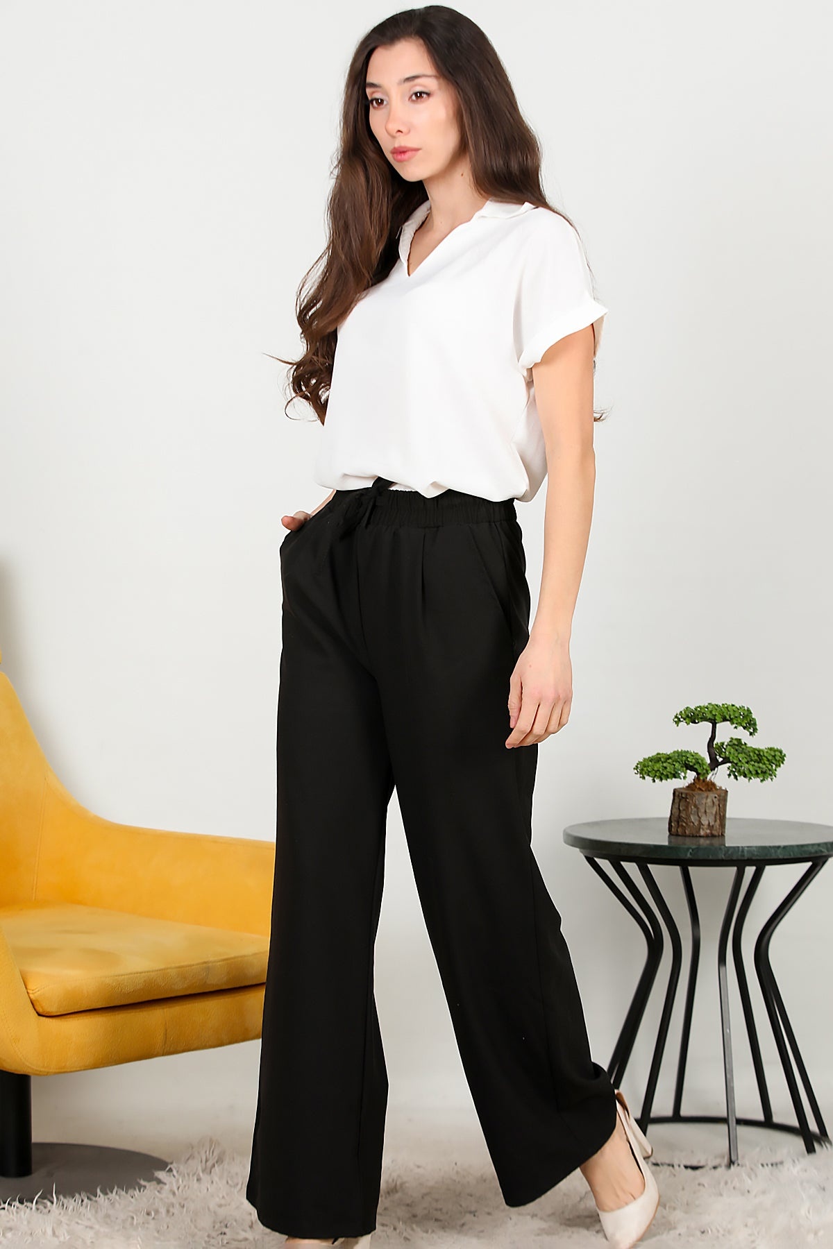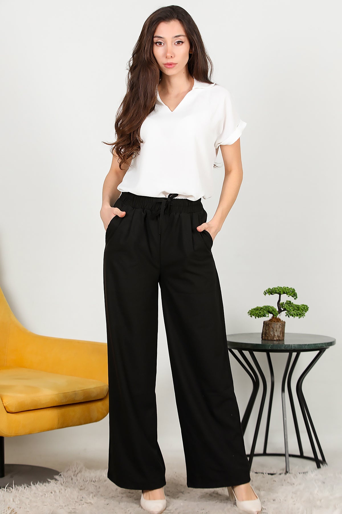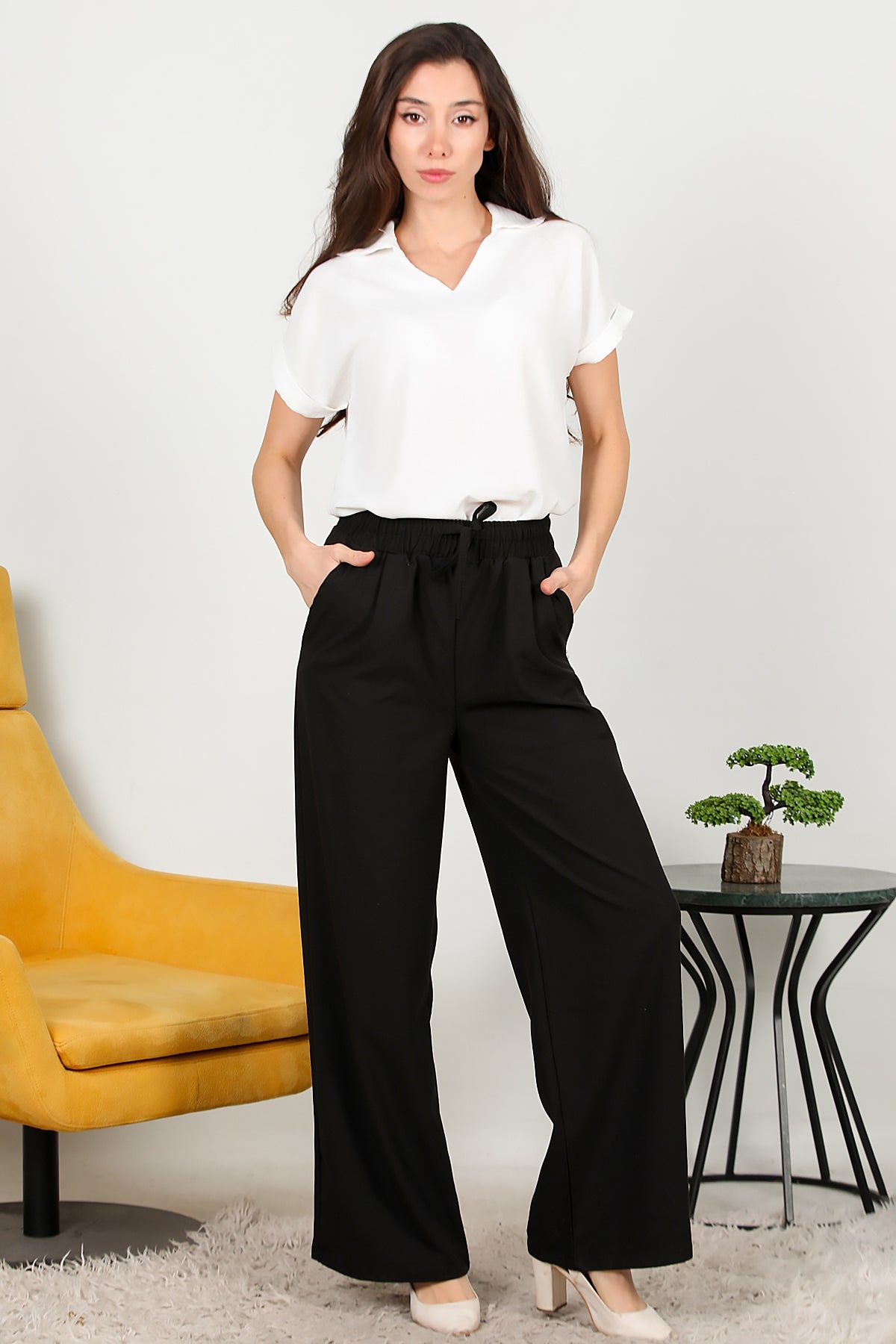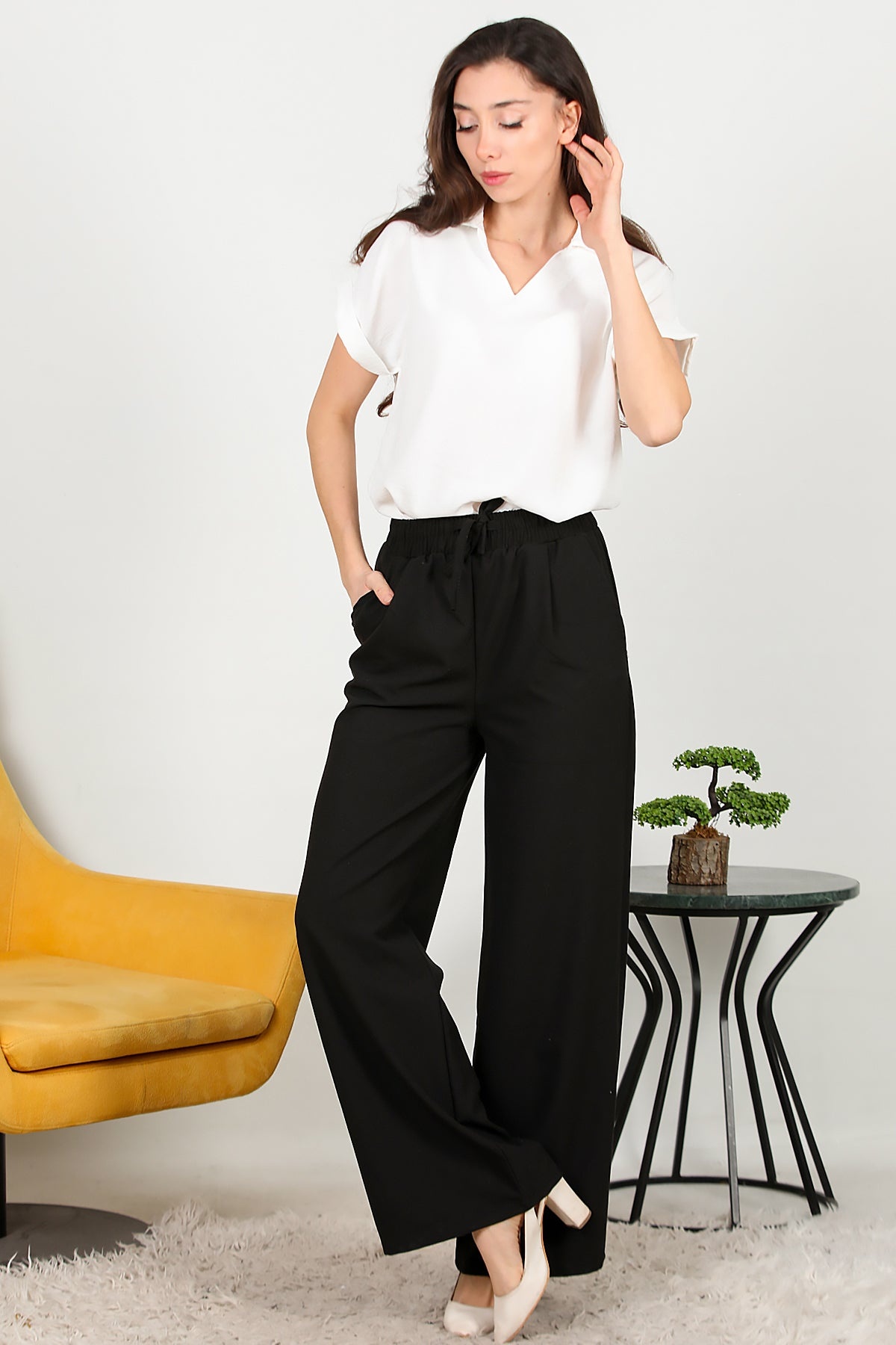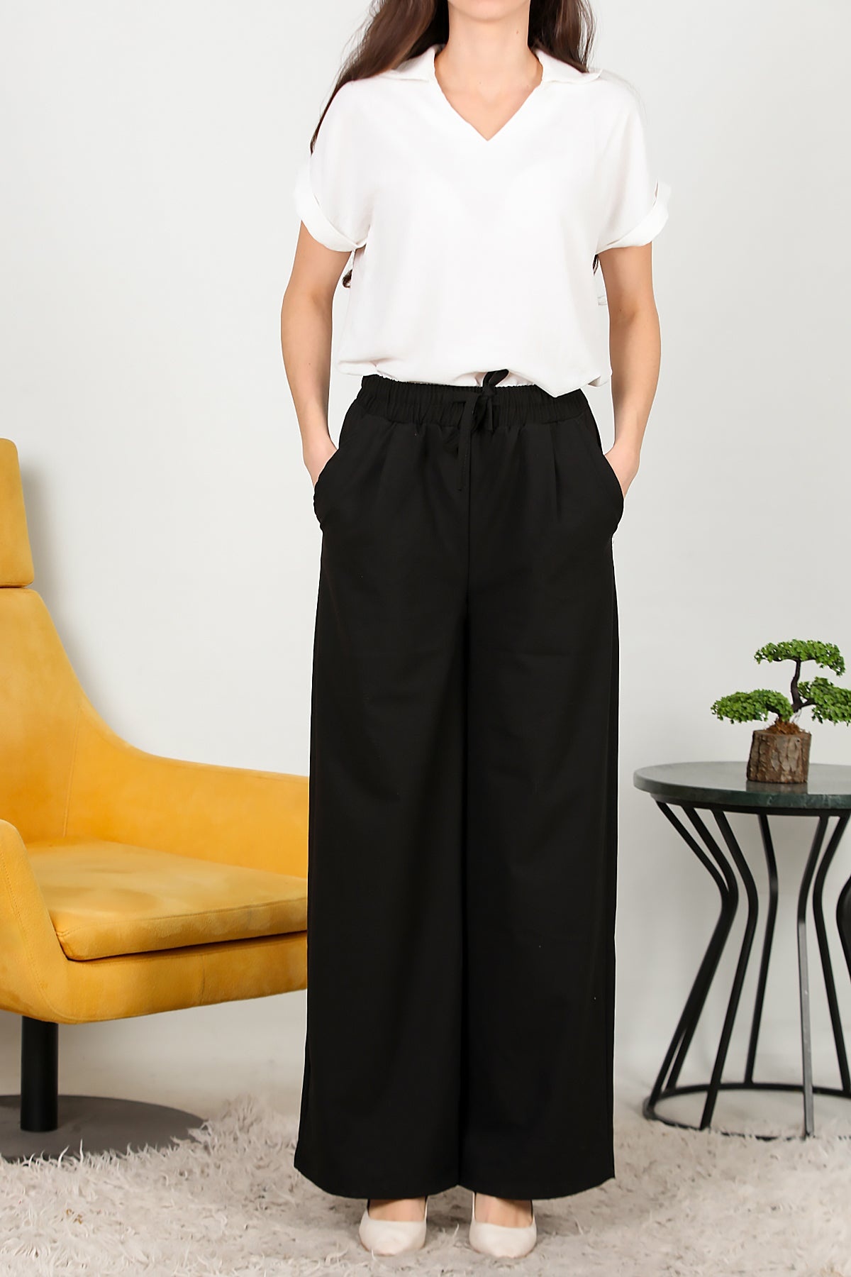Kadın Beli Lastikli Pile Detaylı Bol Paça Kumaş Pantolon Siyah