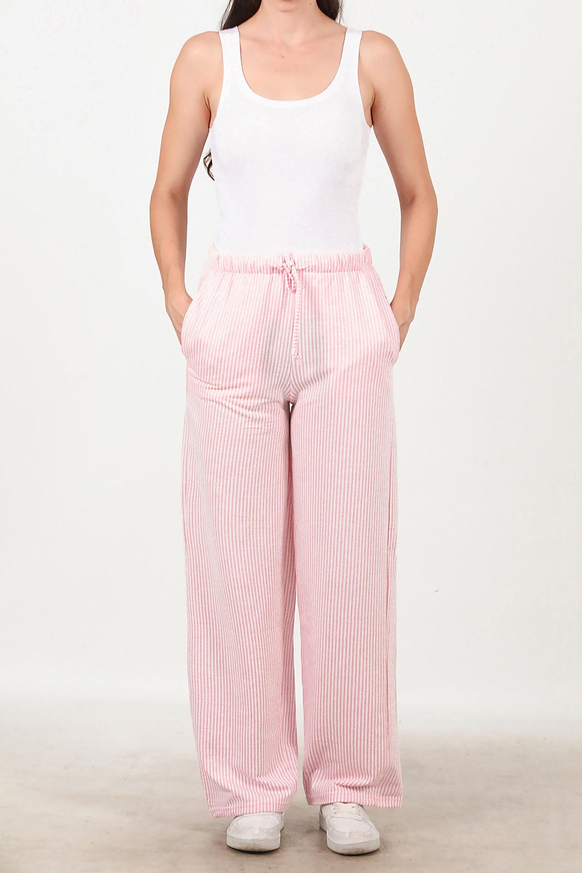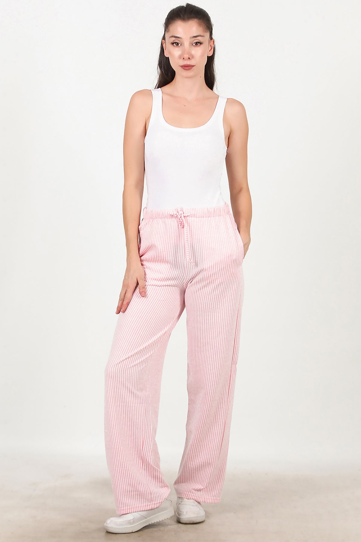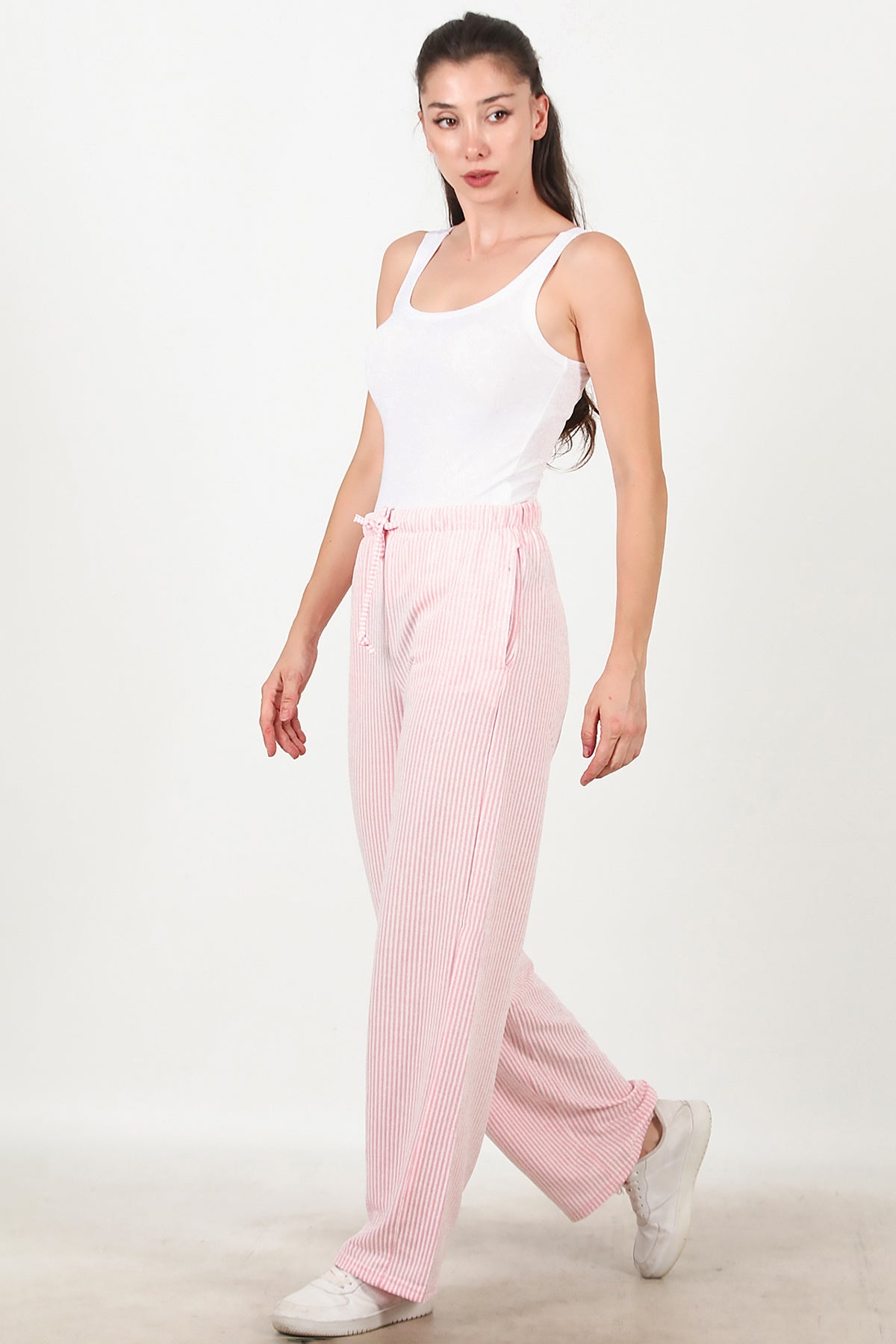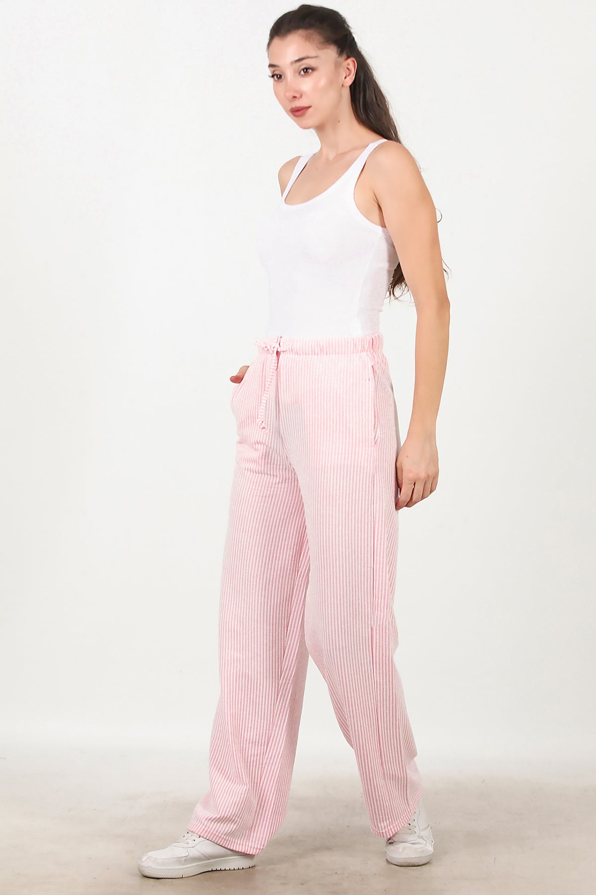 Kadın Çizgili Bol Paça Pantolon Pembe