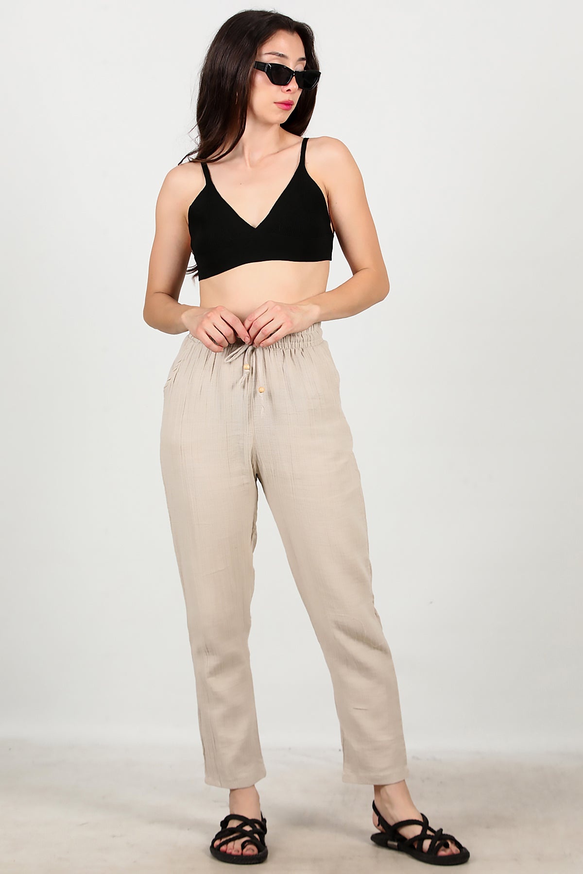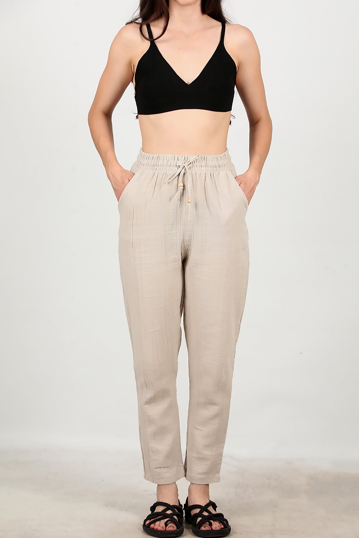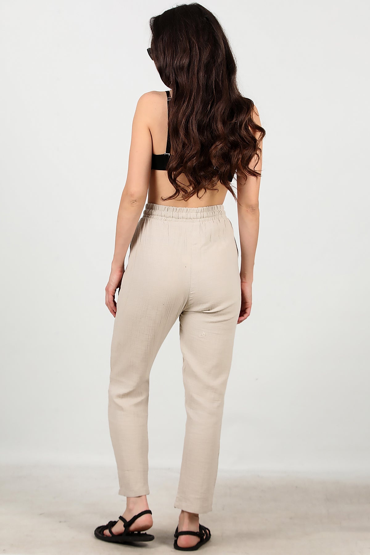 Kadın Dar Paça İnce Keten Pantolon Taş