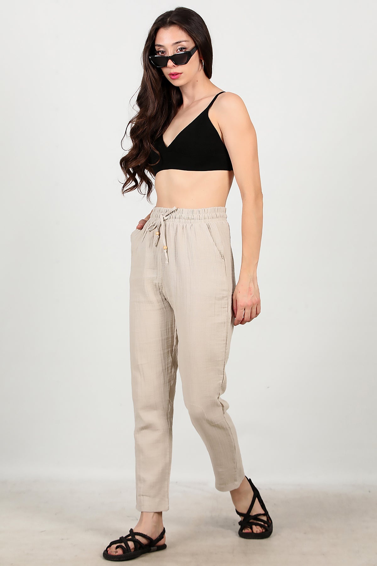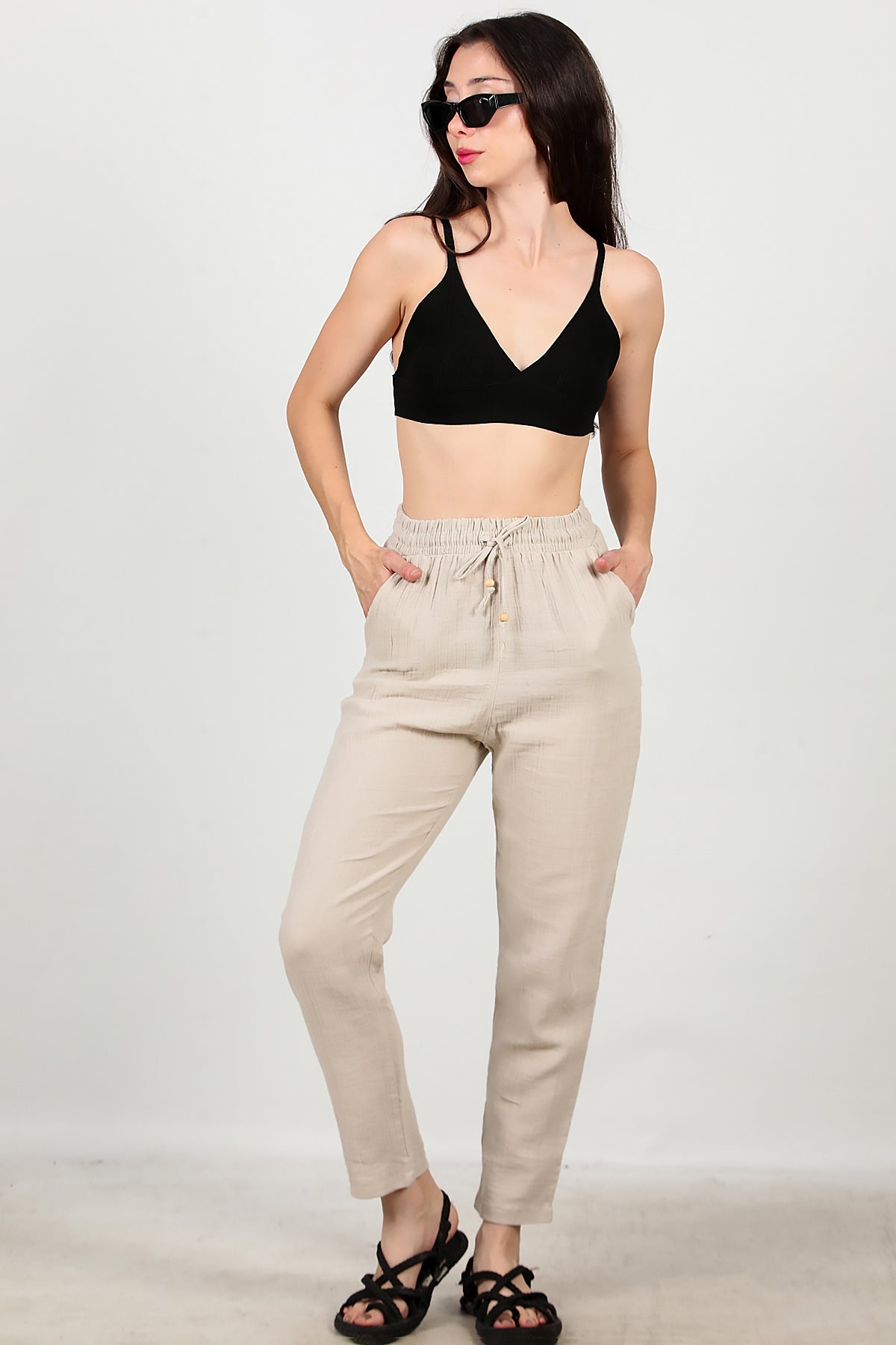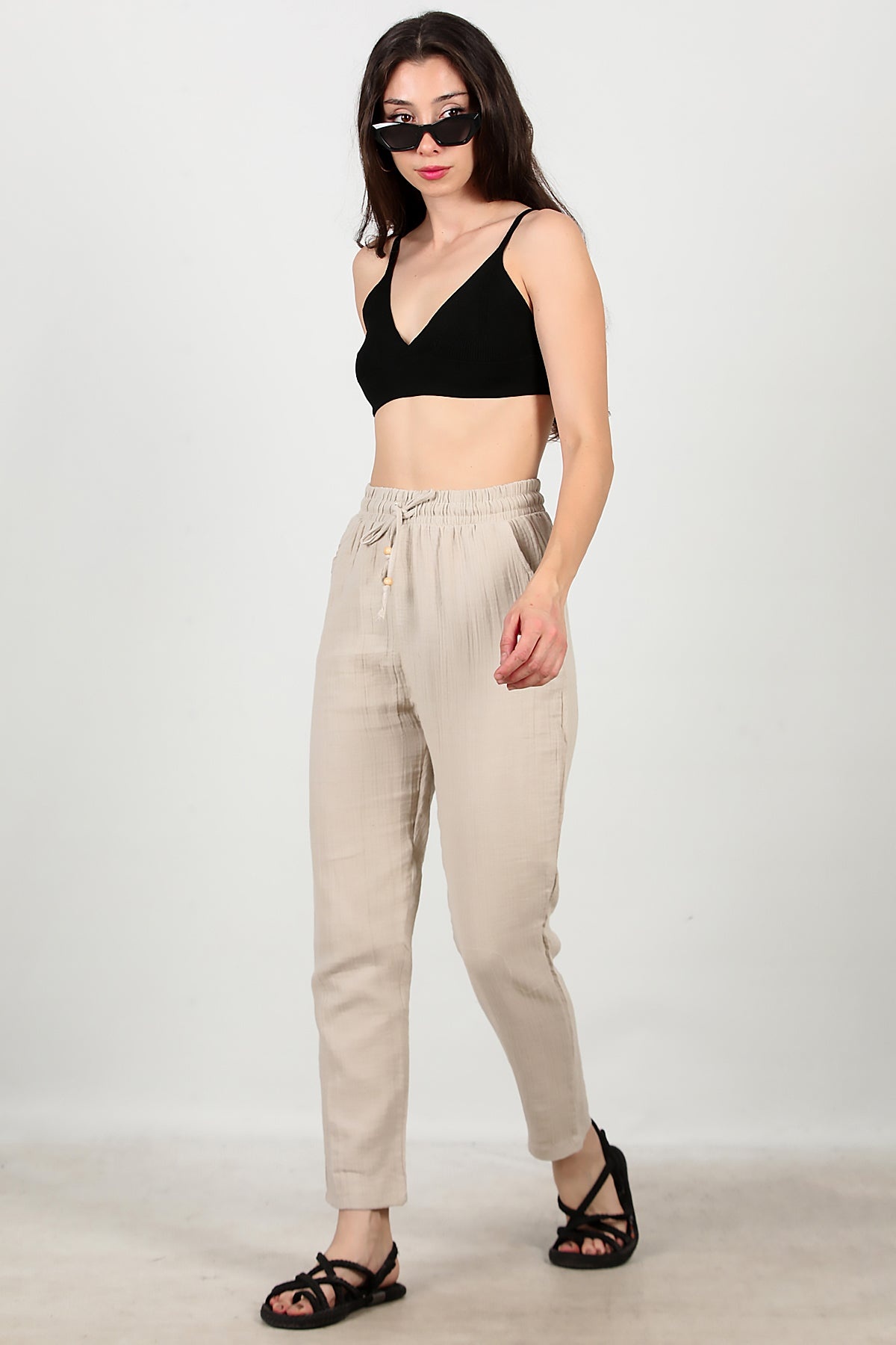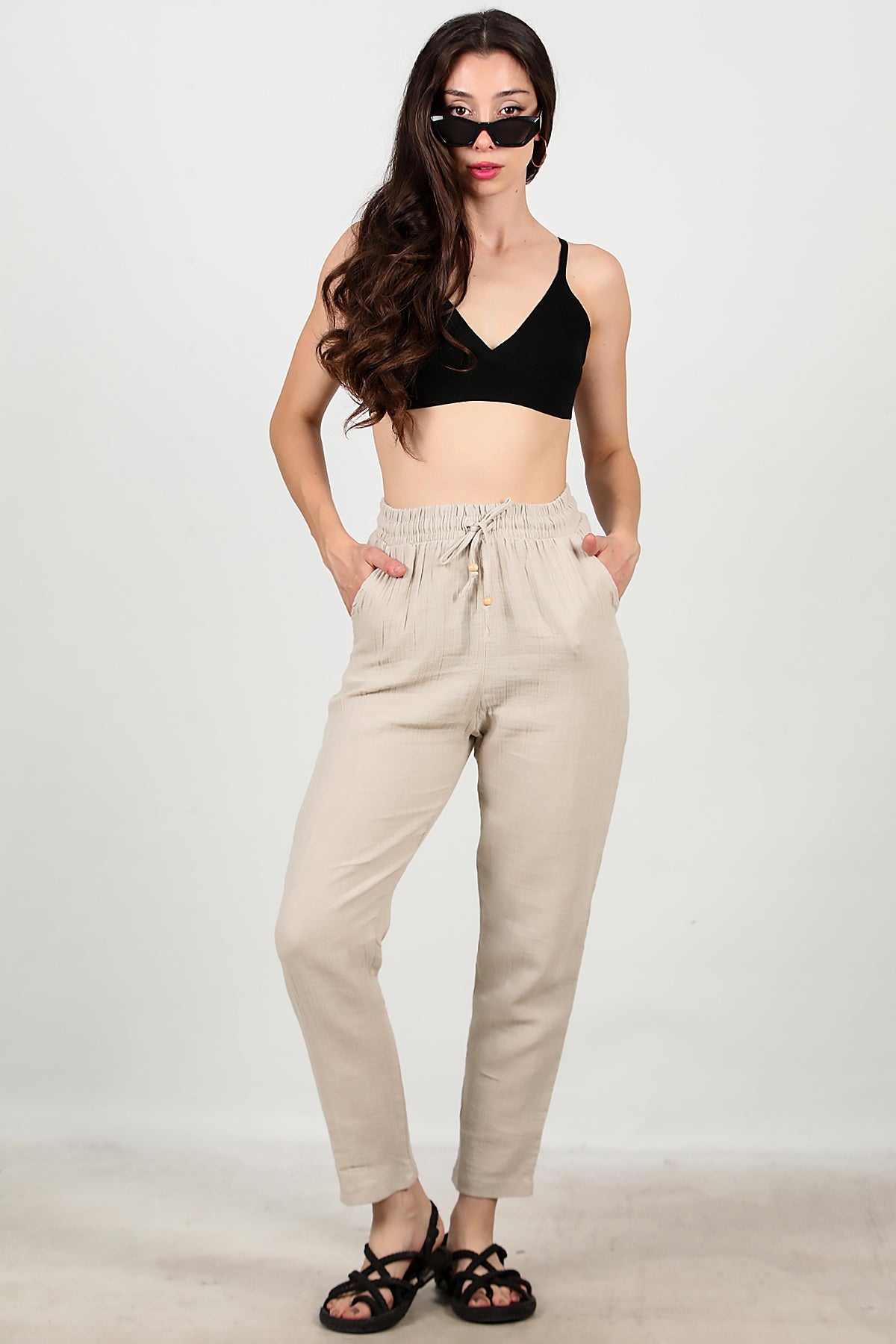 Kadın Dar Paça İnce Keten Pantolon Taş