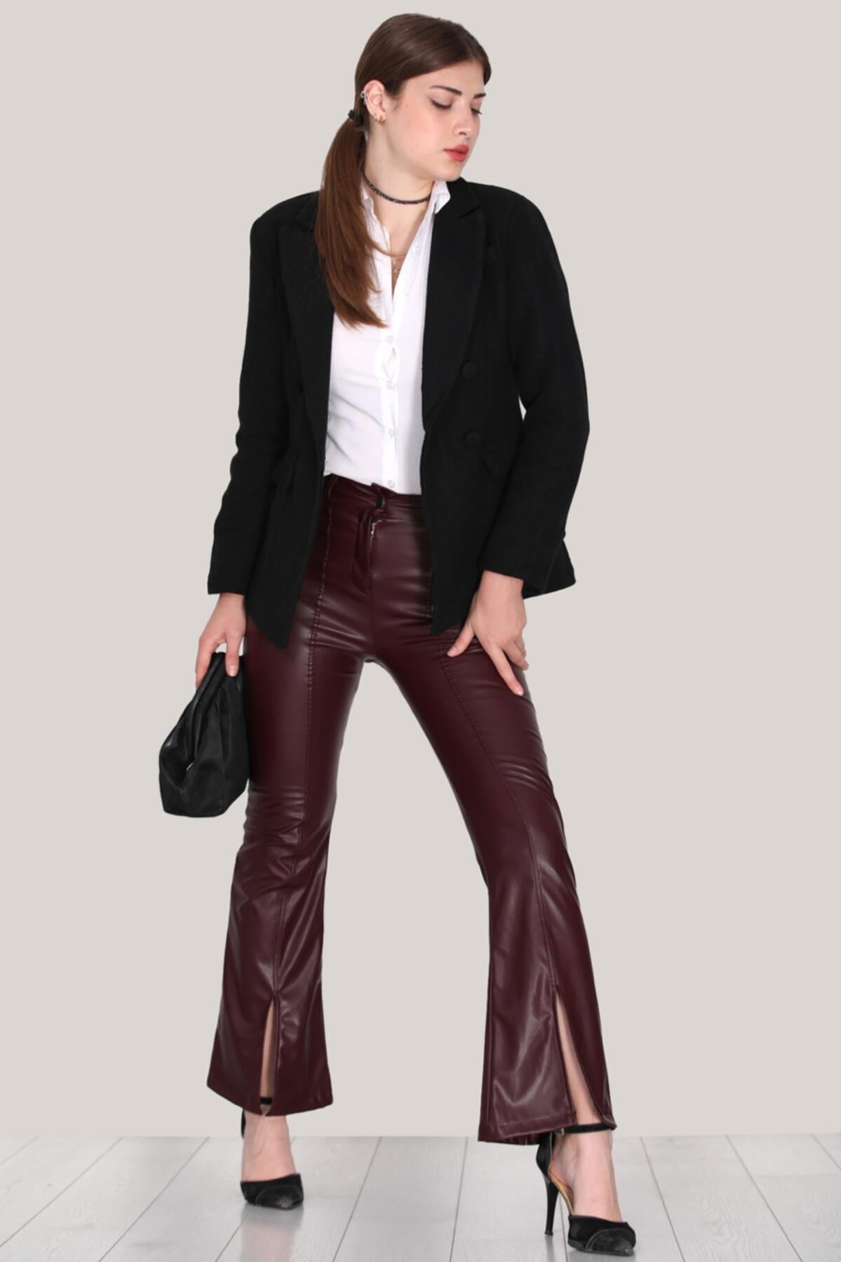 Kadın İçi Polarlı Yırmaçlı Deri Pantolon Bordo