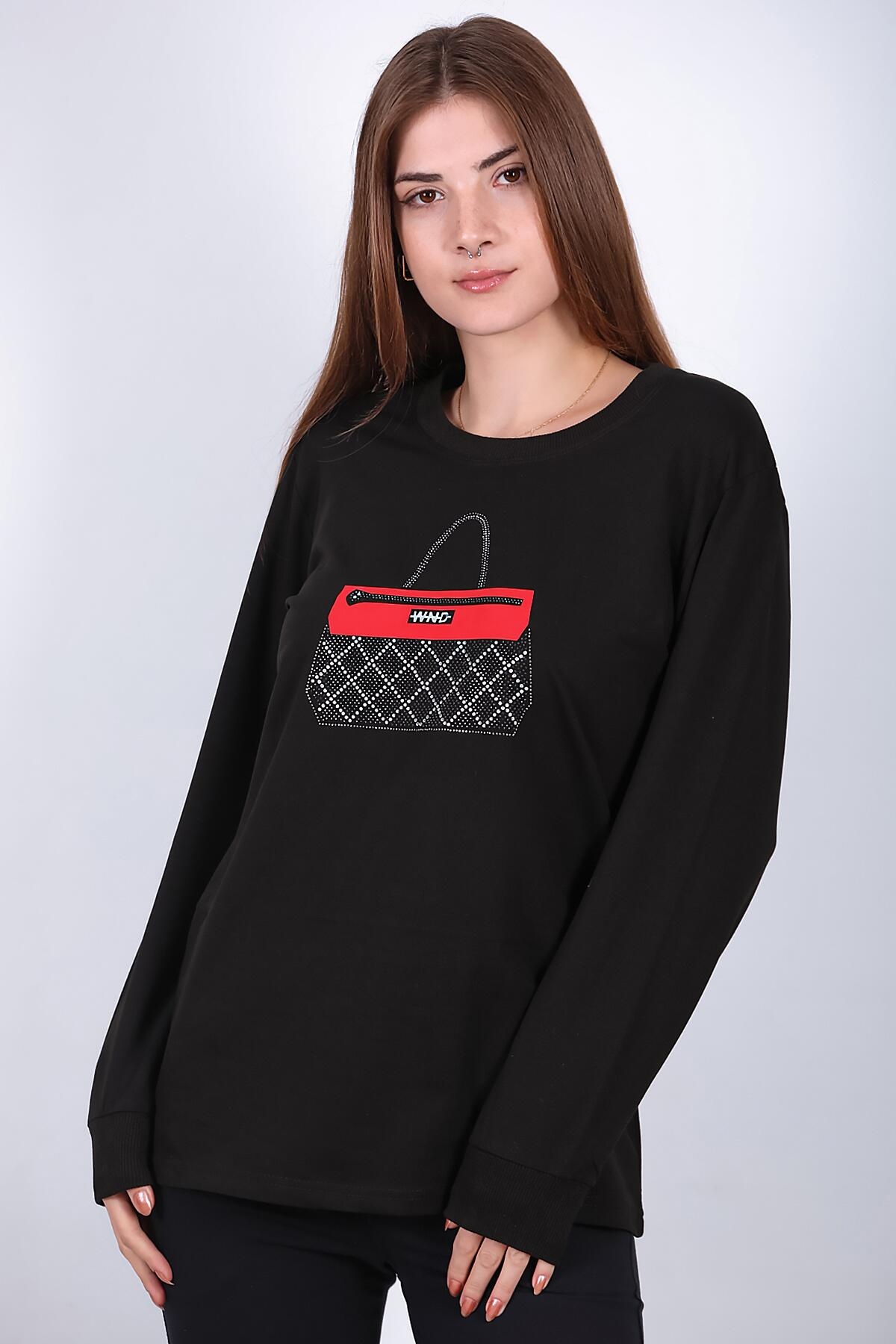 Kadın Bisiklet Yaka Baskılı Sweat Siyah