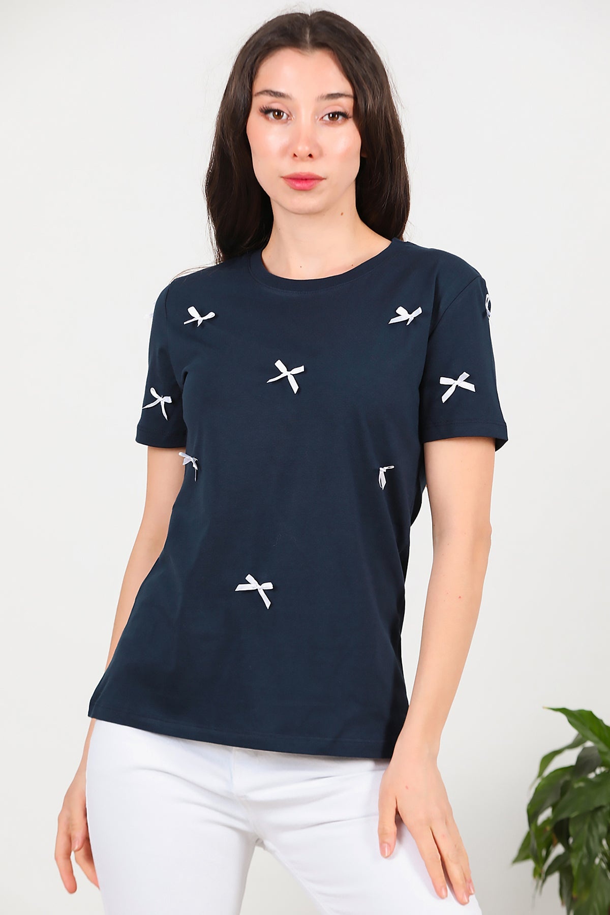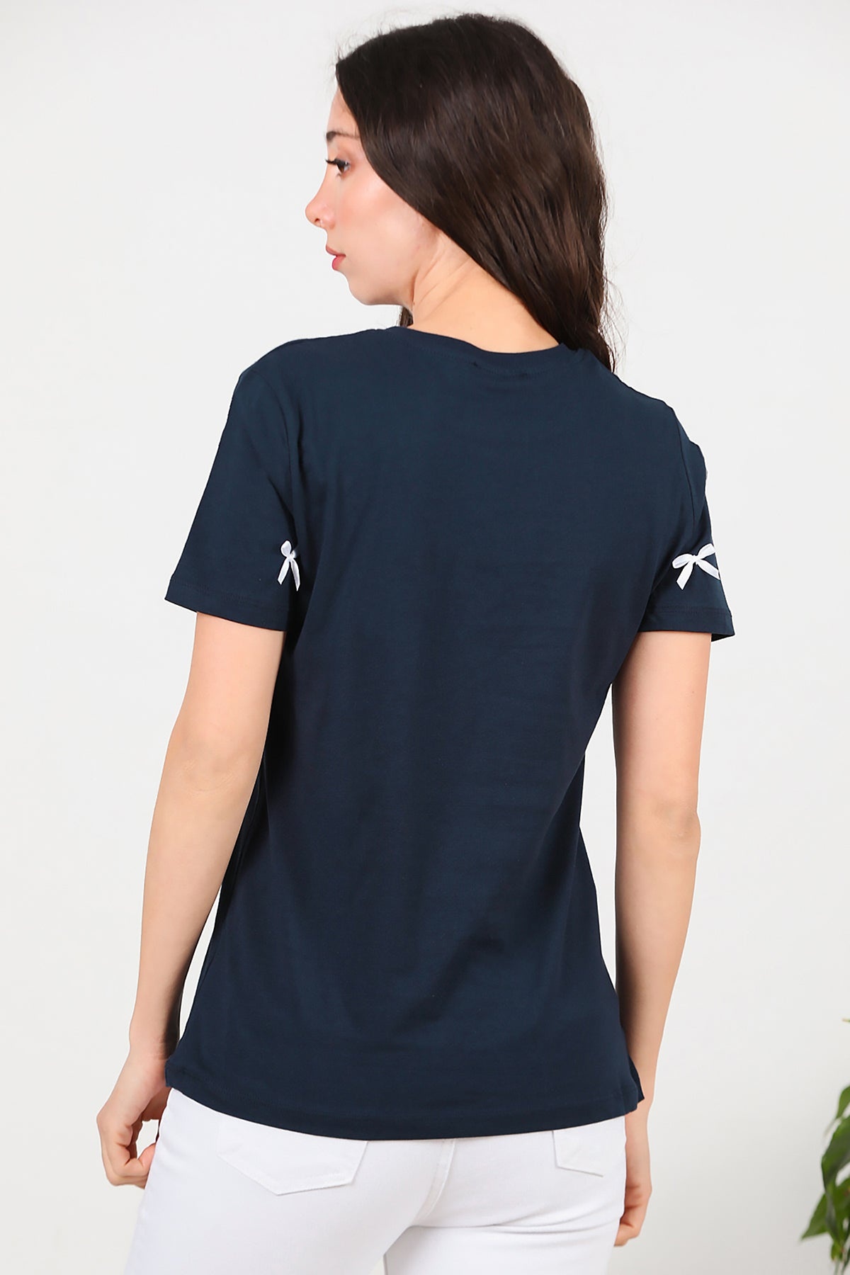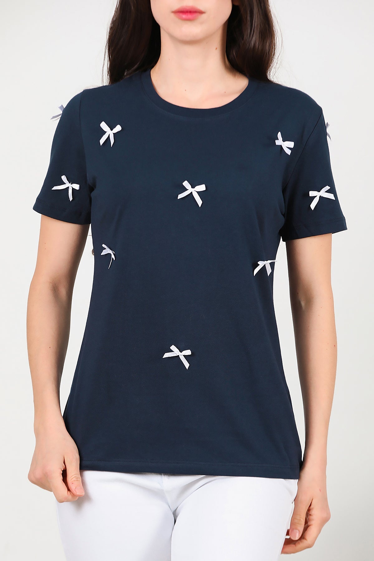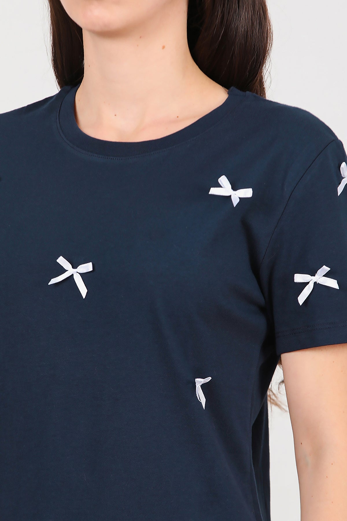 Kadın Bisiklet Yaka Fiyonklu Tshırt Lacivert