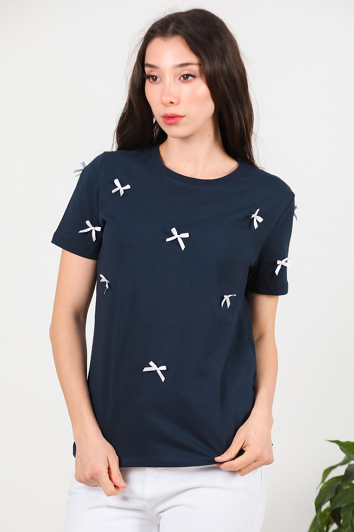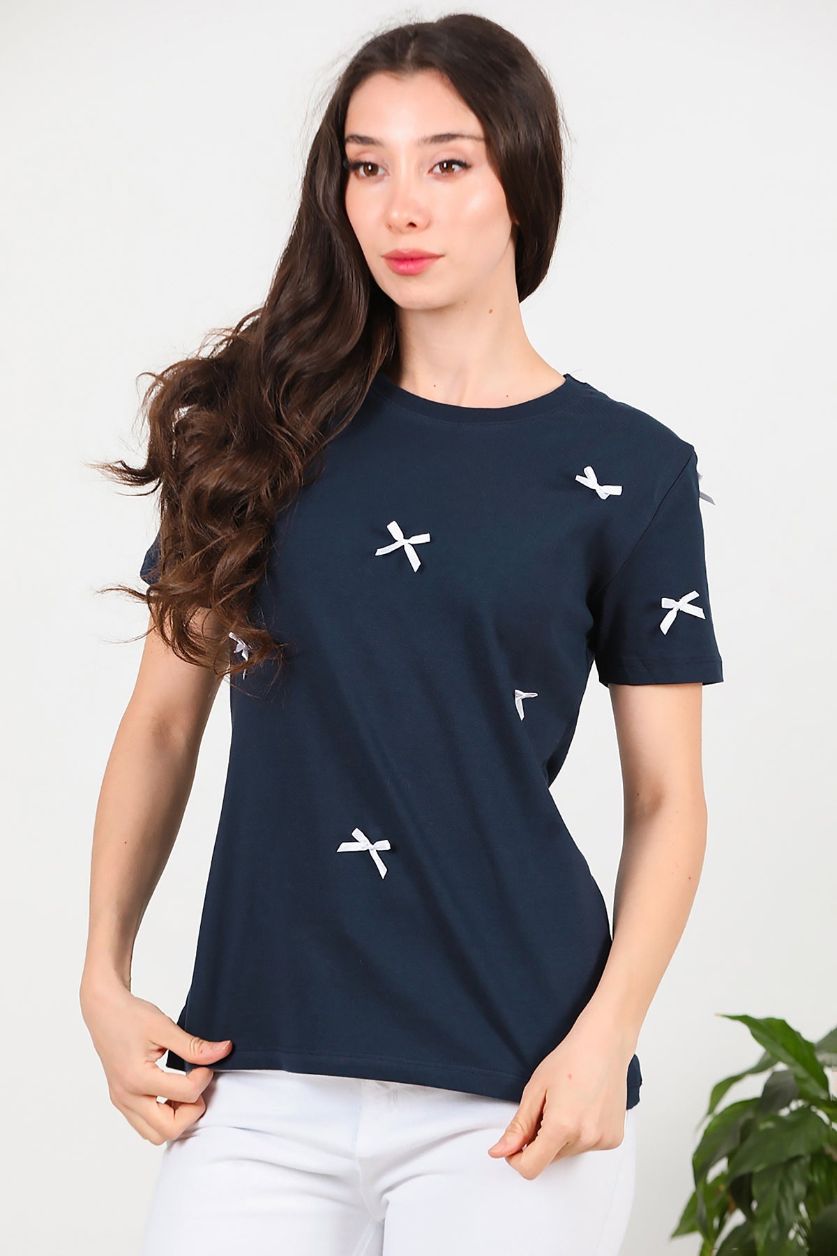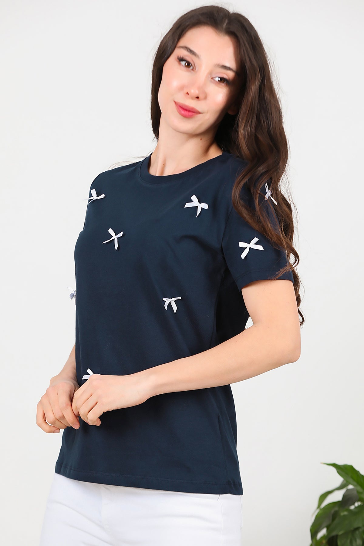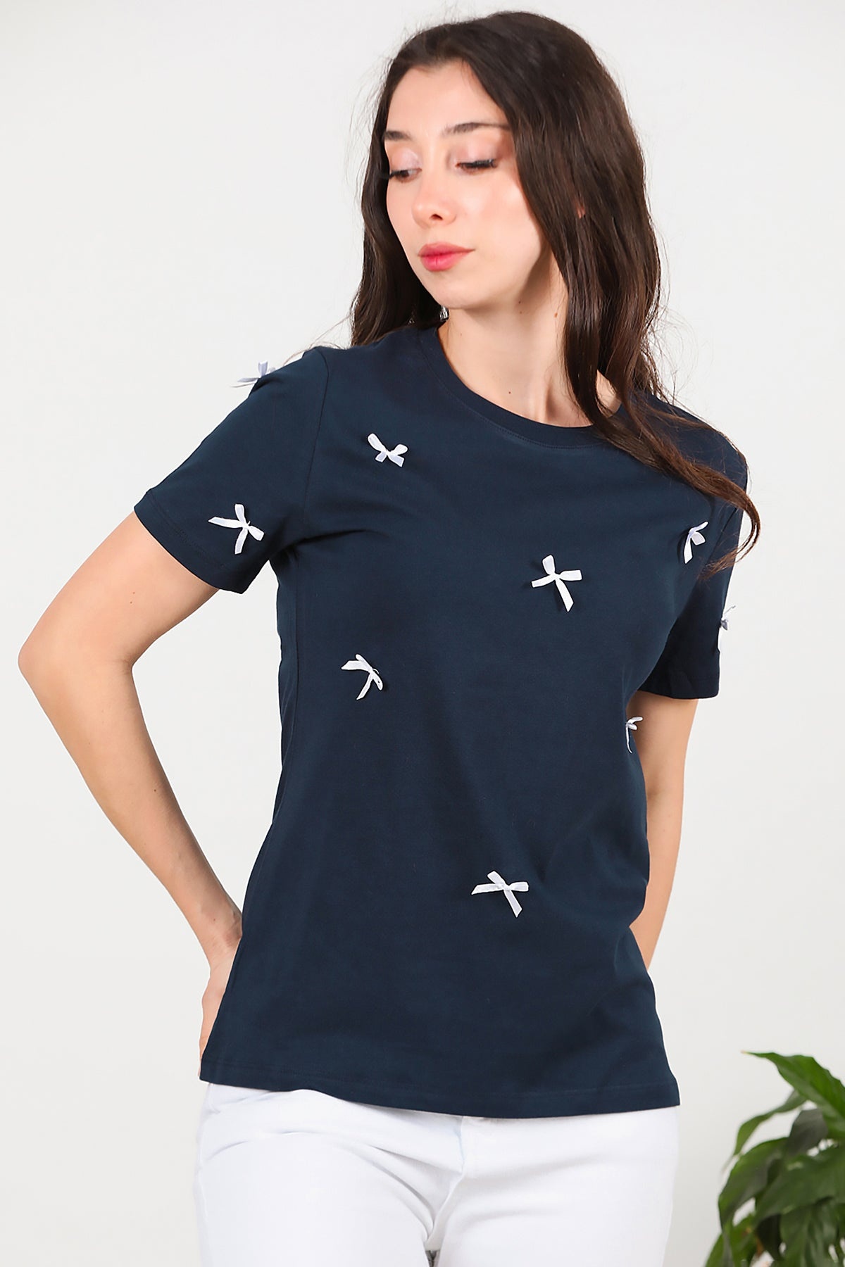 Kadın Bisiklet Yaka Fiyonklu Tshırt Lacivert