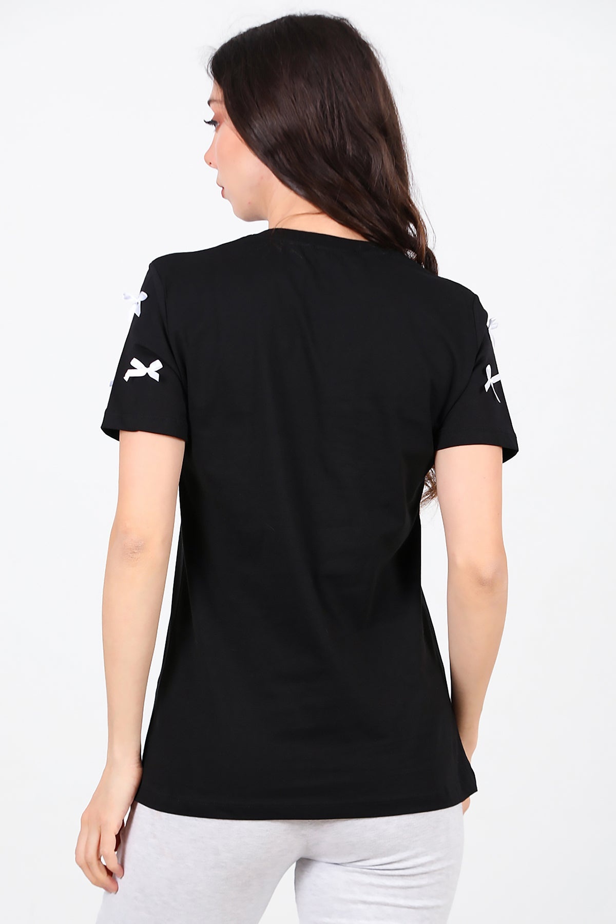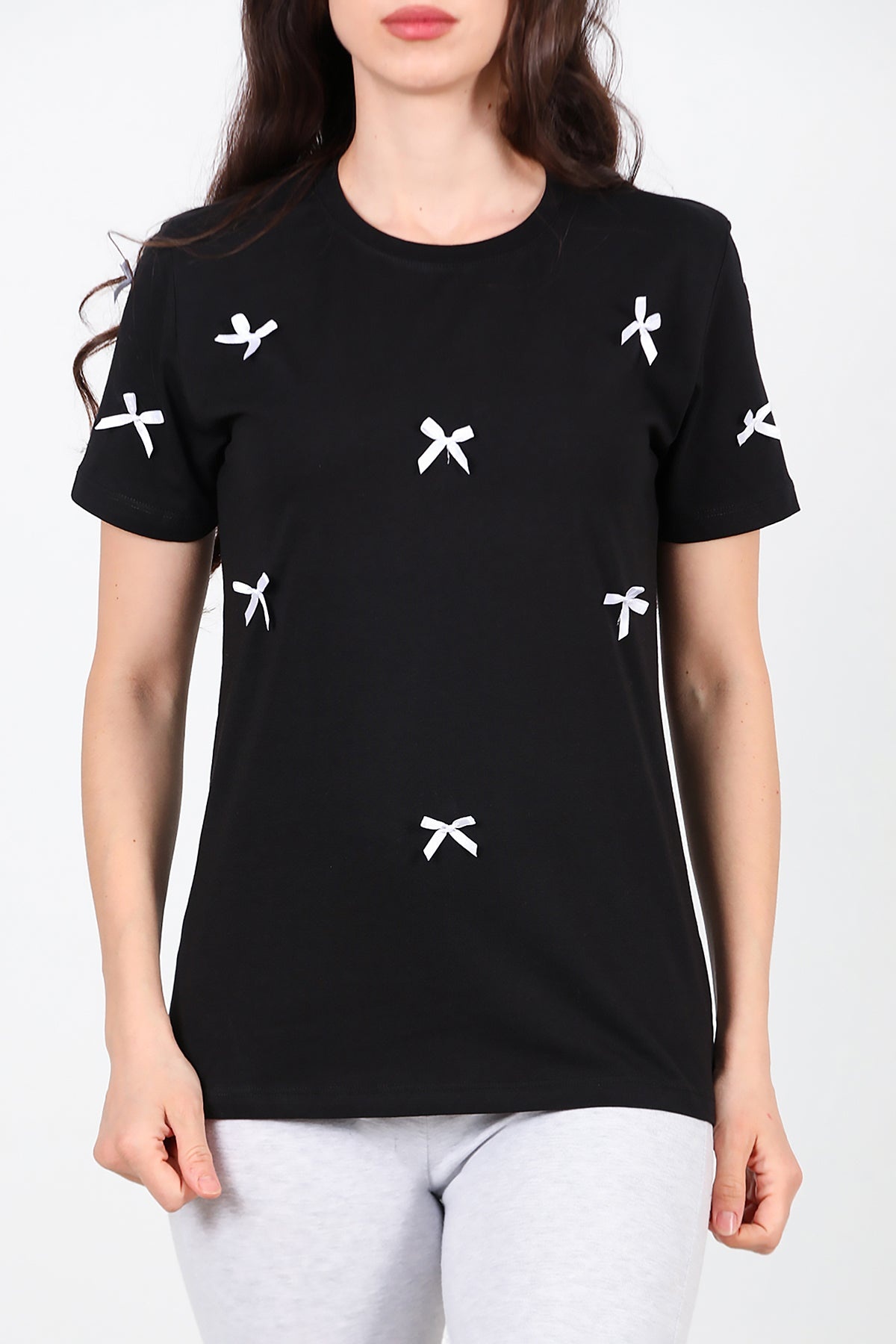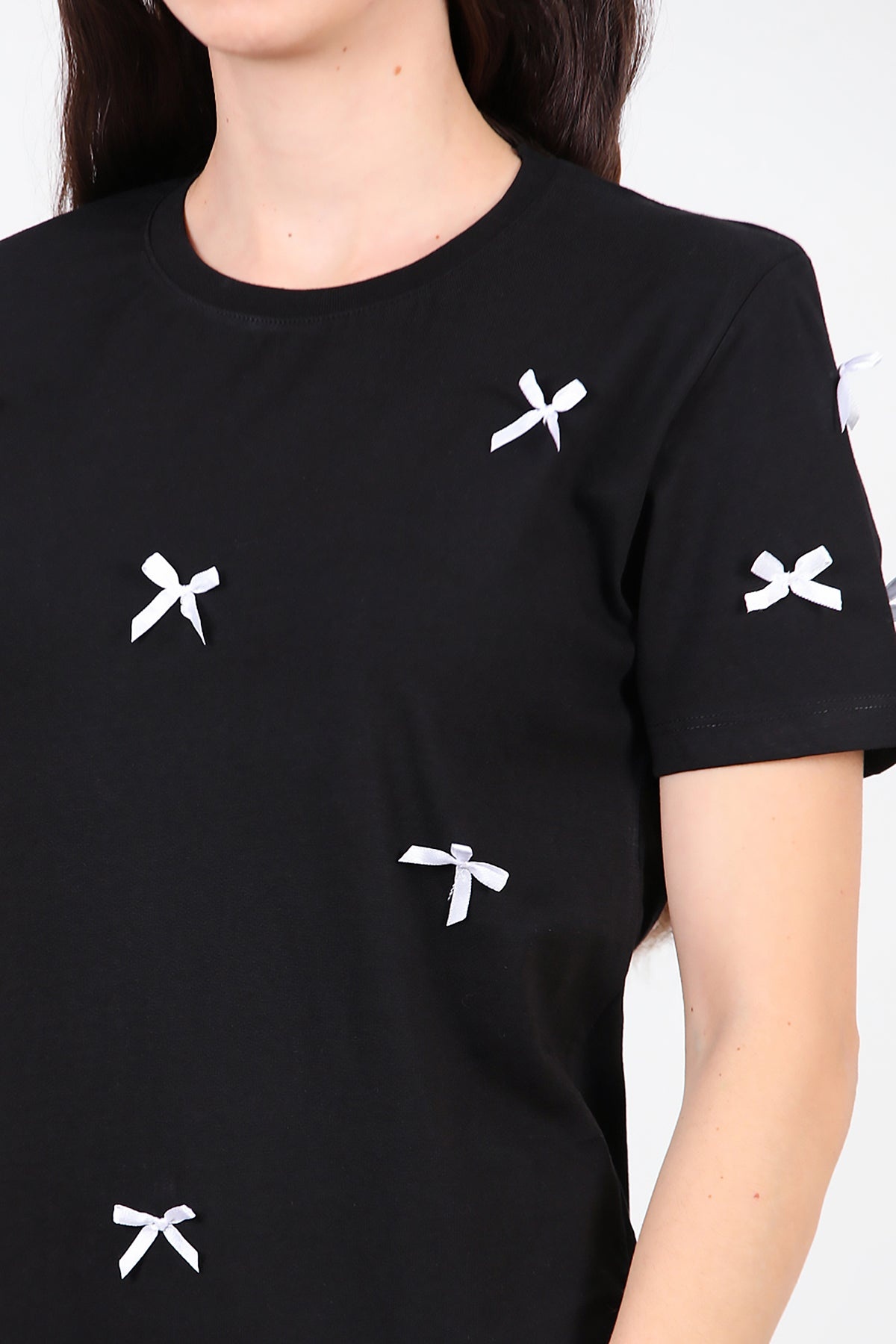 Kadın Bisiklet Yaka Fiyonklu Tshırt Siyah
