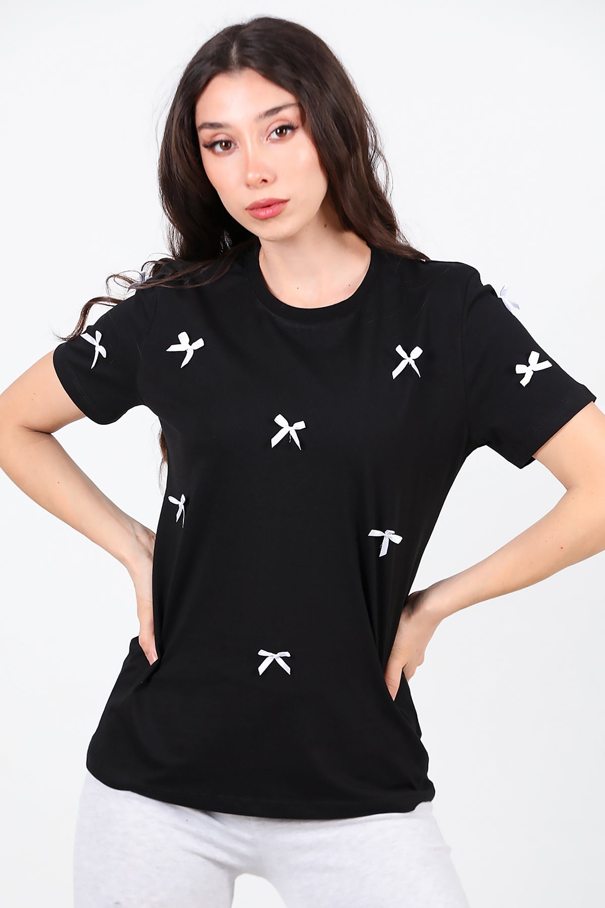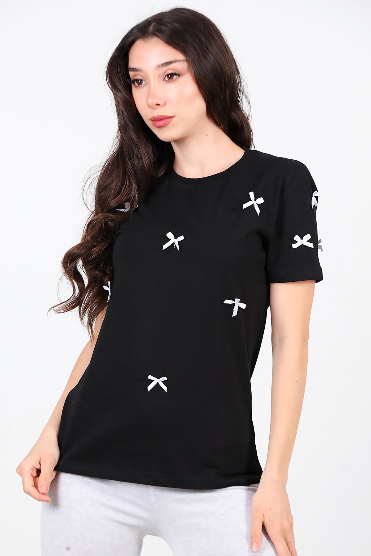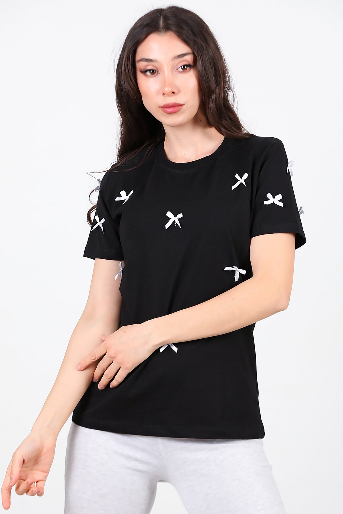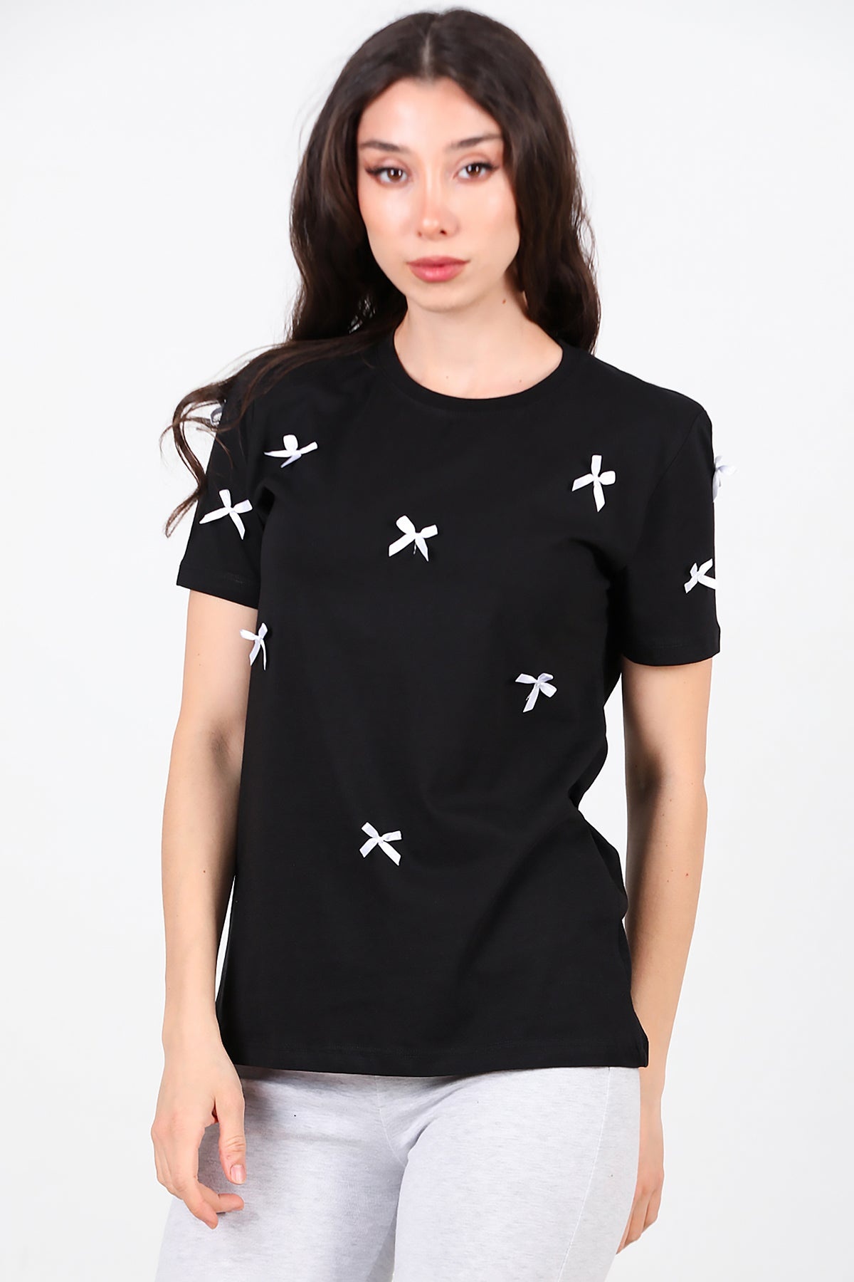 Kadın Bisiklet Yaka Fiyonklu Tshırt Siyah