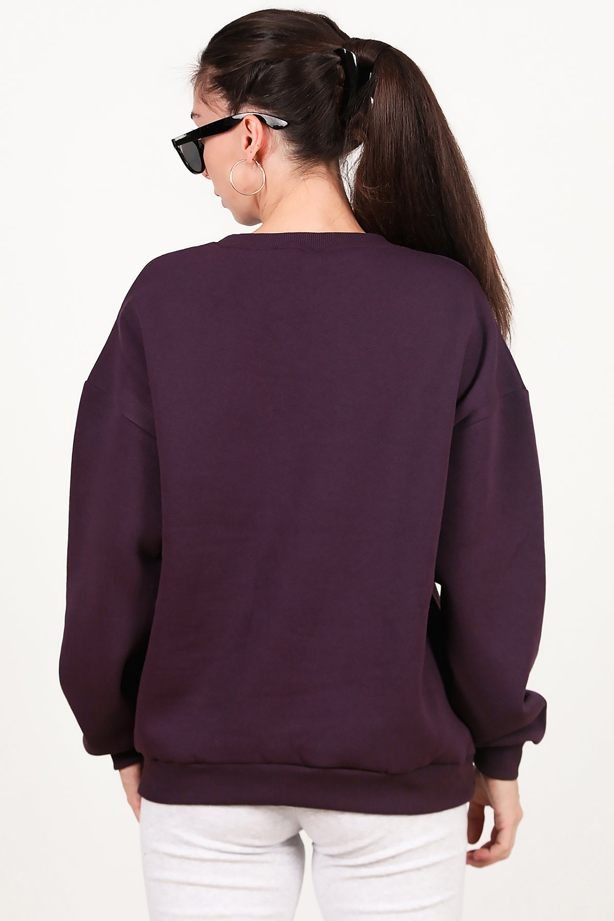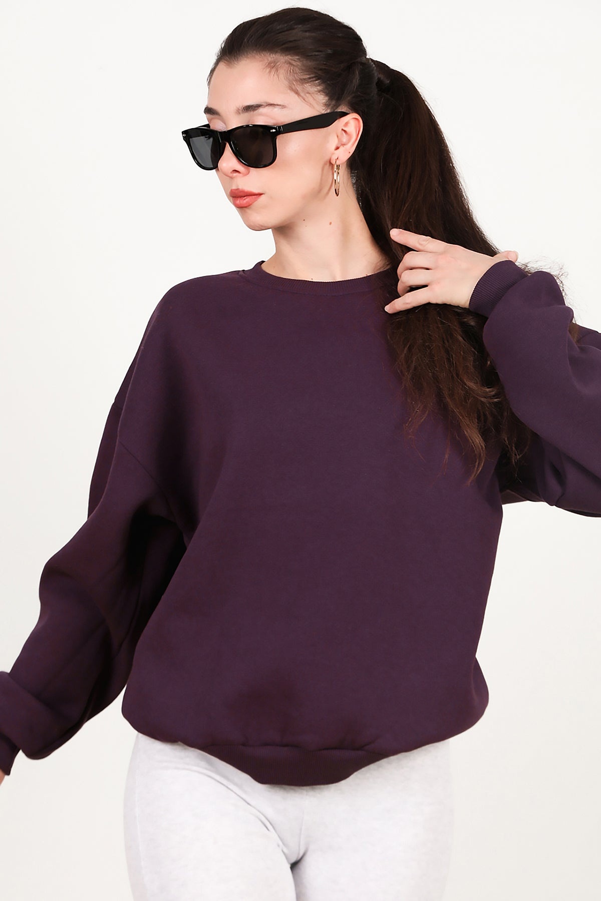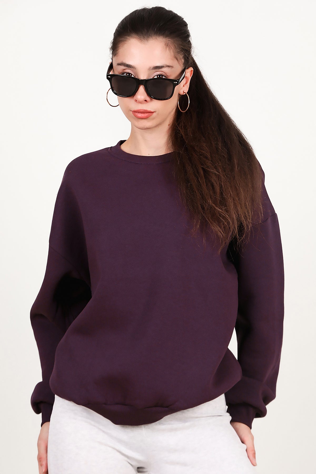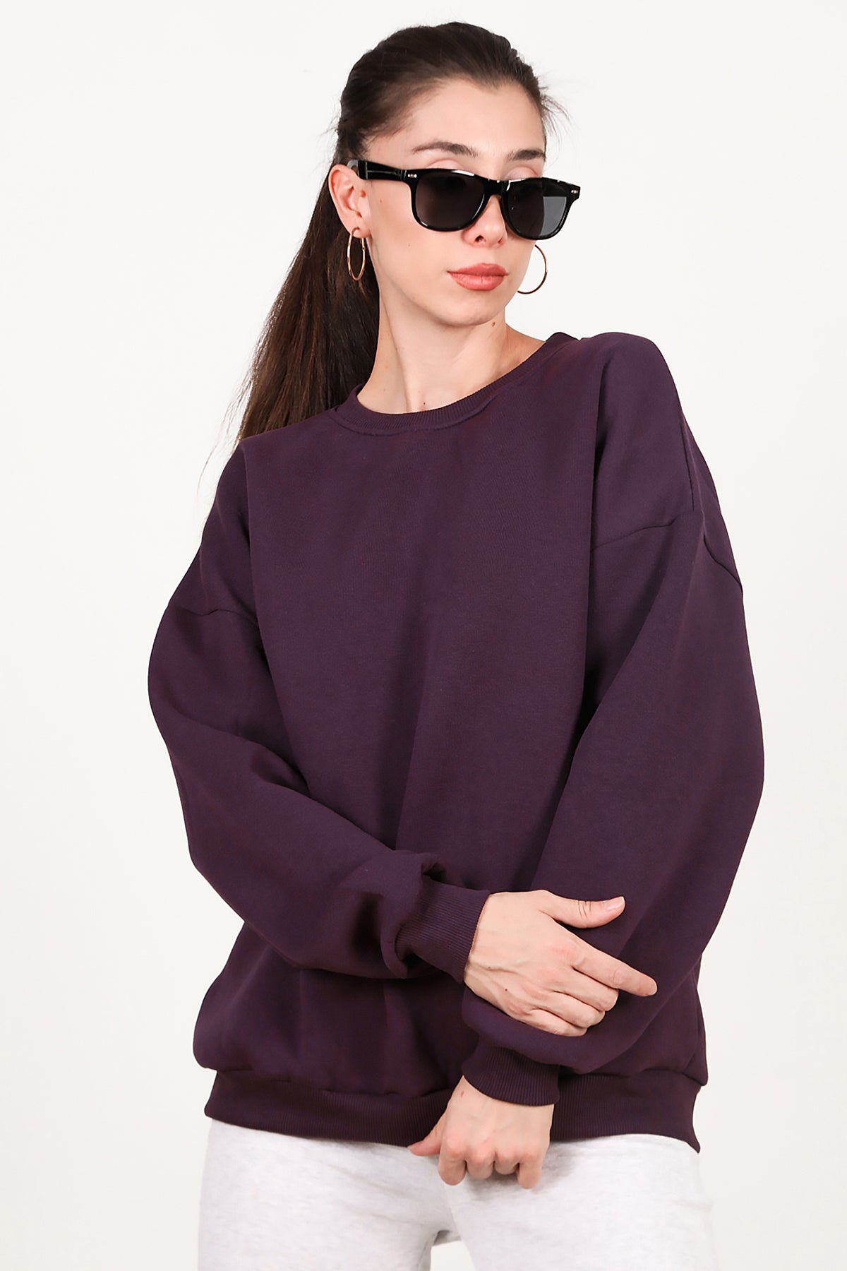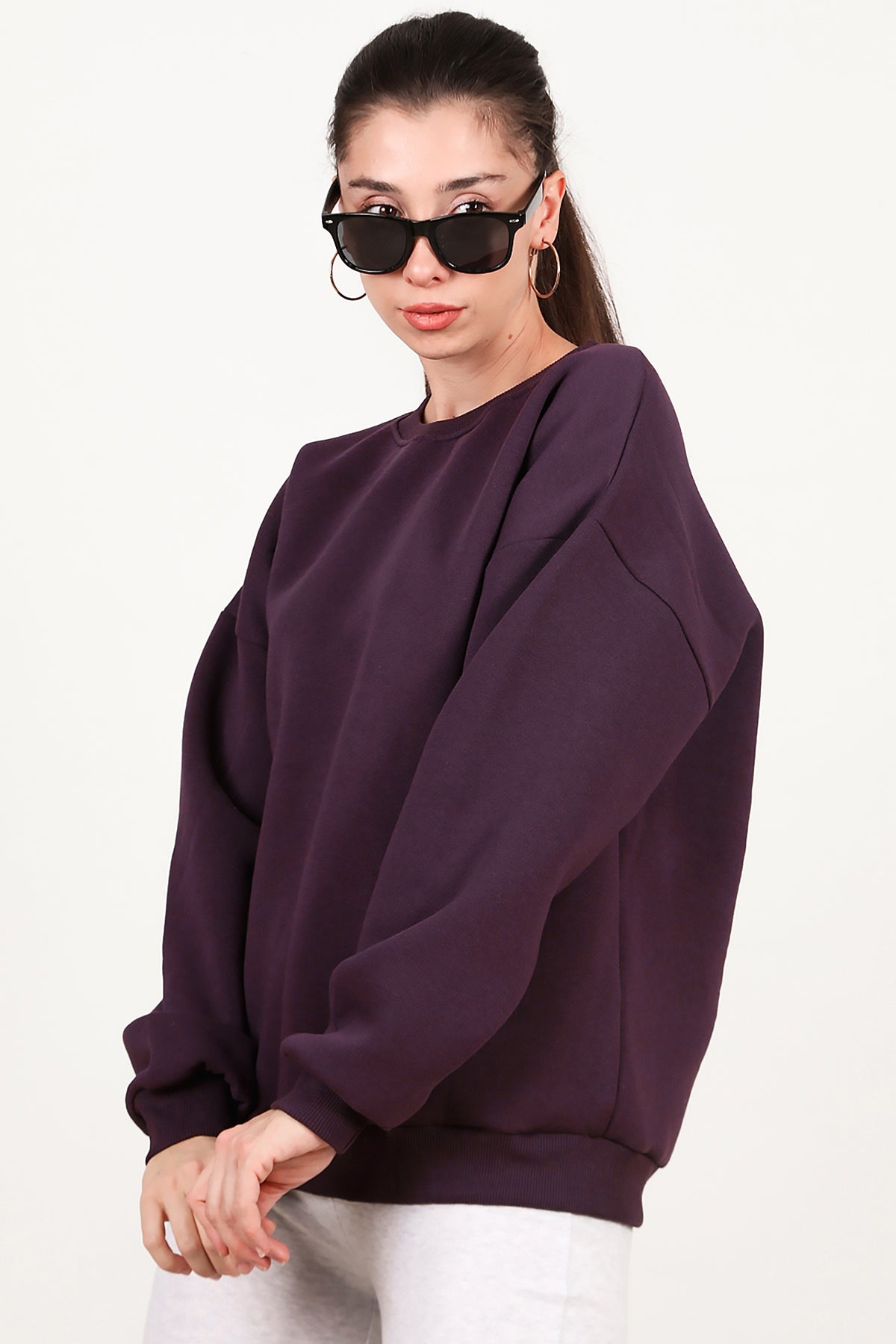Kadın Bisiklet Yaka Üç İplik Oversize Sweat Mor