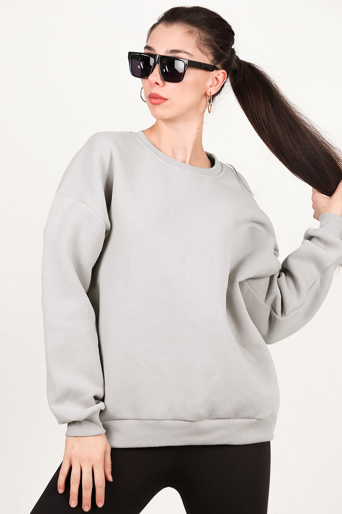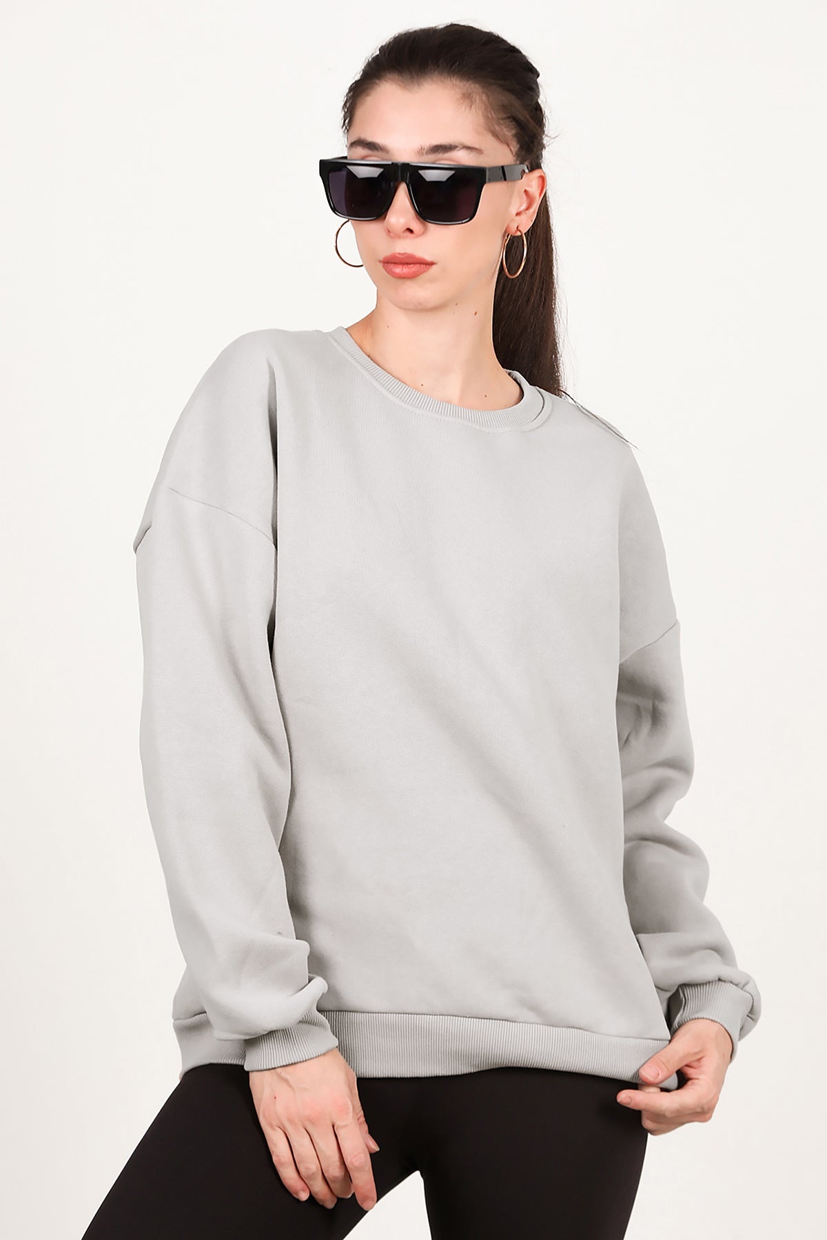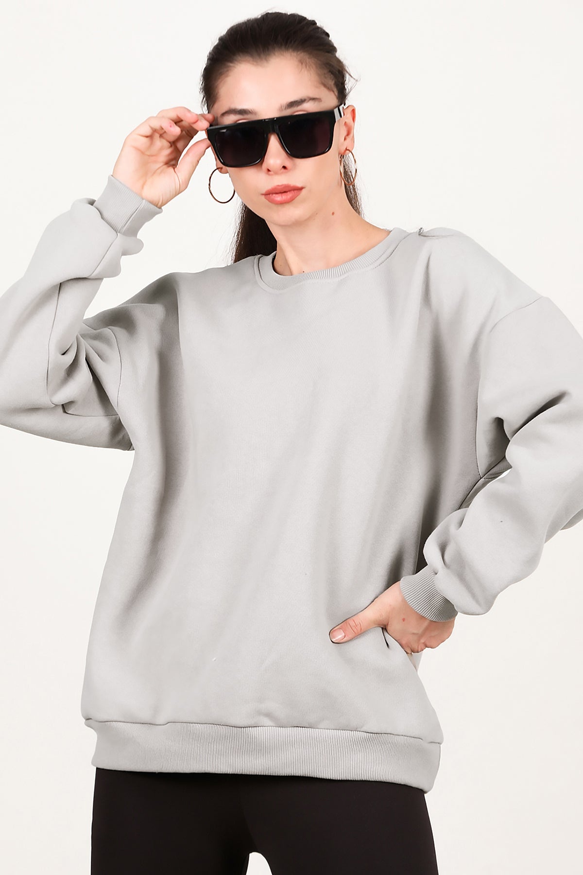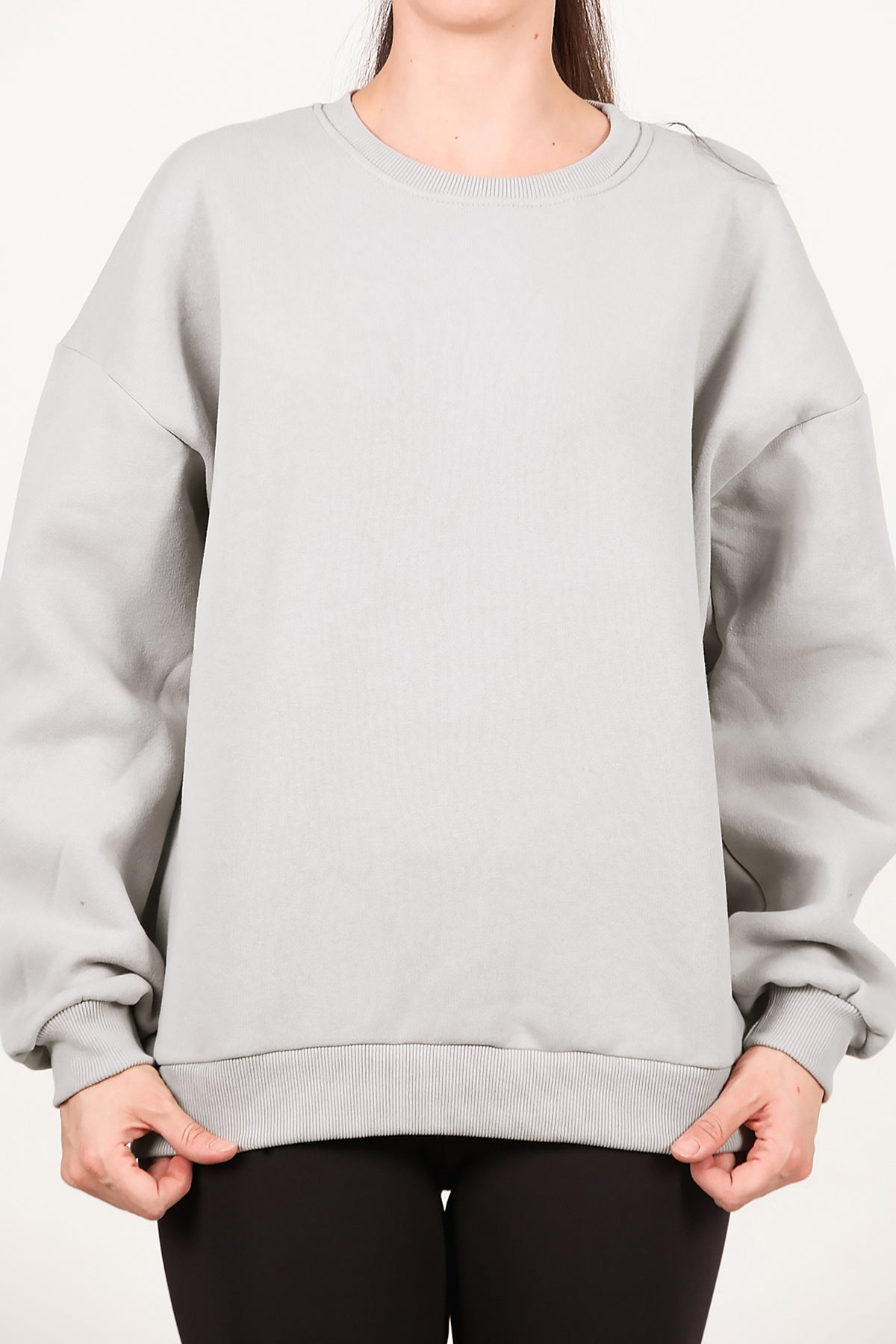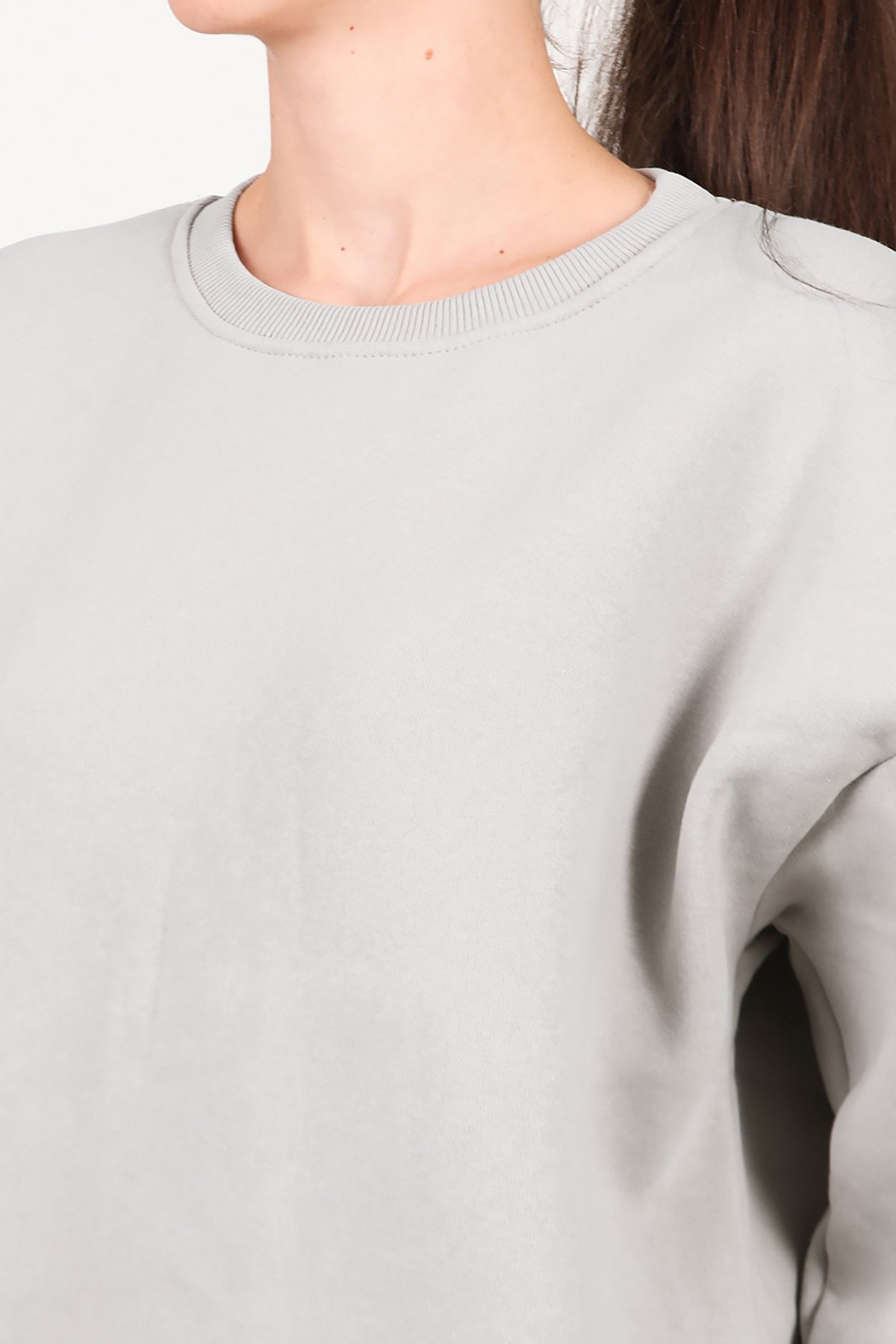 Kadın Bisiklet Yaka Üç İplik Oversize Sweat Vizon