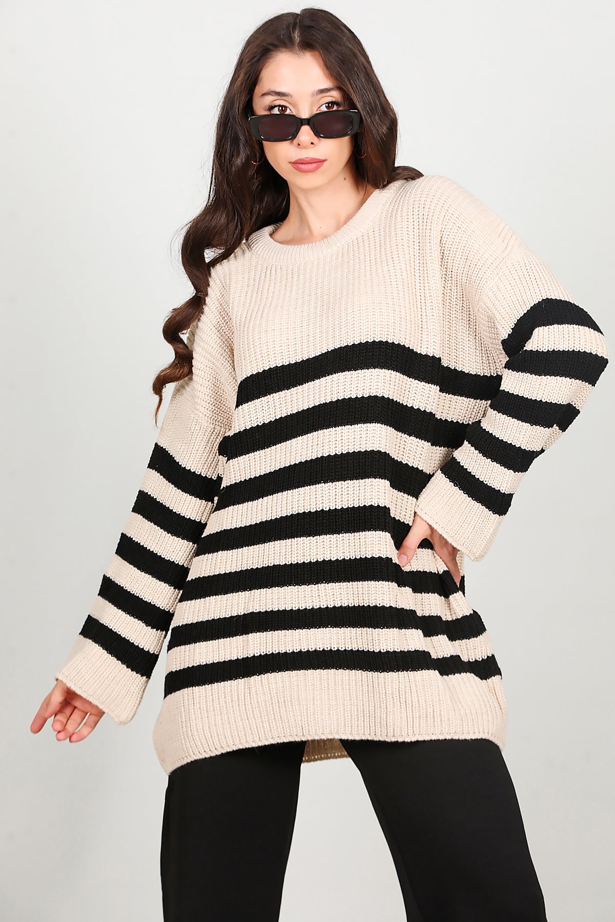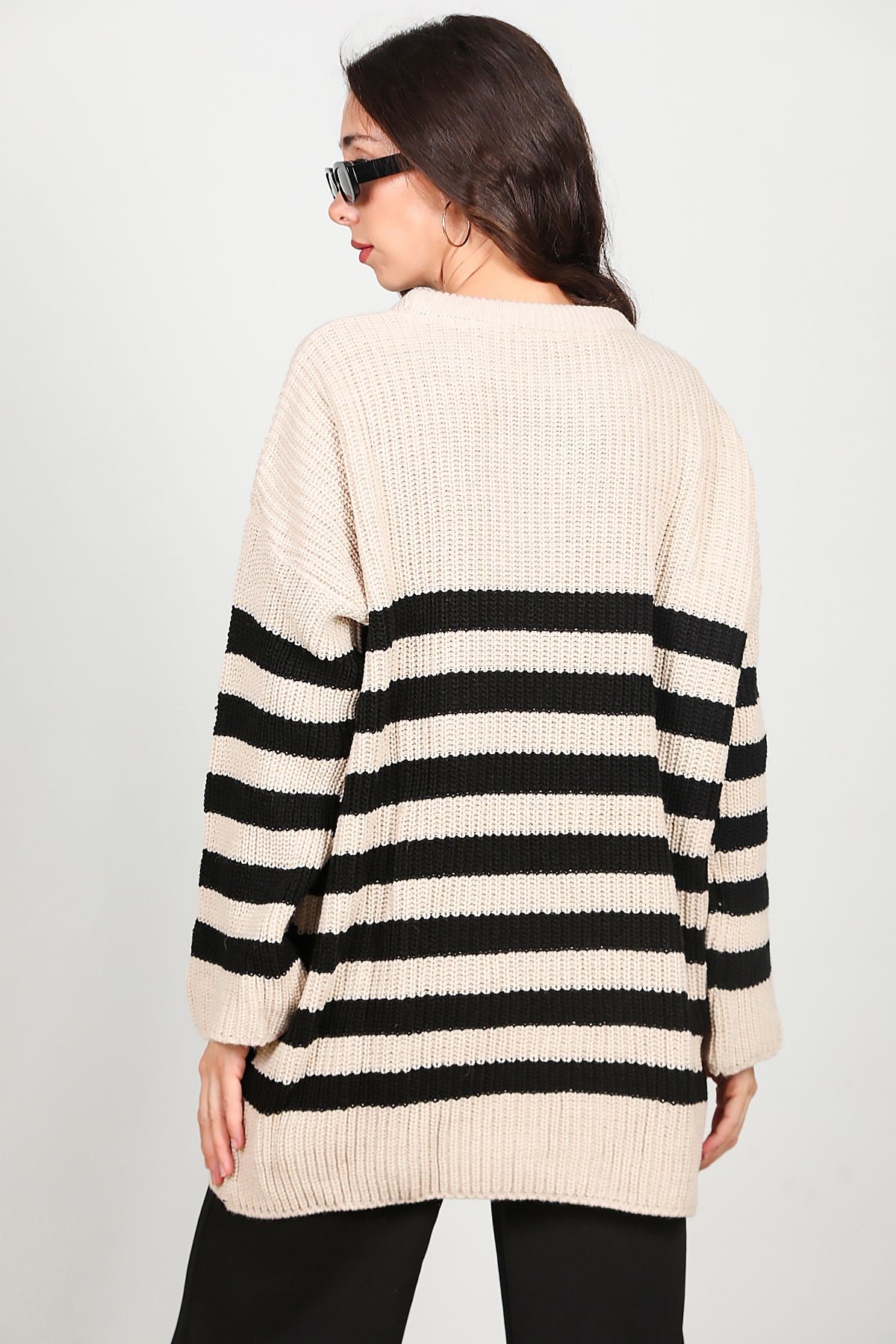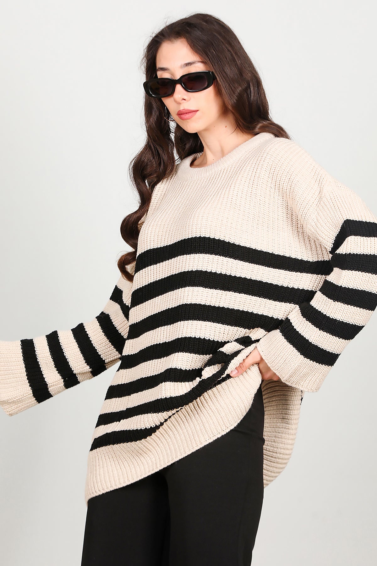 Kadın Çizgili Triko Kazak Krem