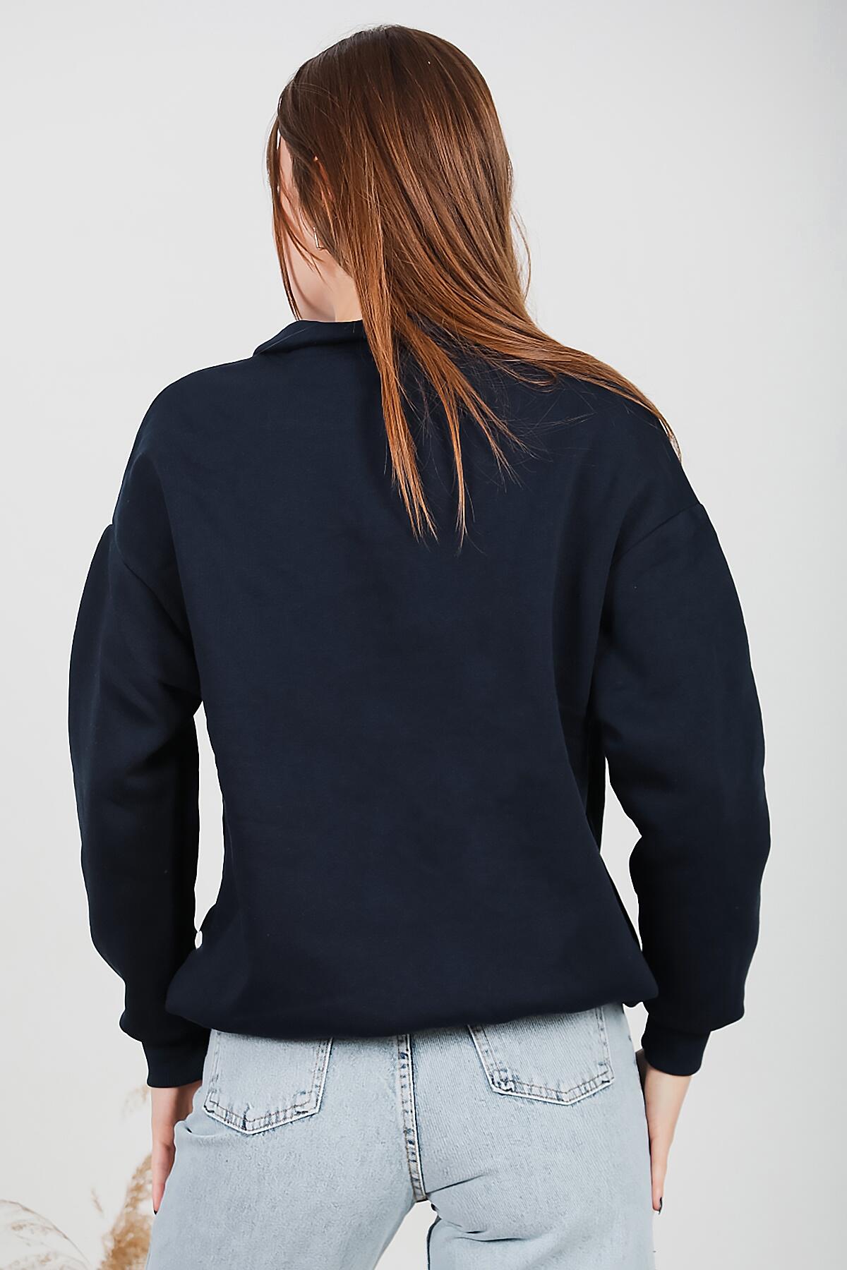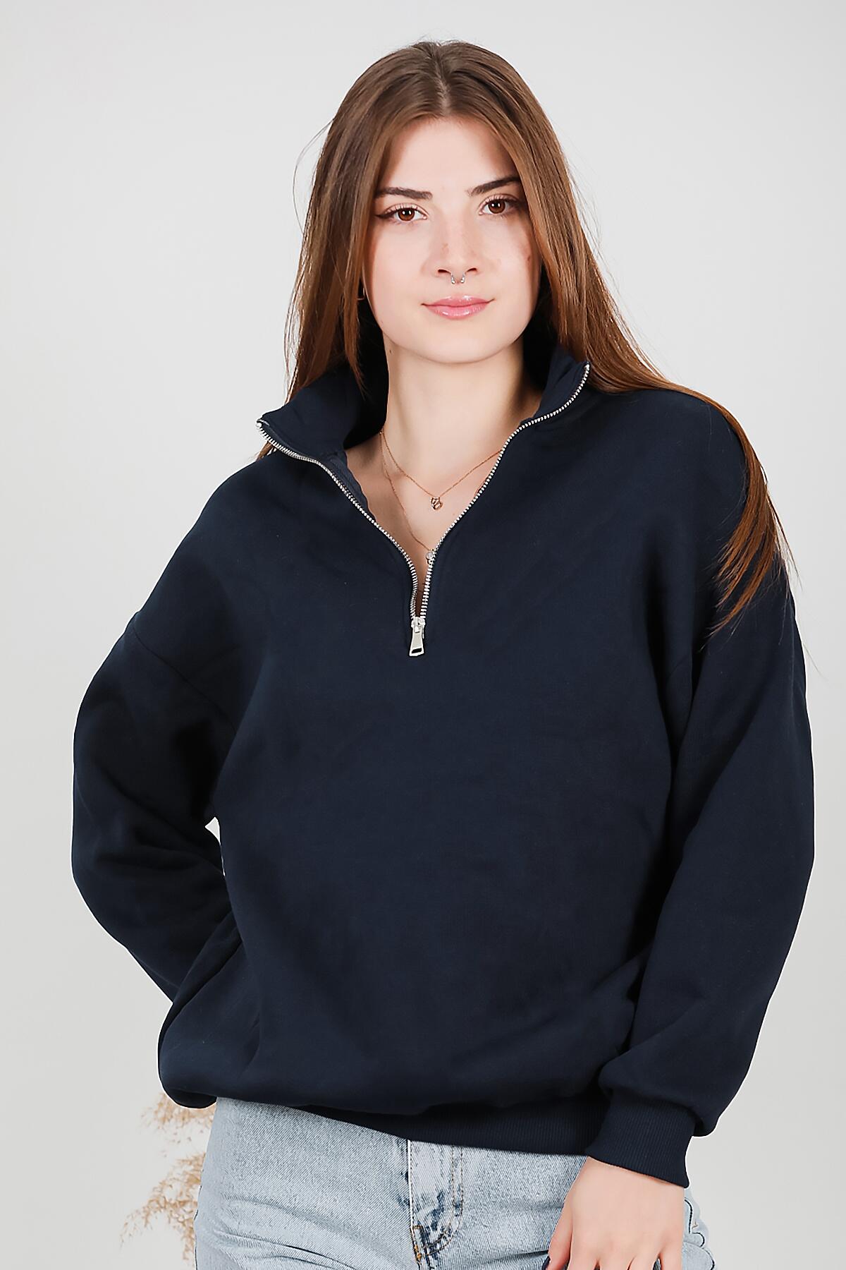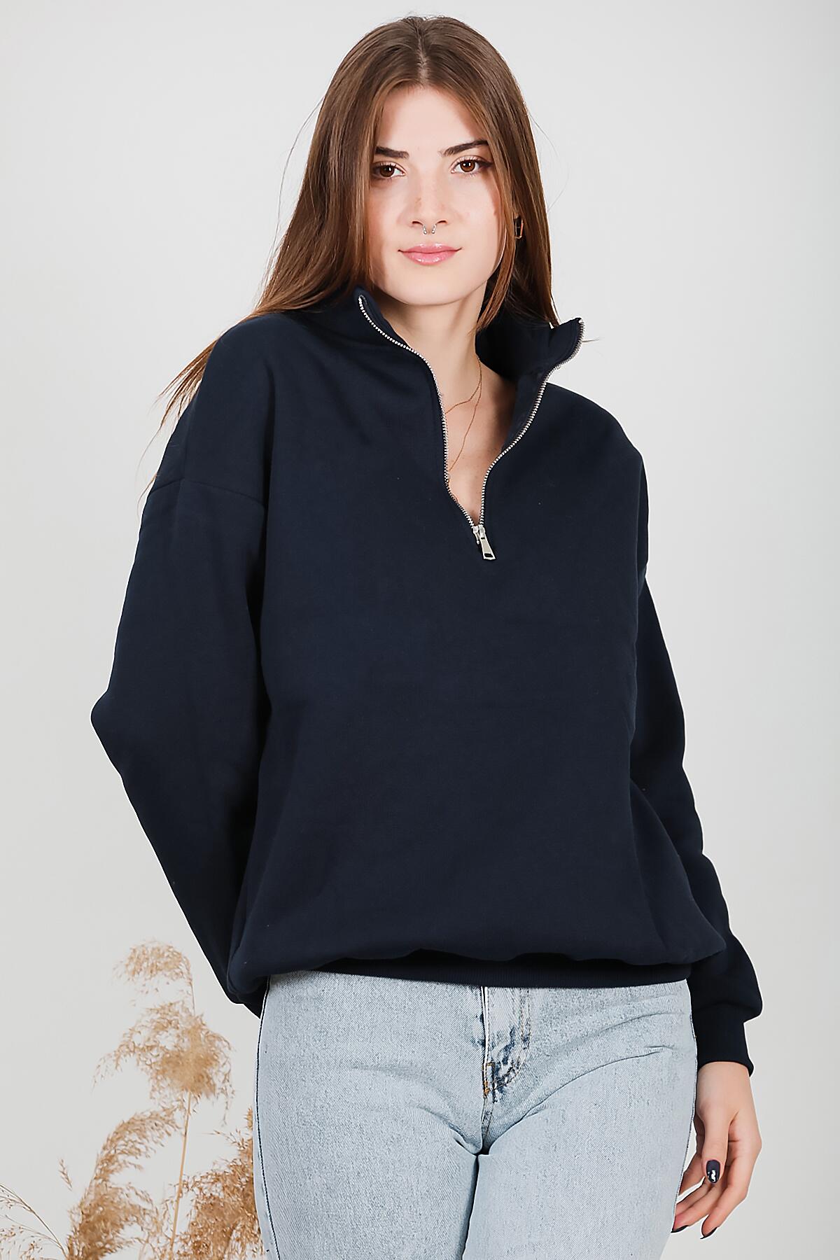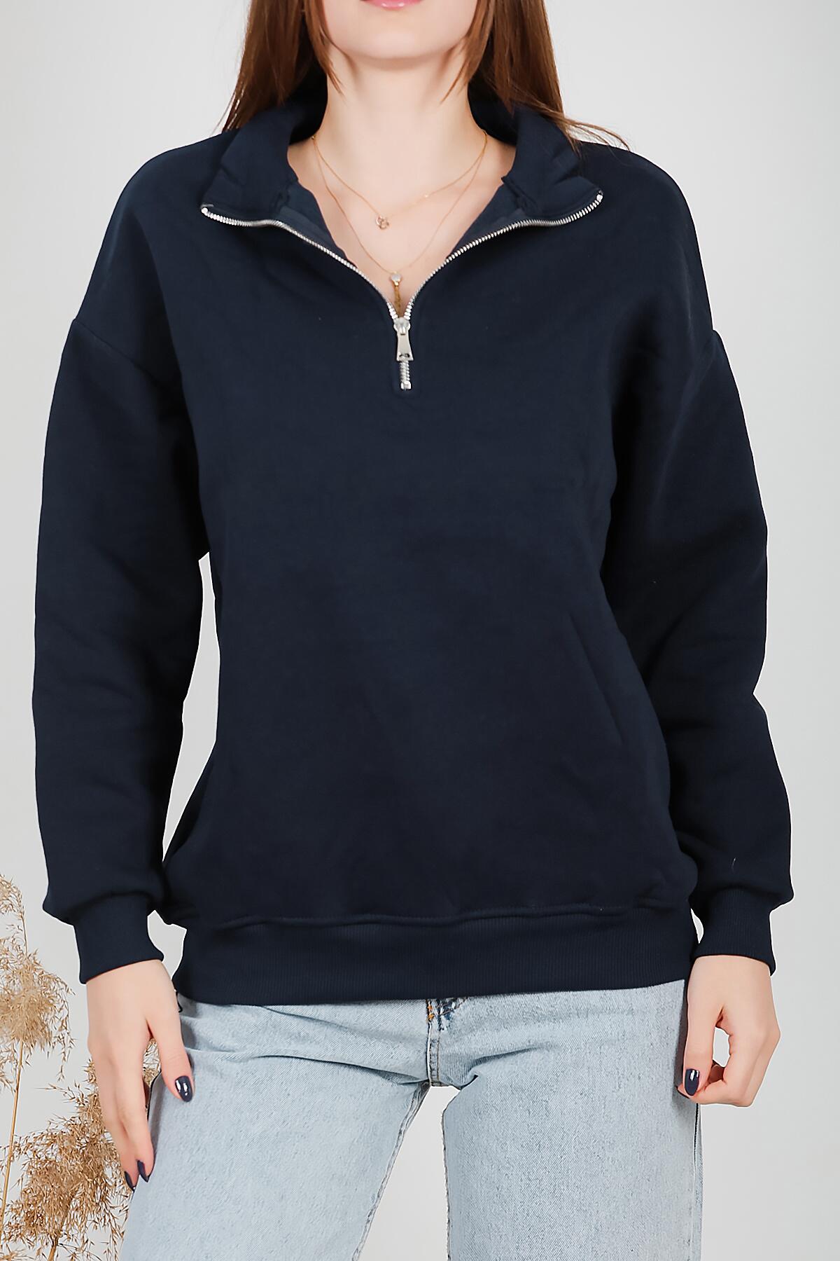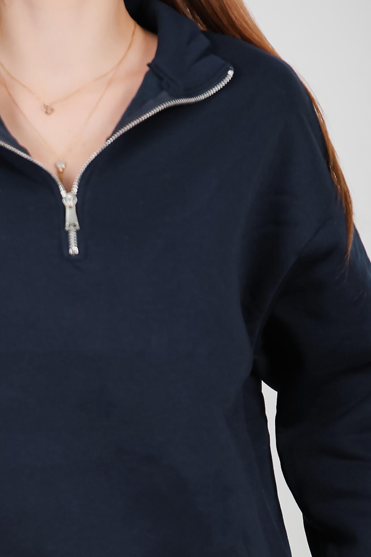 Kadın Fermuarlı Üç İplik Sweat Lacivert