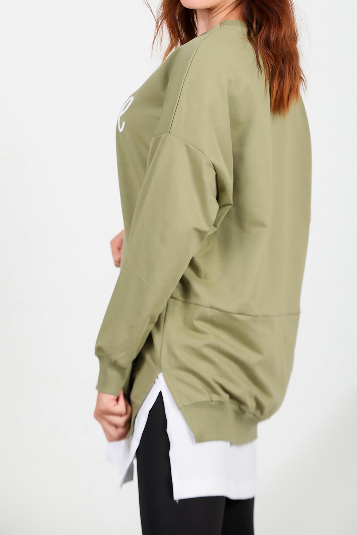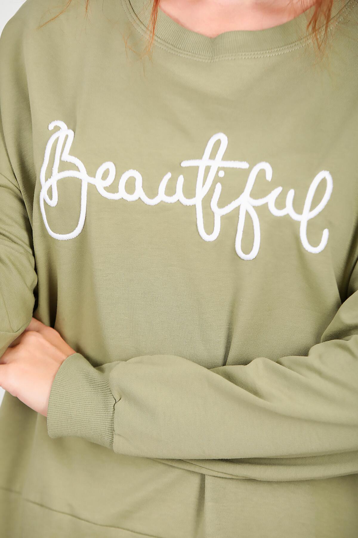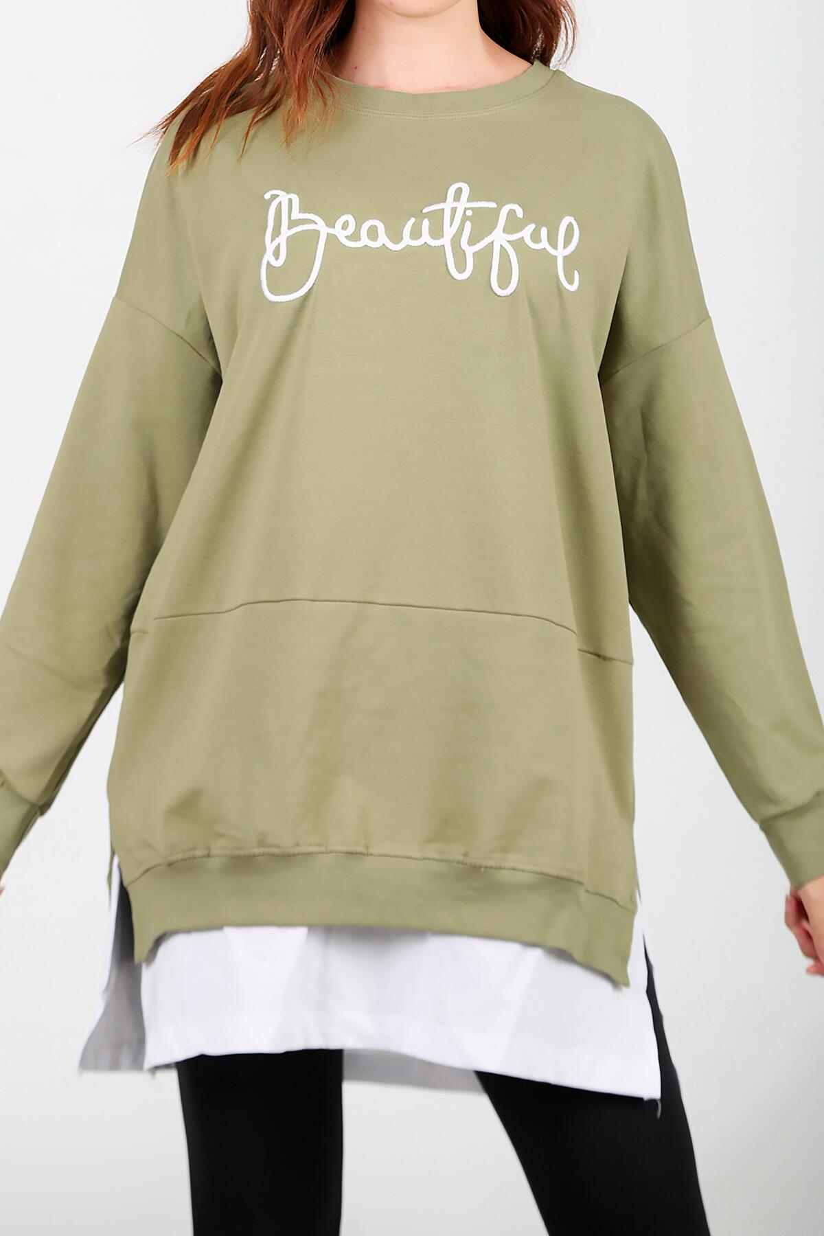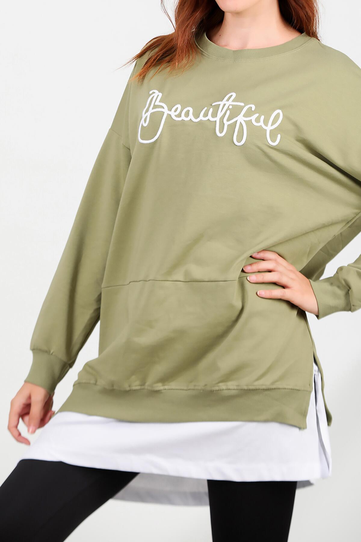 Kadın İki İplik Nakış Garnili Tunik Yeşil