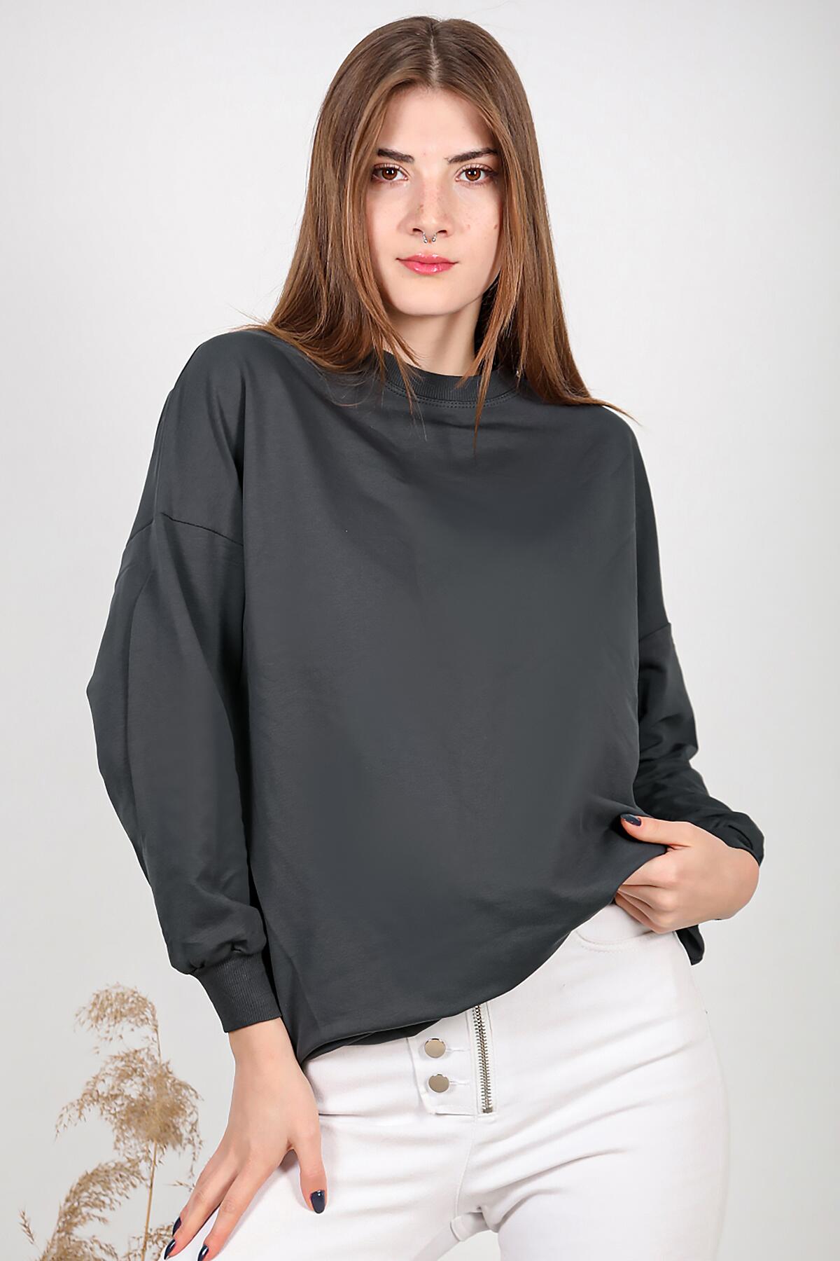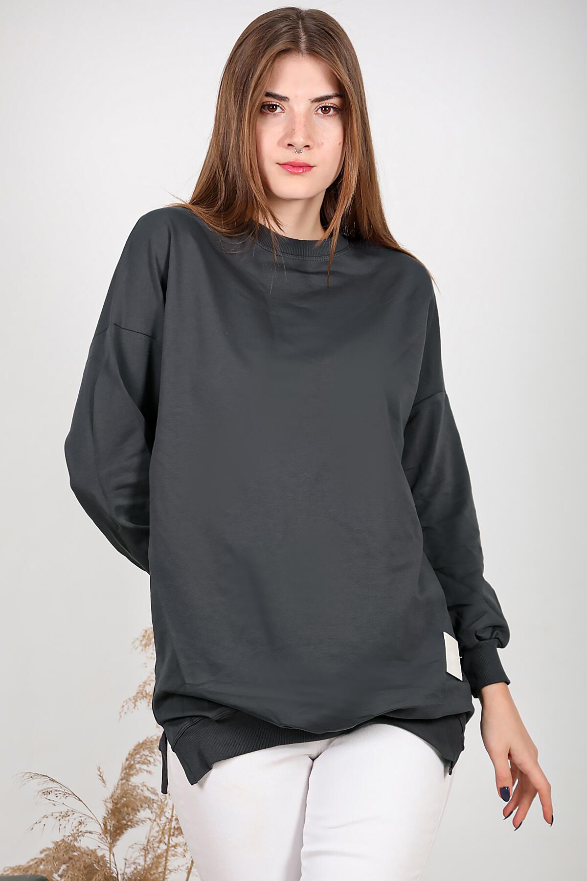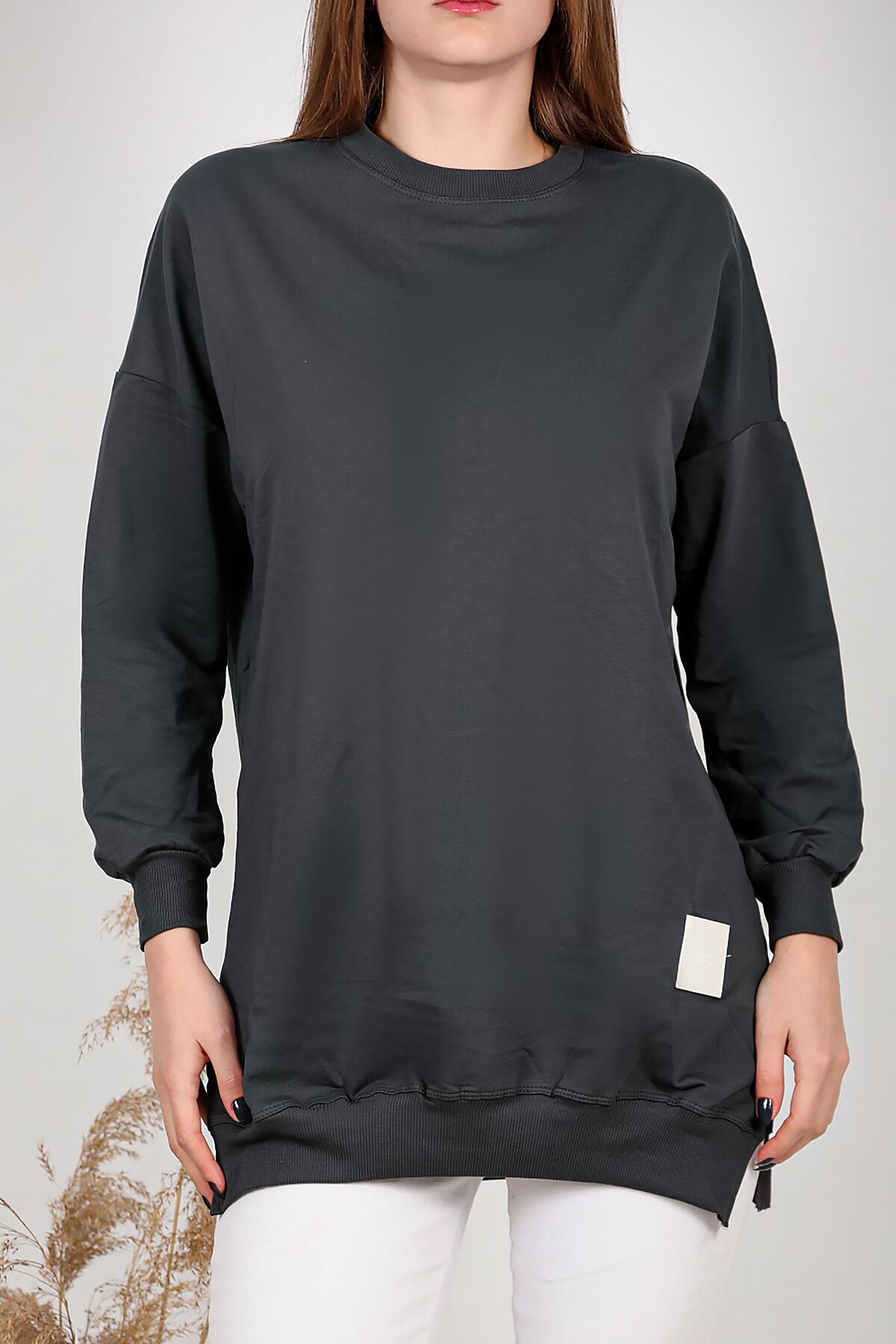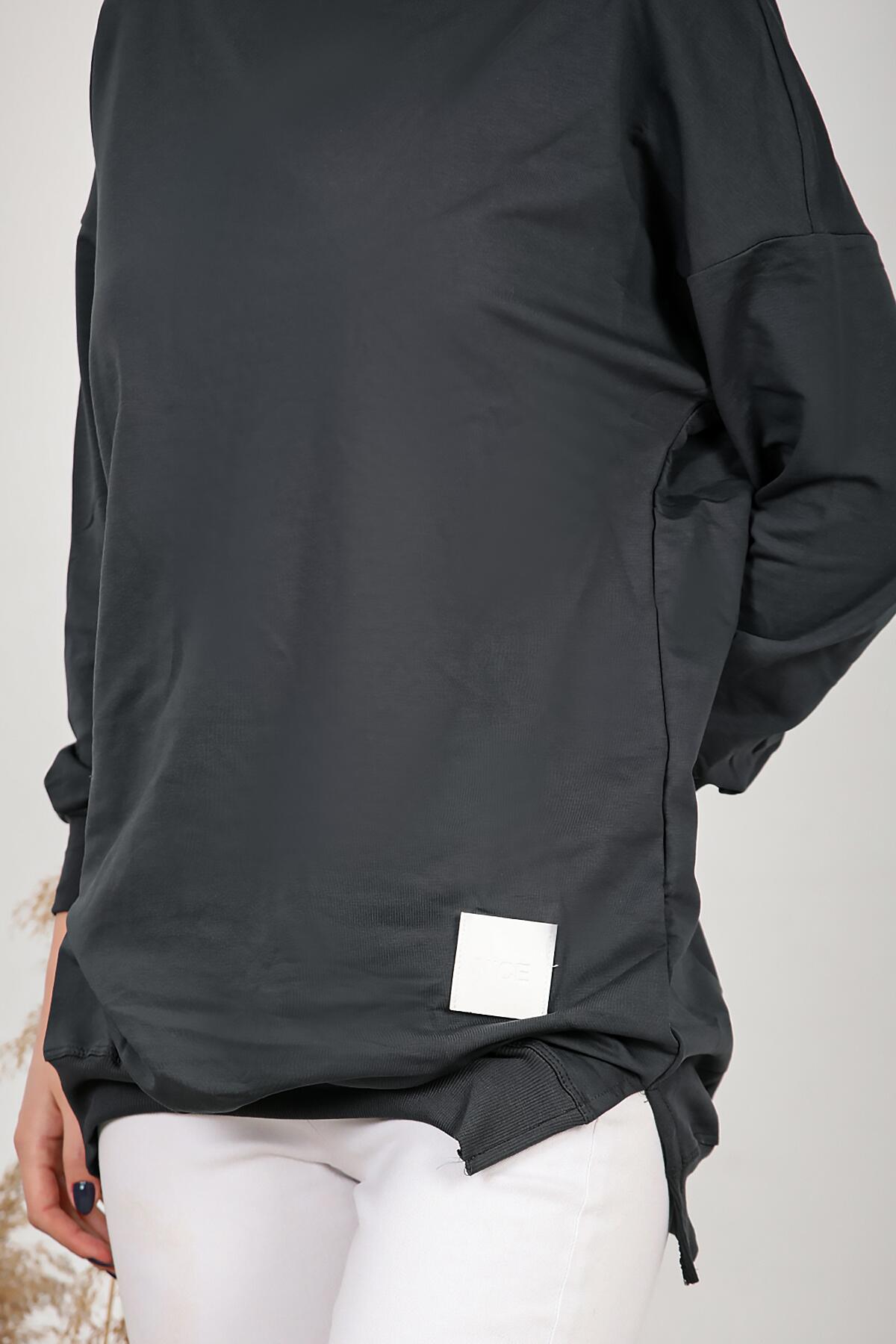 Kadın İki İplik Sıfır Yaka Armalı Tunik Füme