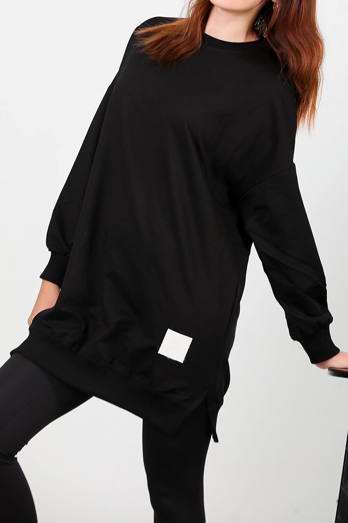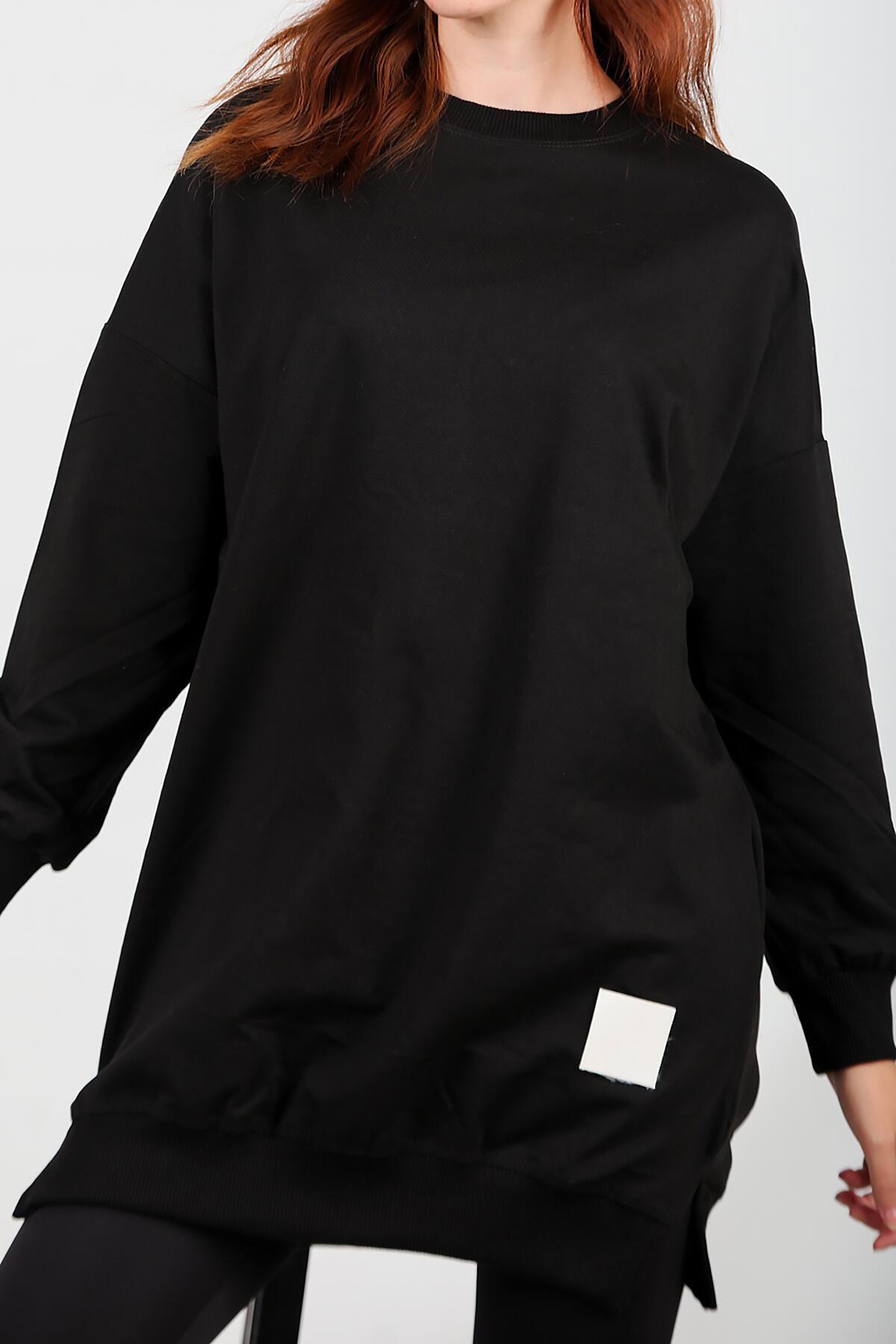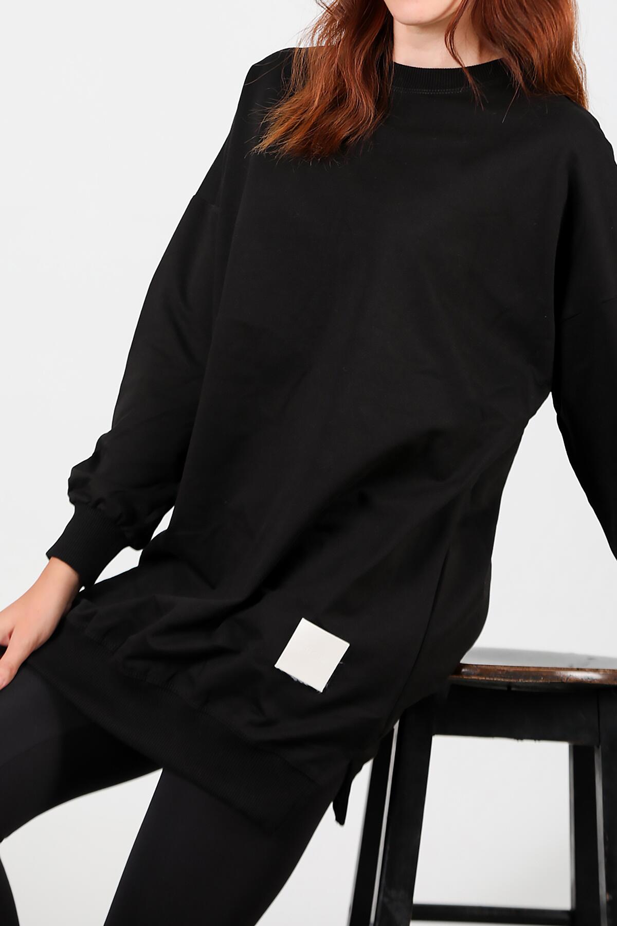 Kadın İki İplik Sıfır Yaka Armalı Tunik Siyah
