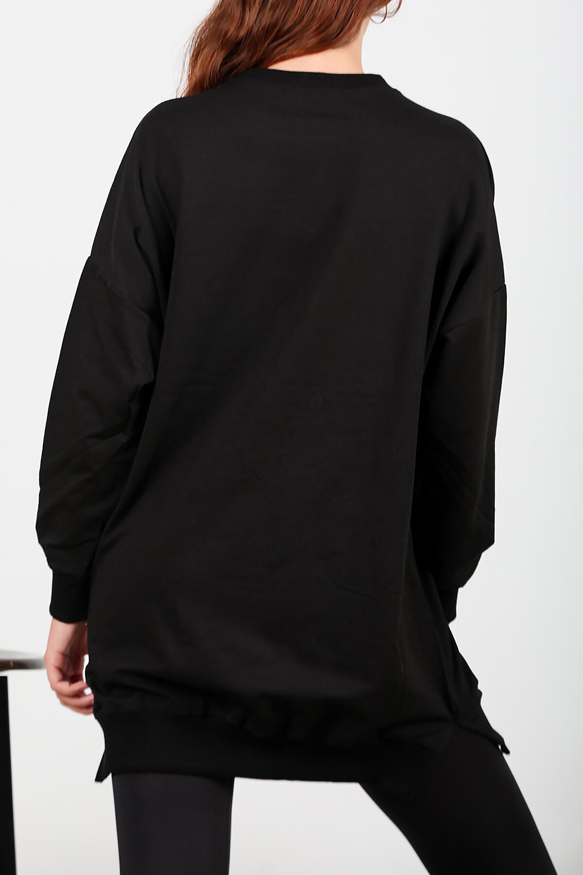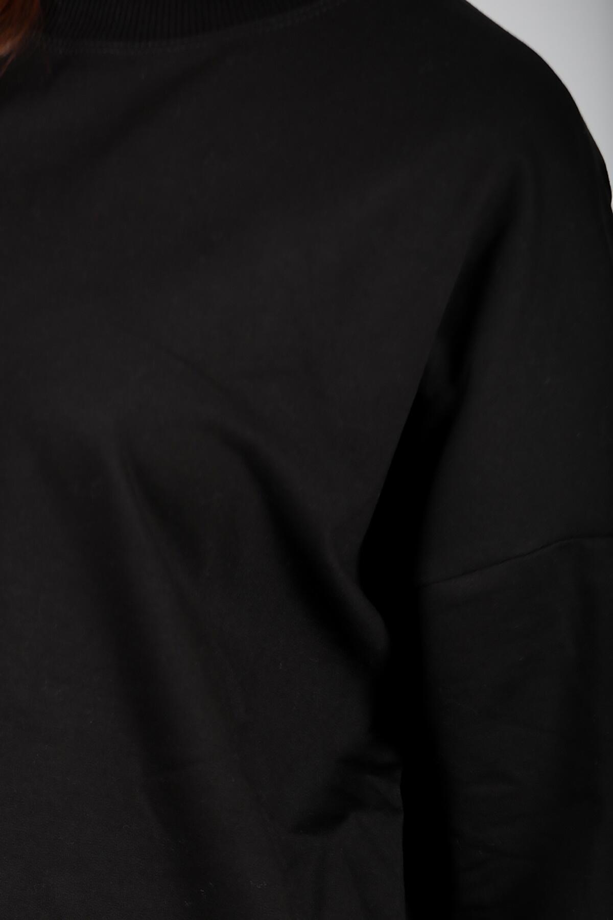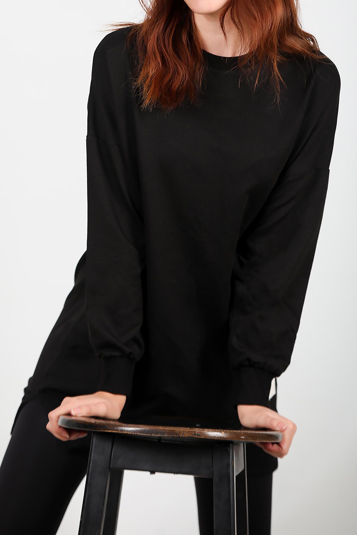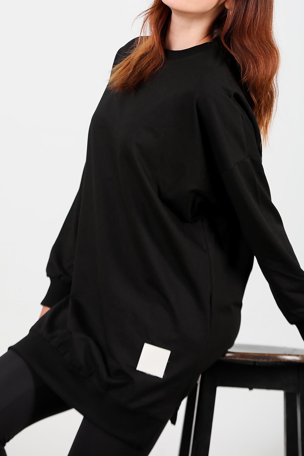 Kadın İki İplik Sıfır Yaka Armalı Tunik Siyah