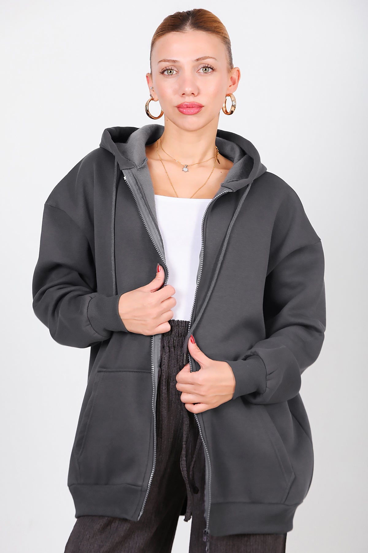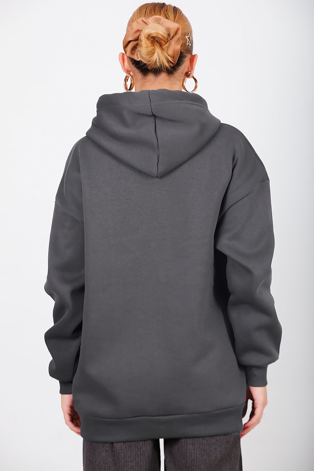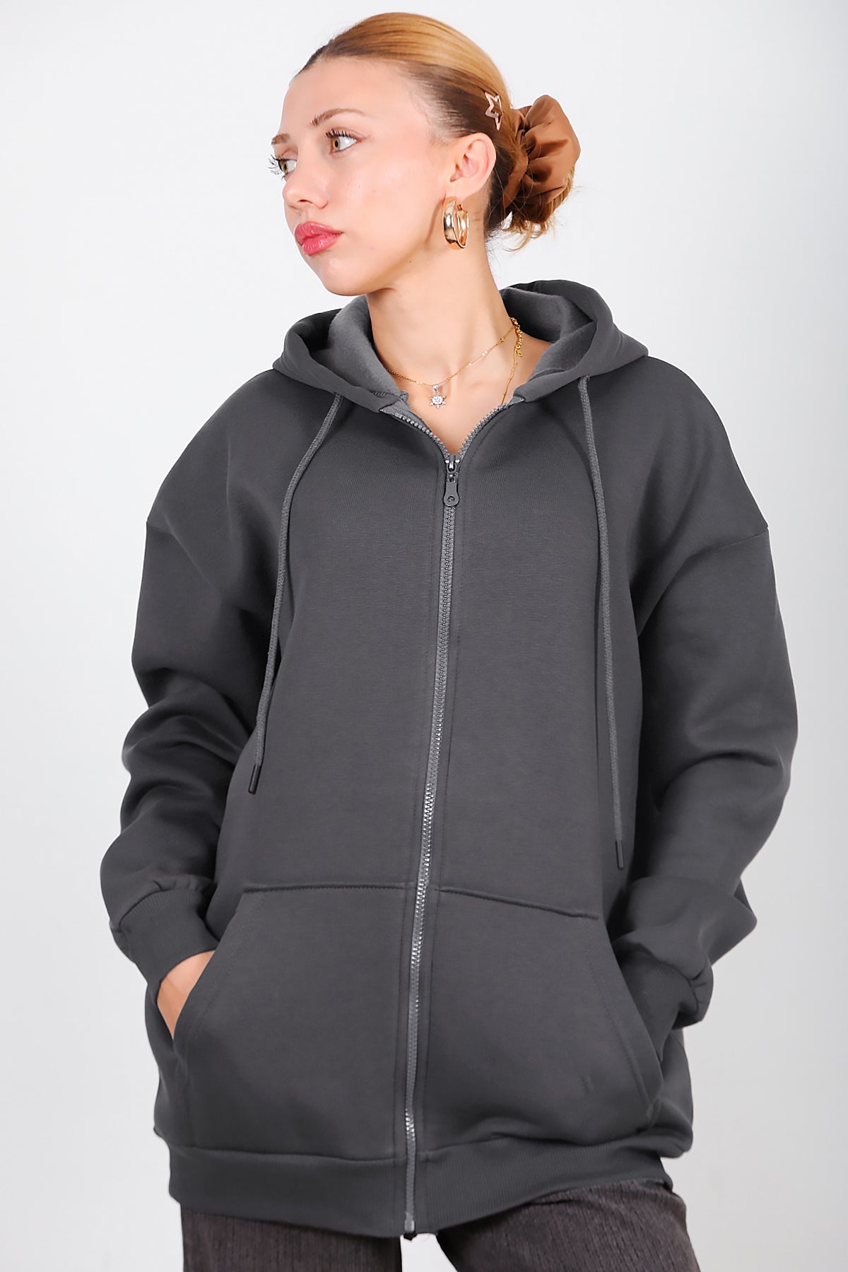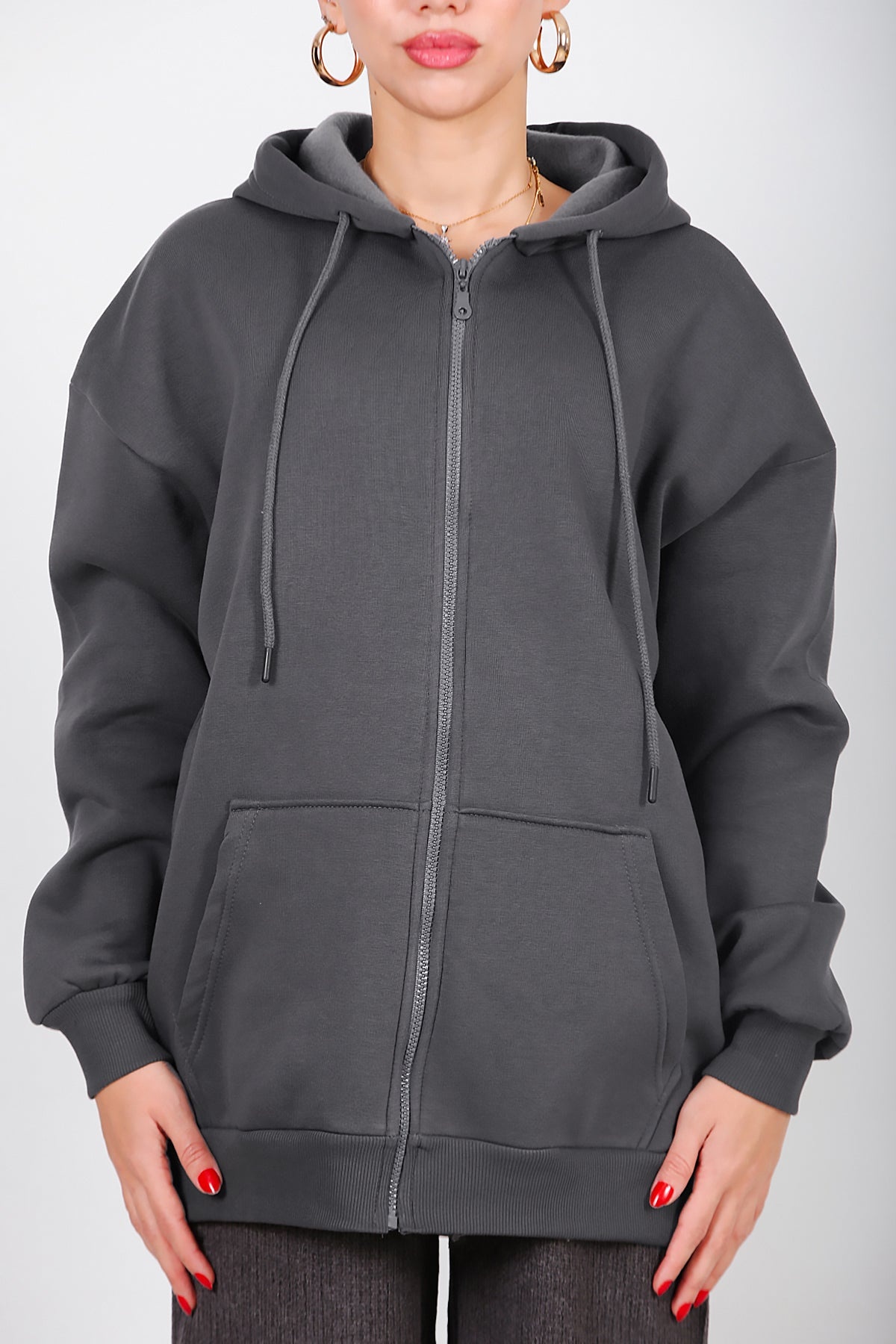 Kadın Kapşonlu Fermuarlı Oversize Üç İplik Sweat Füme Füme