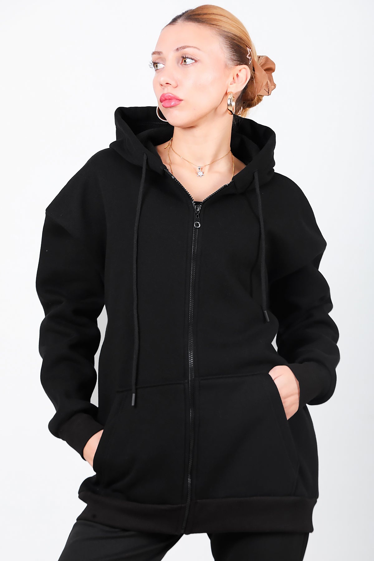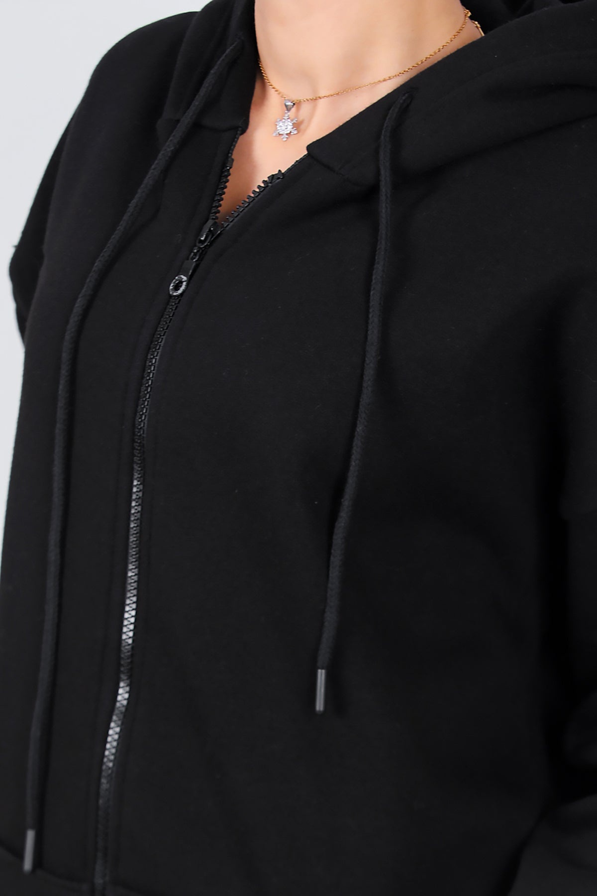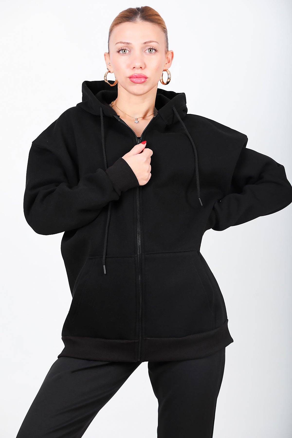 Kadın Kapşonlu Fermuarlı Oversize Üç İplik Sweat Siyah Siyah